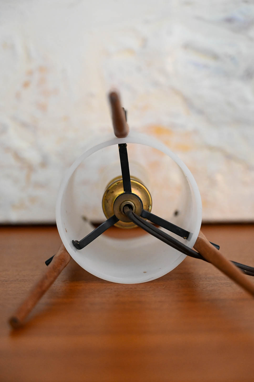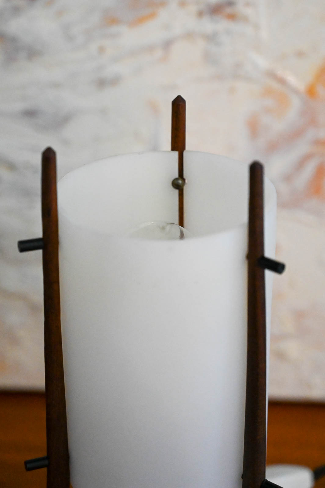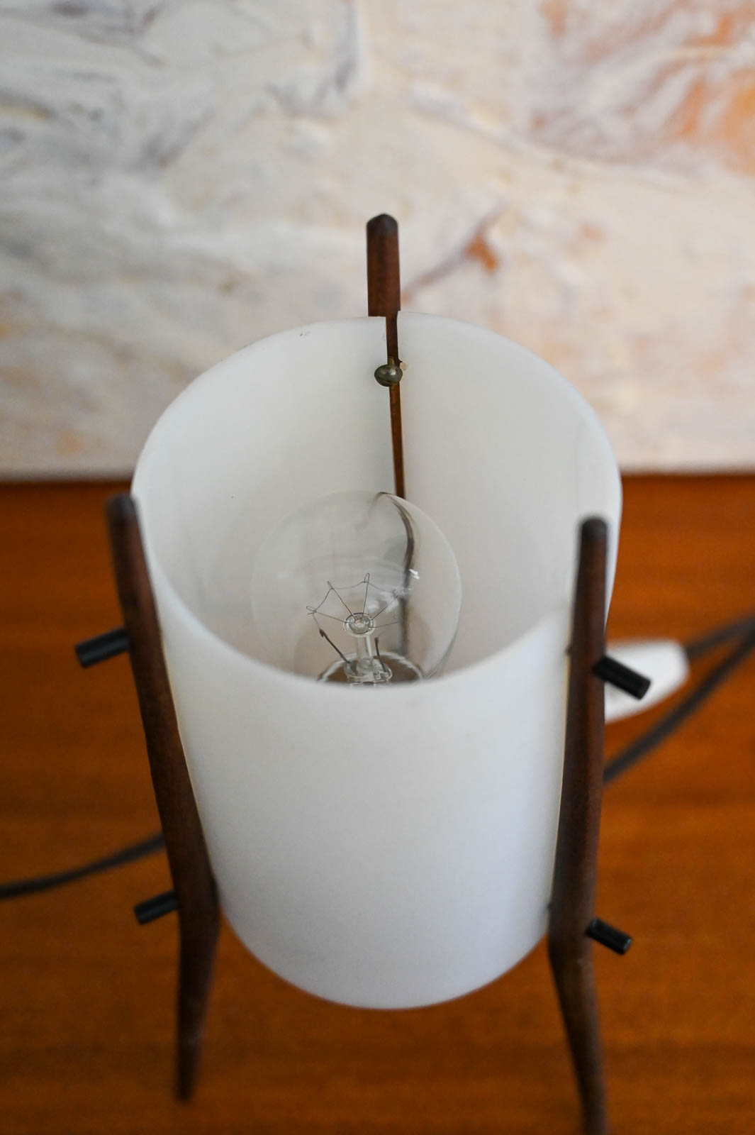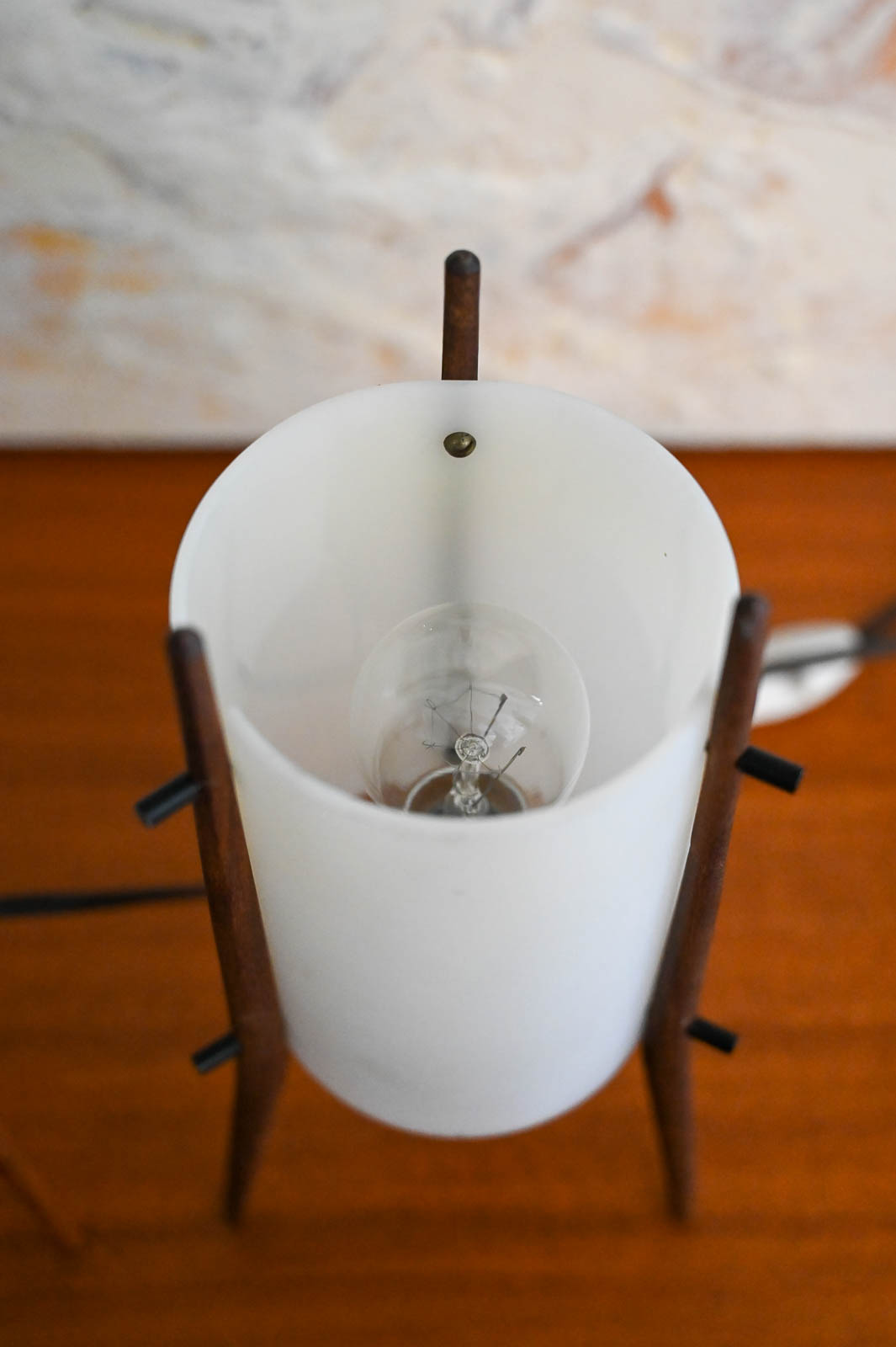 Pair of desk lamps by Alfaplex of Italy, circa 1960. Extremely rare pair of petite desk or table lamps by Alfaplex, Milano. Teak wood frame and plexi shades in good condition. Measure 10.5″ H x 5″ D. Both have original wiring and switch. One of the shades has some separation at the seam, but otherwise good. Great unusual and rare pair for your desk, wall unit or nightstands.