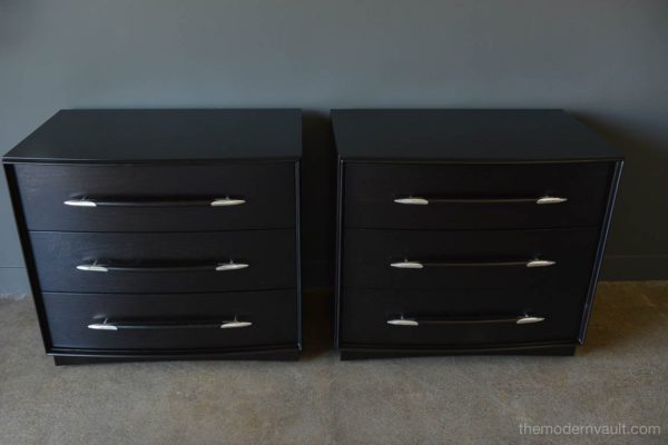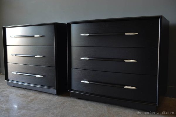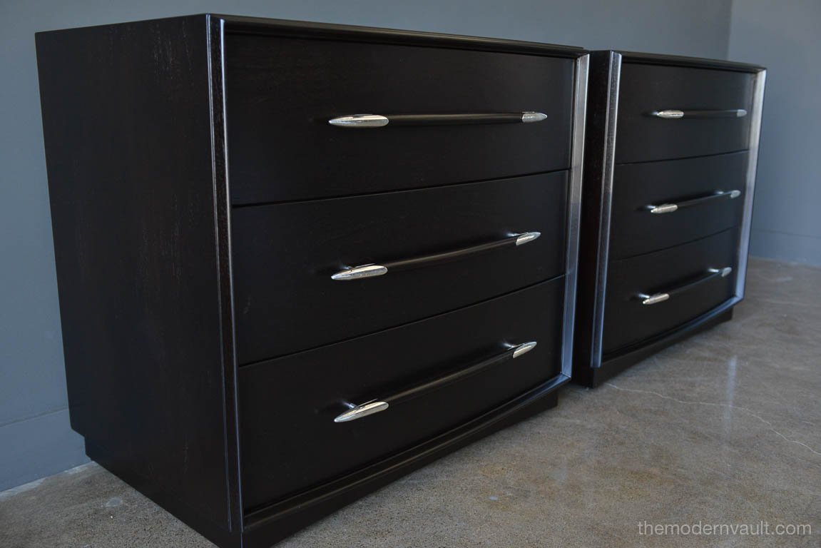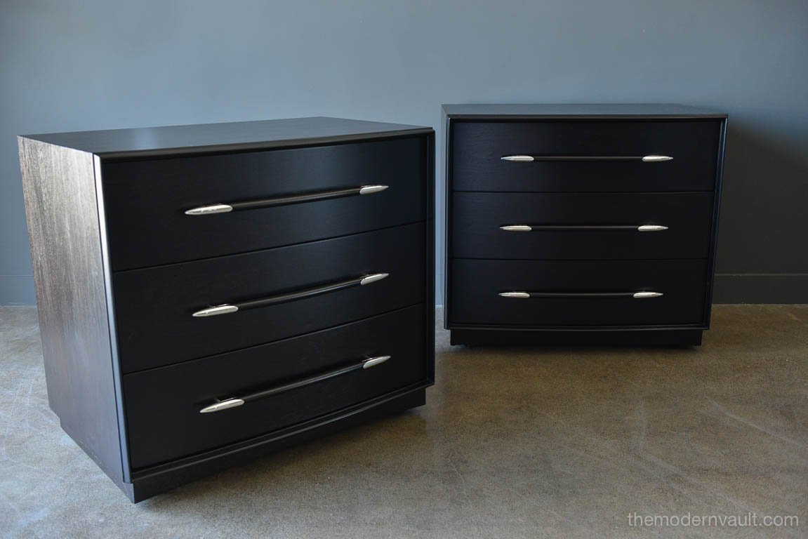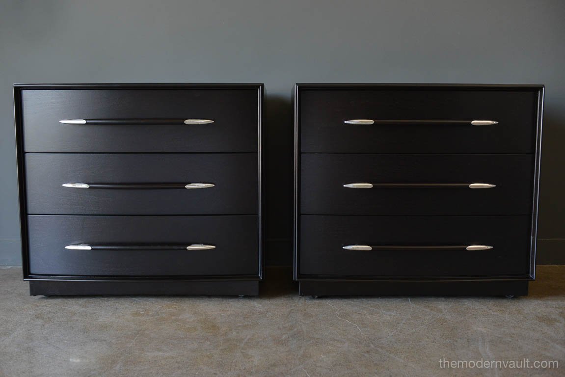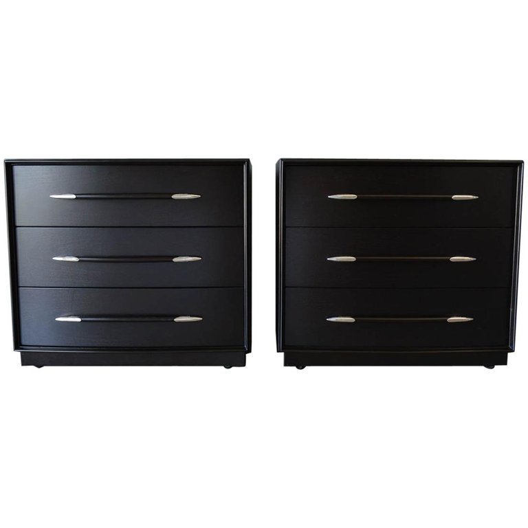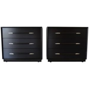 Pair of Ebonized Spear Chests by T.H. Robsjohn-Gibbings for Widdicomb, ca. 1955. Called the ‘Spear’ chests for their resemblance to the silver tipped spear hardware. Professionally ebonized and restored in showroom condition. Could be used as larger nightstands or pushed together as a credenza or larger dresser. Original casters on underside for easy moving.