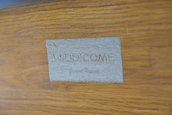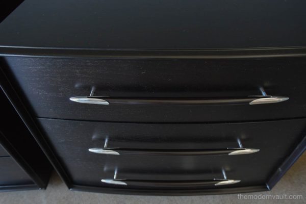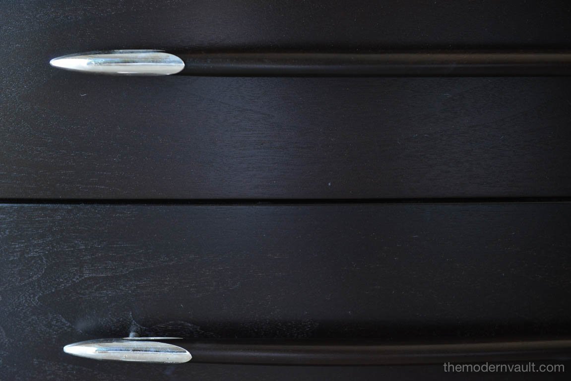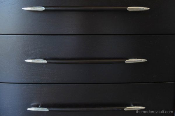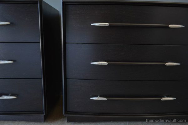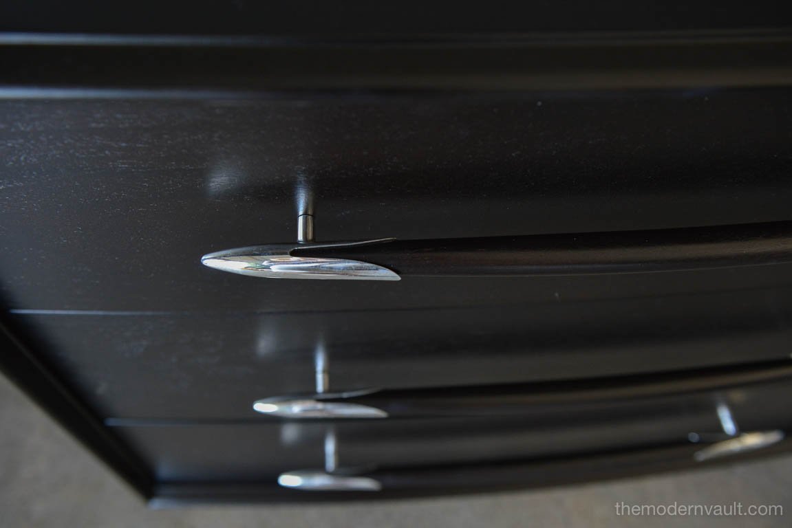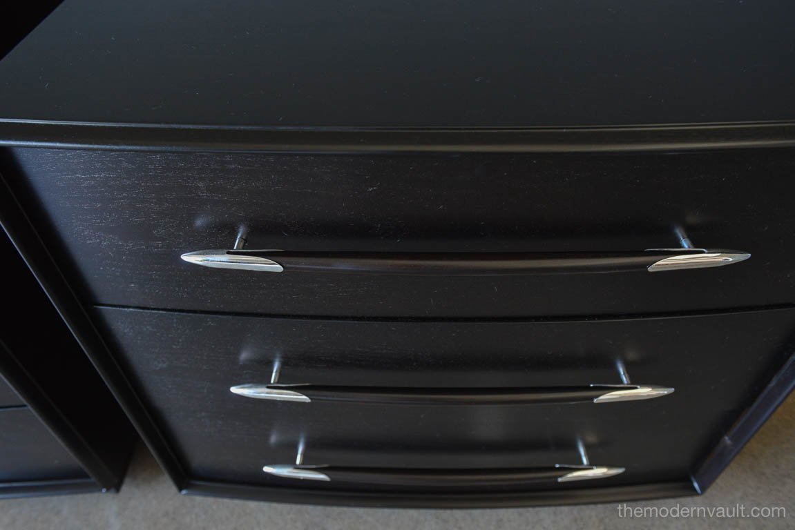 Pair of Ebonized Spear Chests by T.H. Robsjohn-Gibbings for Widdicomb, ca. 1955. Called the ‘Spear’ chests for their resemblance to the silver tipped spear hardware. Professionally ebonized and restored in showroom condition. Could be used as larger nightstands or pushed together as a credenza or larger dresser. Original casters on underside for easy moving.
