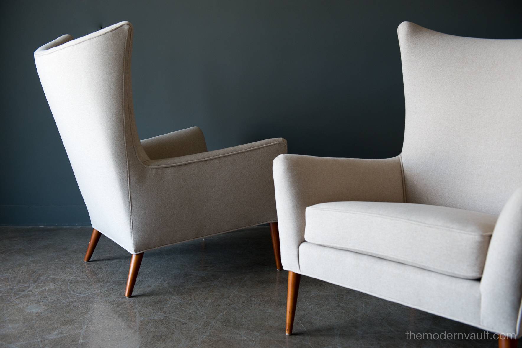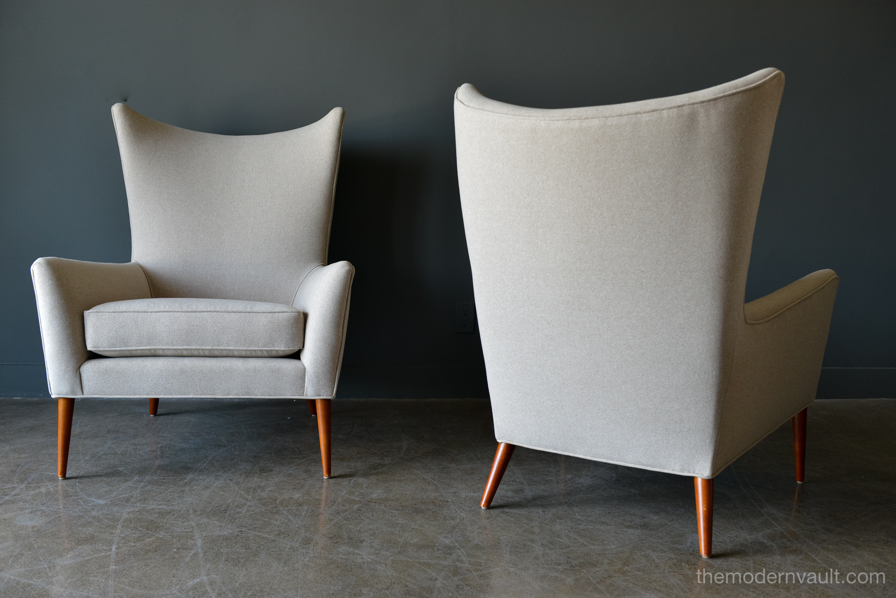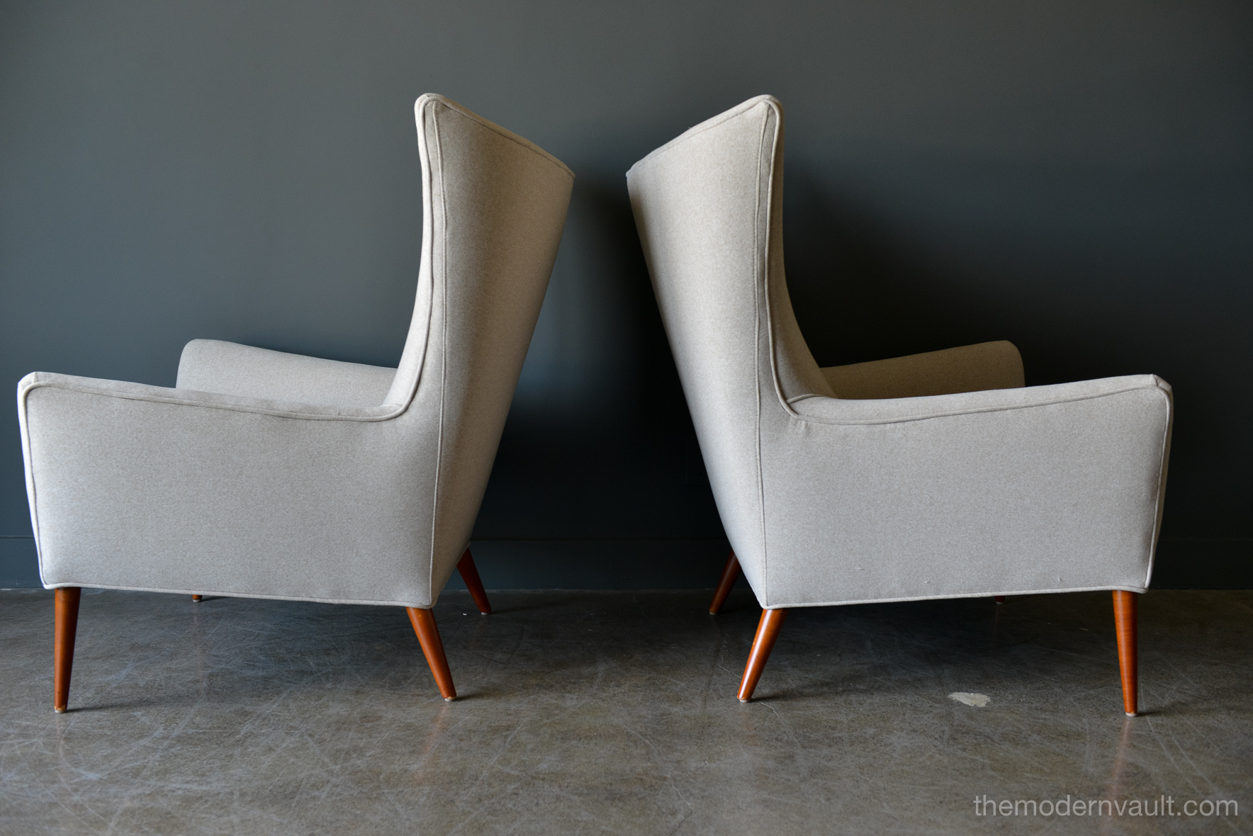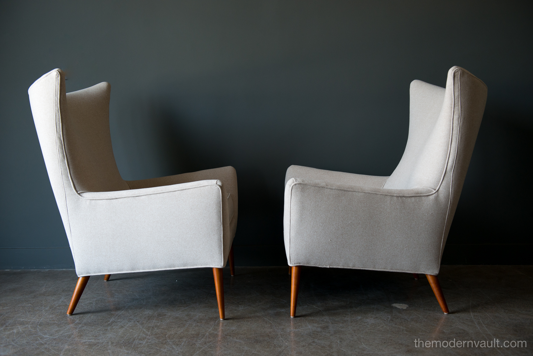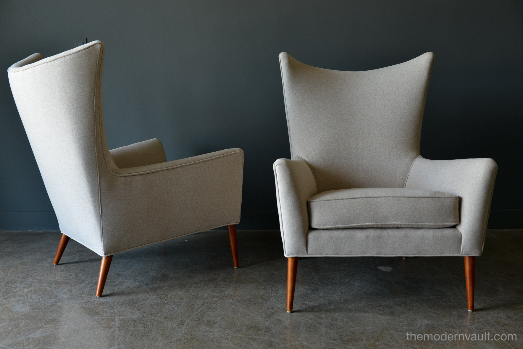Pair of Paul McCobb Model 3015 wingback lounge chairs, circa 1955. Rare matching pair professionally restored in a rich, high quality oatmeal/light tan felt poly. Fabric exceeds 60,000 double rubs using Wyzenbeek method. Gorgeous design, this chair sits very comfortably and deep, suitable for a taller person, however maintains the perfect balance of size and scale. Chairs have been professionally restored with new foam, fabric and original maple legs. Beautiful rare wing back design, hard to find in a matching pair.