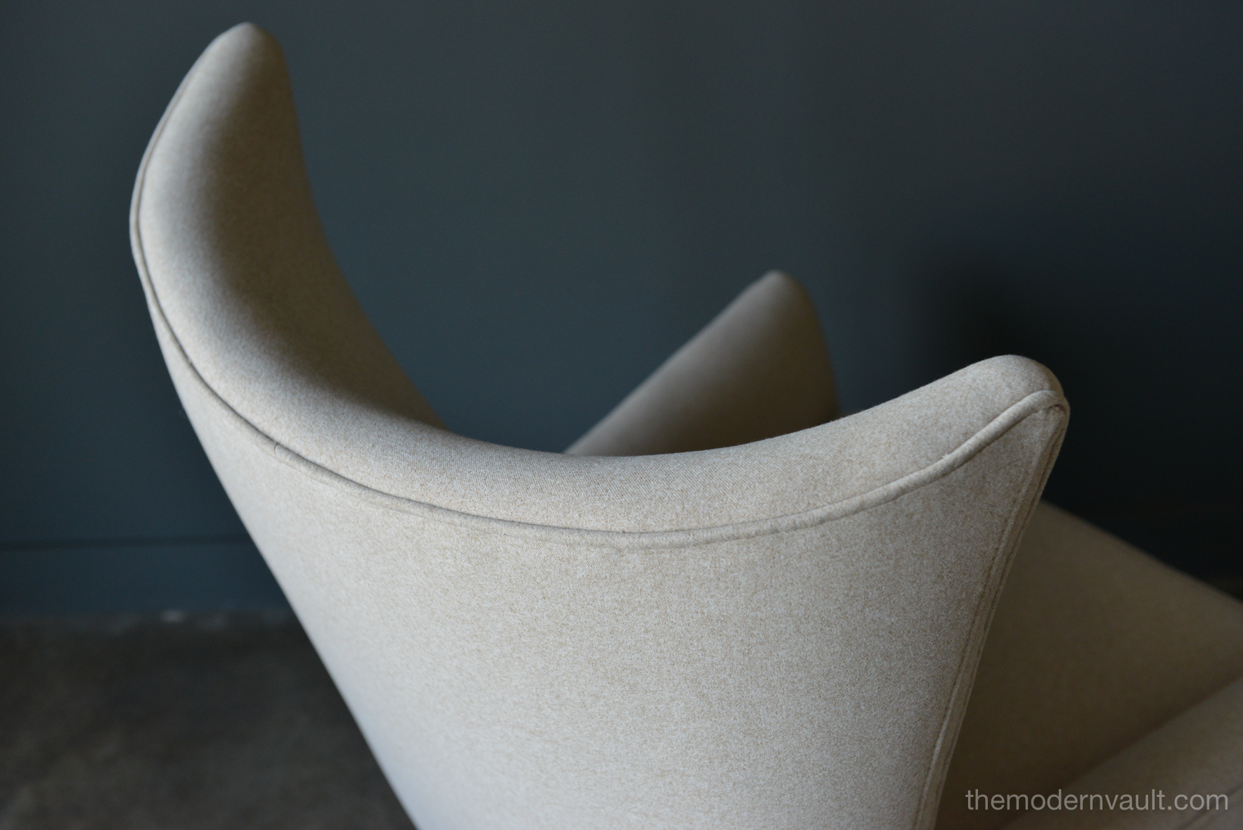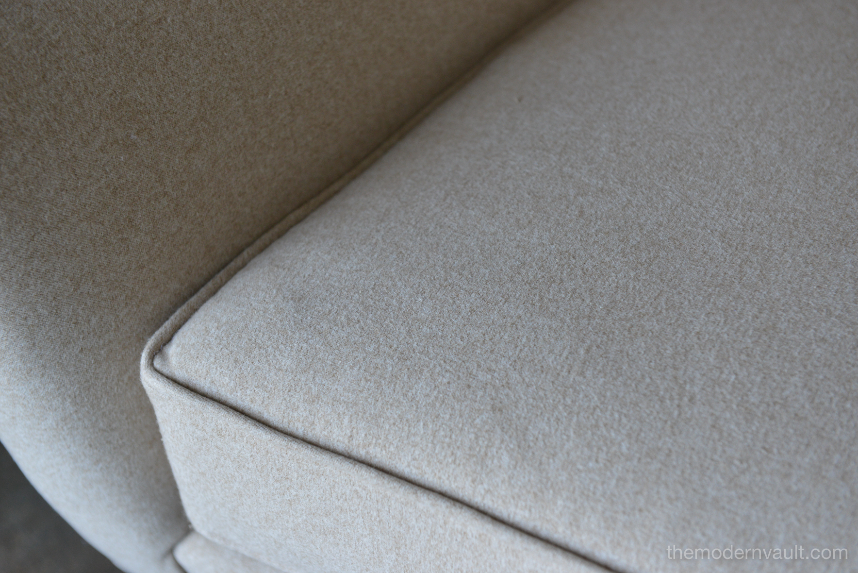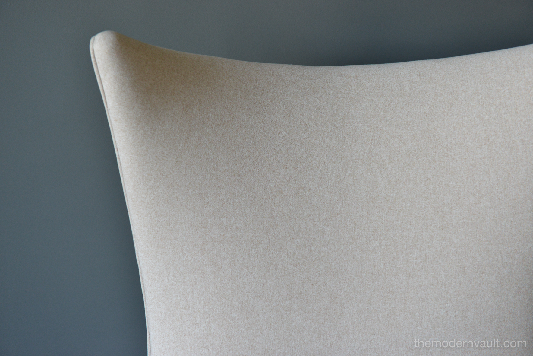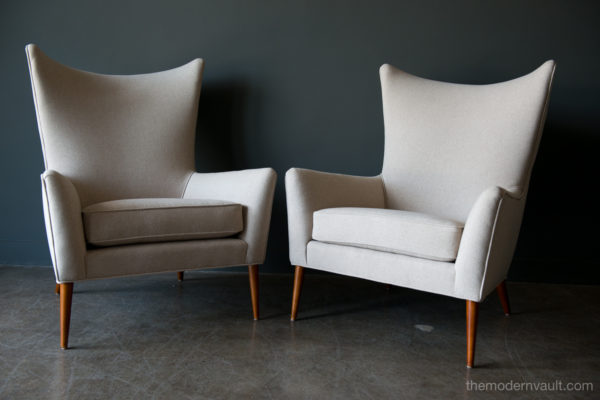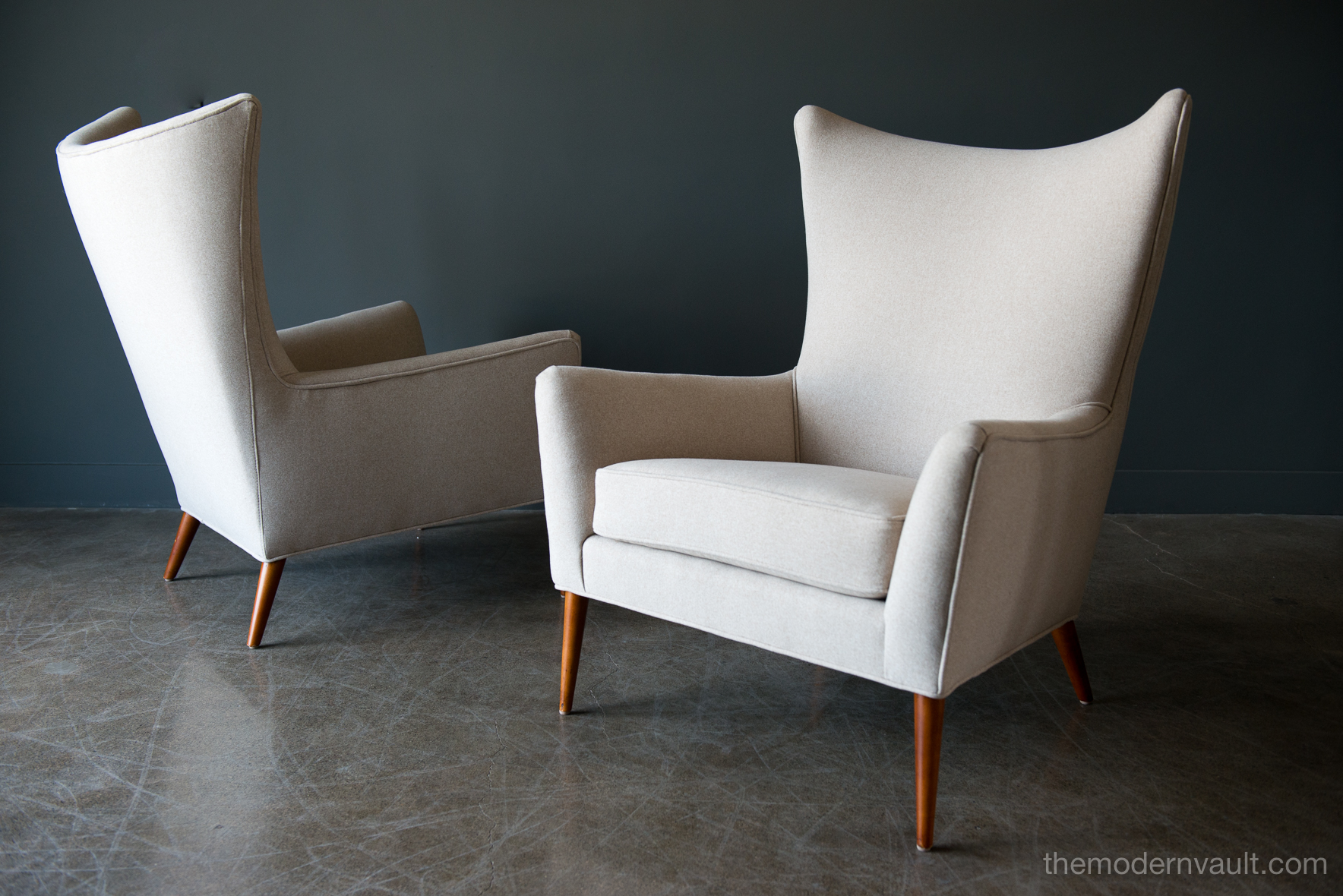 Pair of Paul McCobb Model 3015 wingback lounge chairs, circa 1955. Rare matching pair professionally restored in a rich, high quality oatmeal/light tan felt poly. Fabric exceeds 60,000 double rubs using Wyzenbeek method. Gorgeous design, this chair sits very comfortably and deep, suitable for a taller person, however maintains the perfect balance of size and scale. Chairs have been professionally restored with new foam, fabric and original maple legs. Beautiful rare wing back design, hard to find in a matching pair.