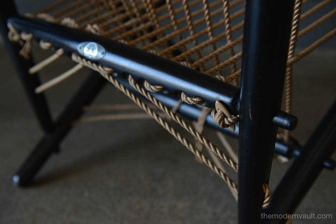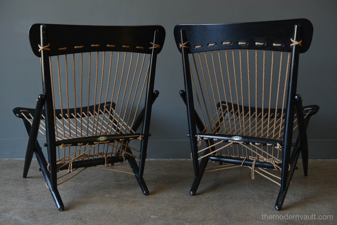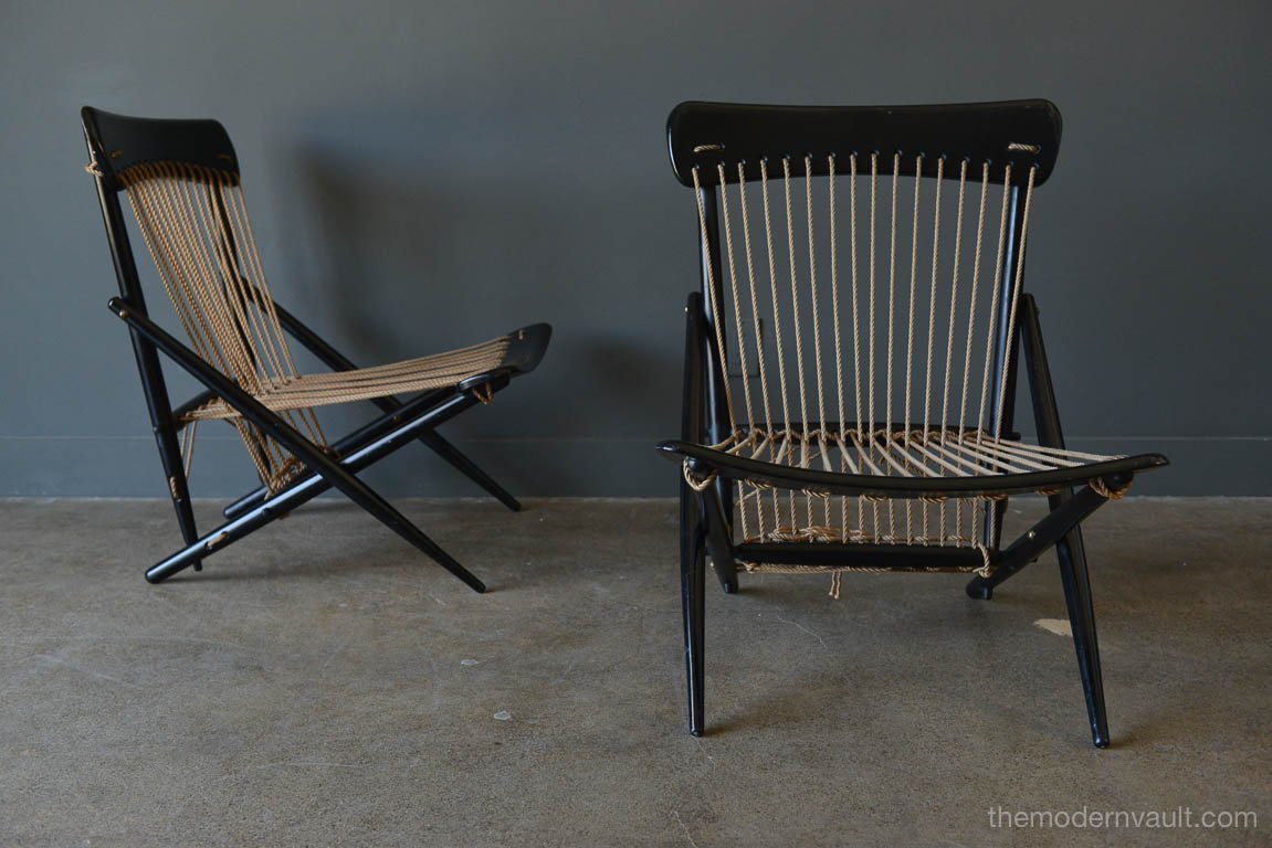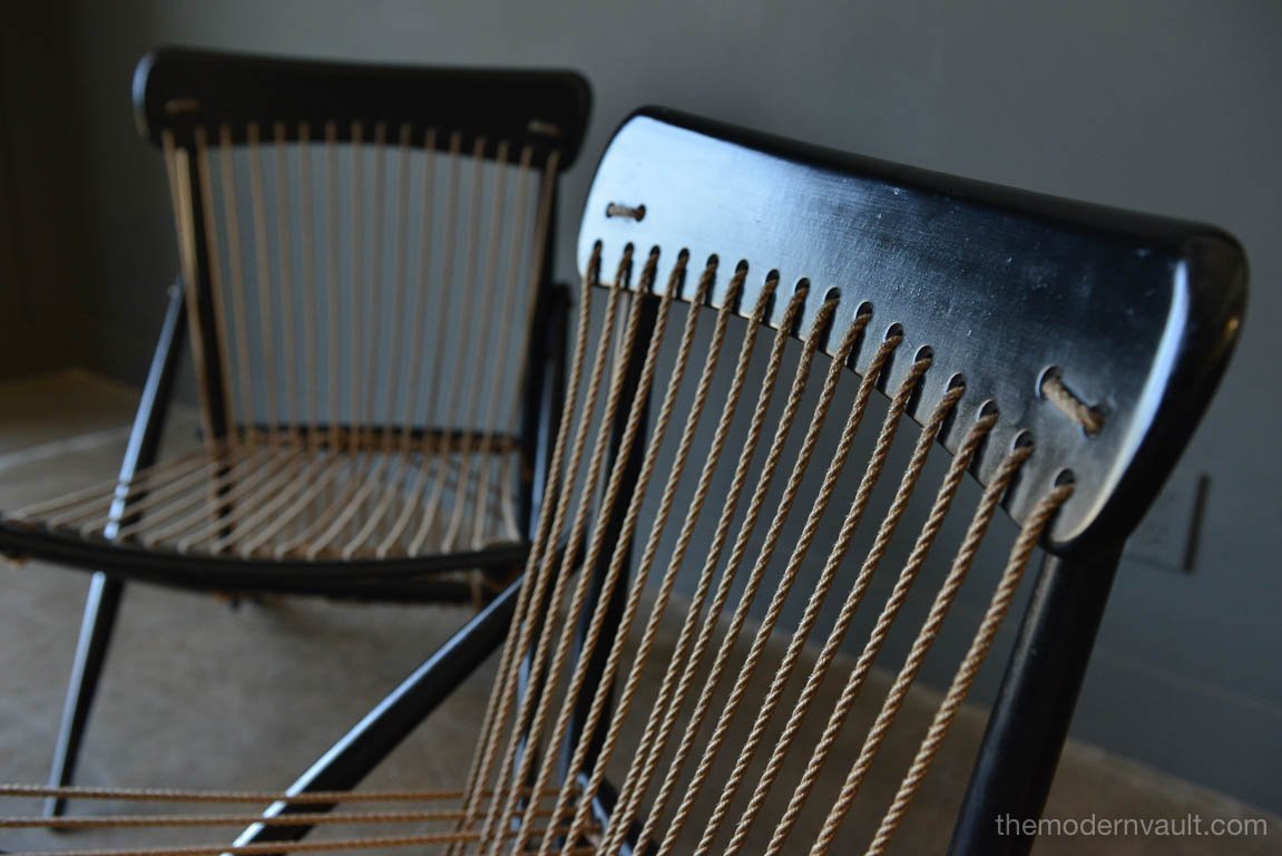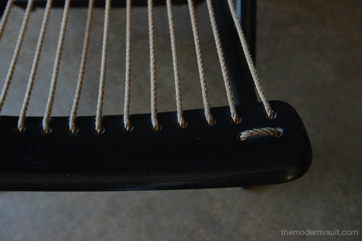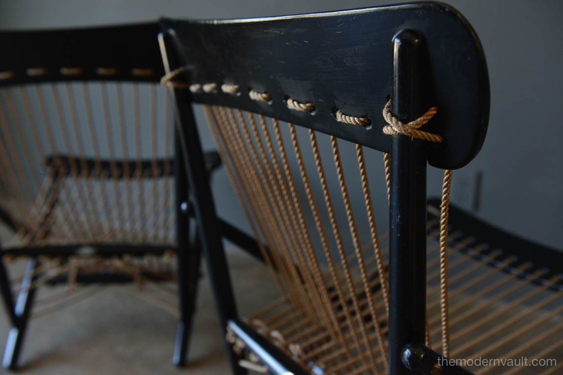 Pair of Rope Chairs by Maruni, ca. 1955 Hiroshima, Japan. Rare matching pair in original condition with ebonized beech wood frames and original rope cording. Marked with labels to the back of the frame. Wear consistent with age and use, very good original condition, some slight wear to frame and some slight fray in end of rope as seen.