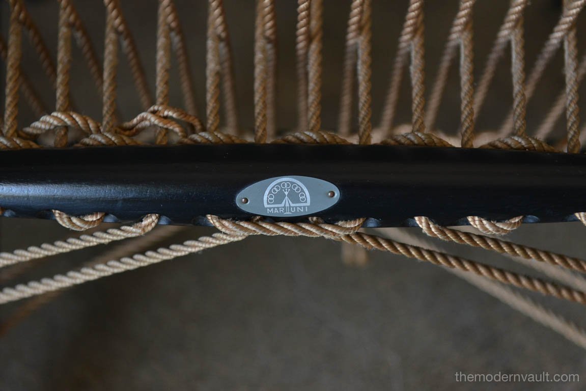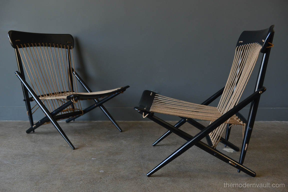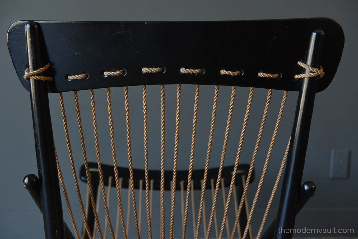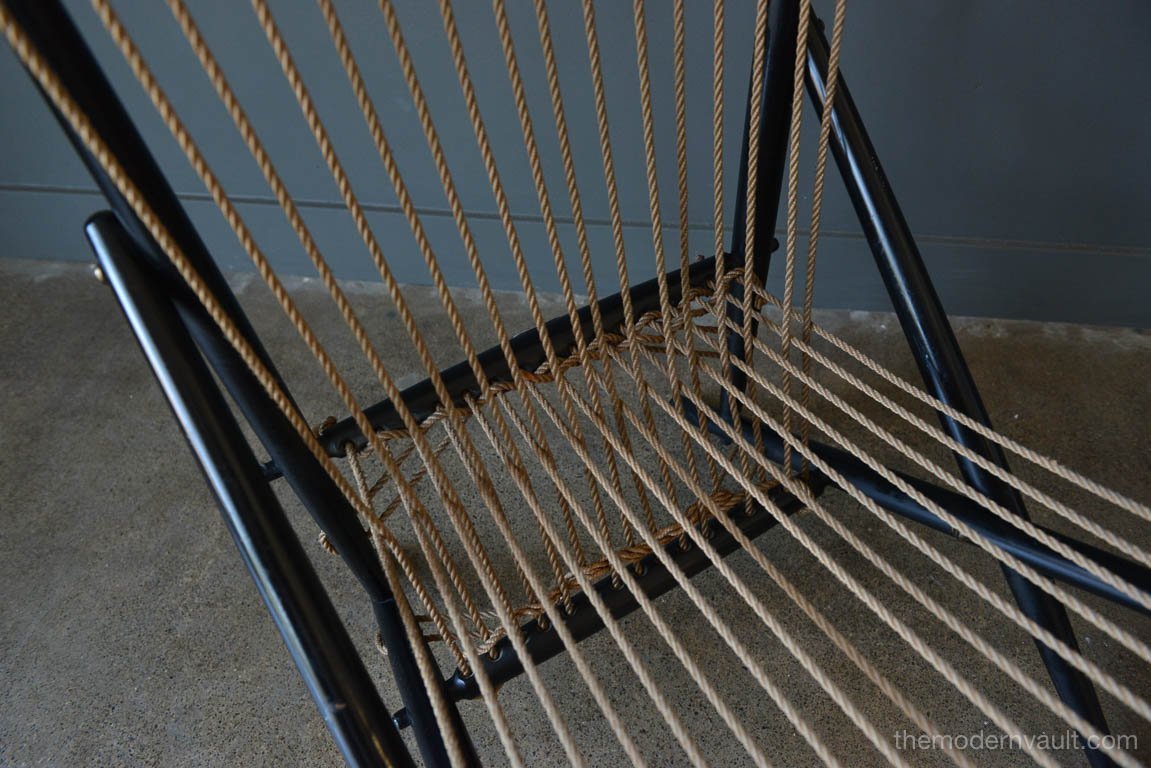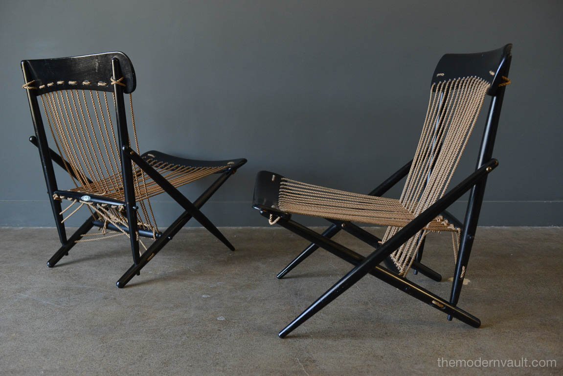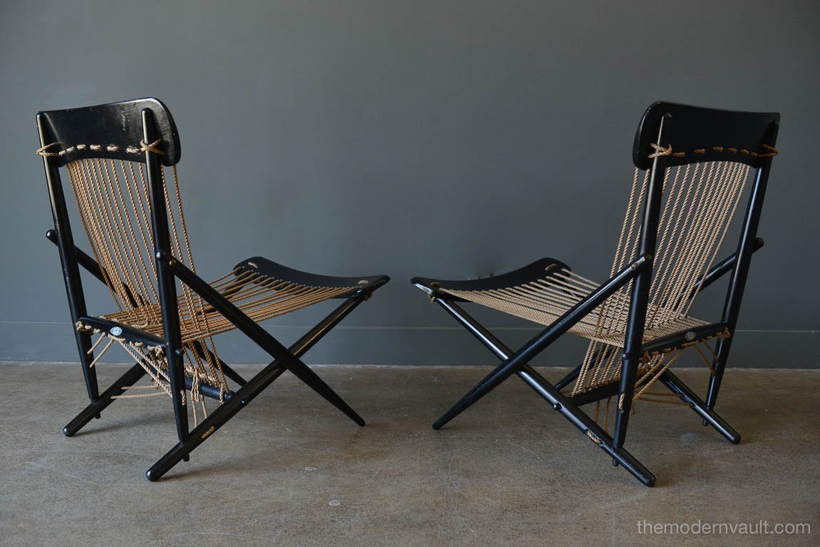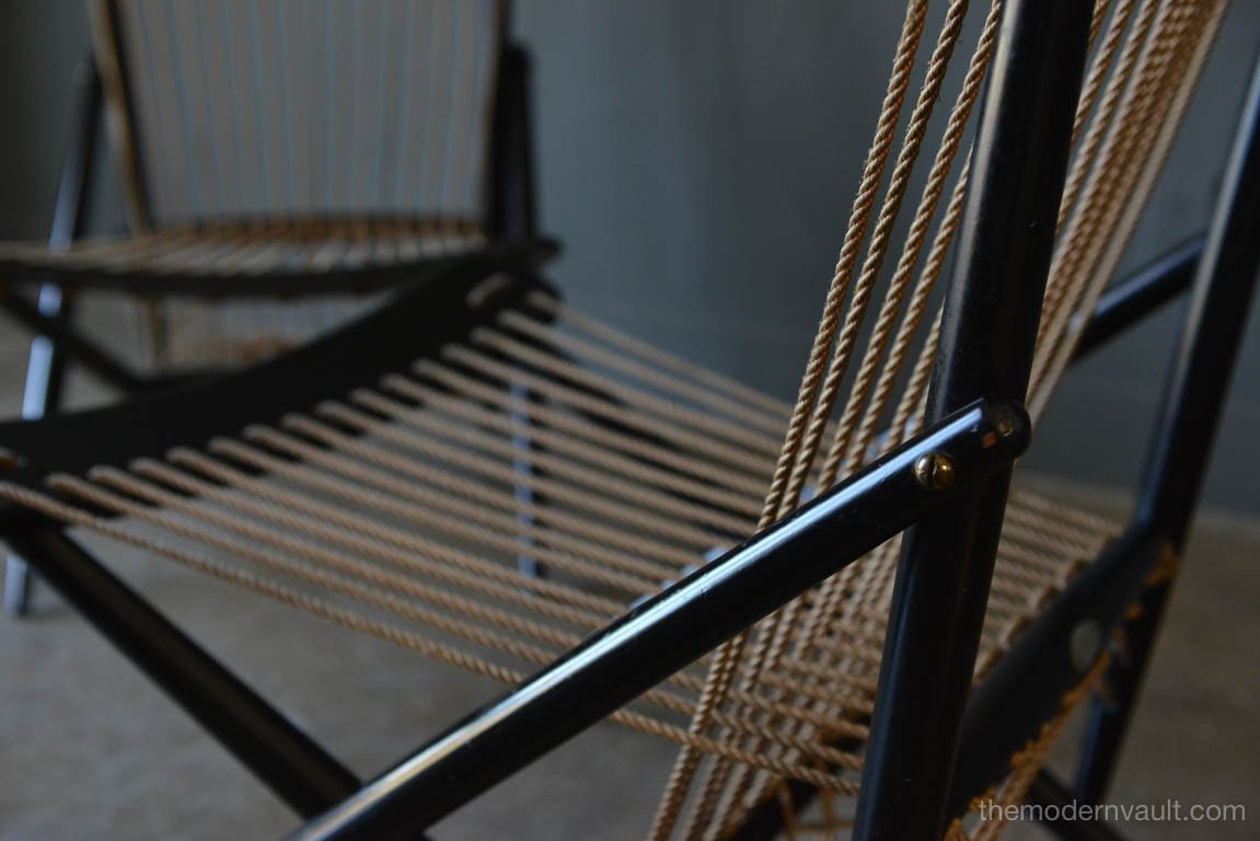 Pair of Rope Chairs by Maruni, ca. 1955 Hiroshima, Japan. Rare matching pair in original condition with ebonized beech wood frames and original rope cording. Marked with labels to the back of the frame. Wear consistent with age and use, very good original condition, some slight wear to frame and some slight fray in end of rope as seen.