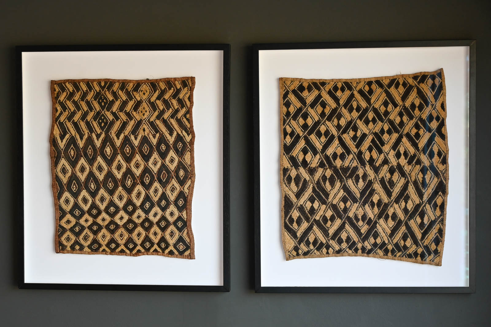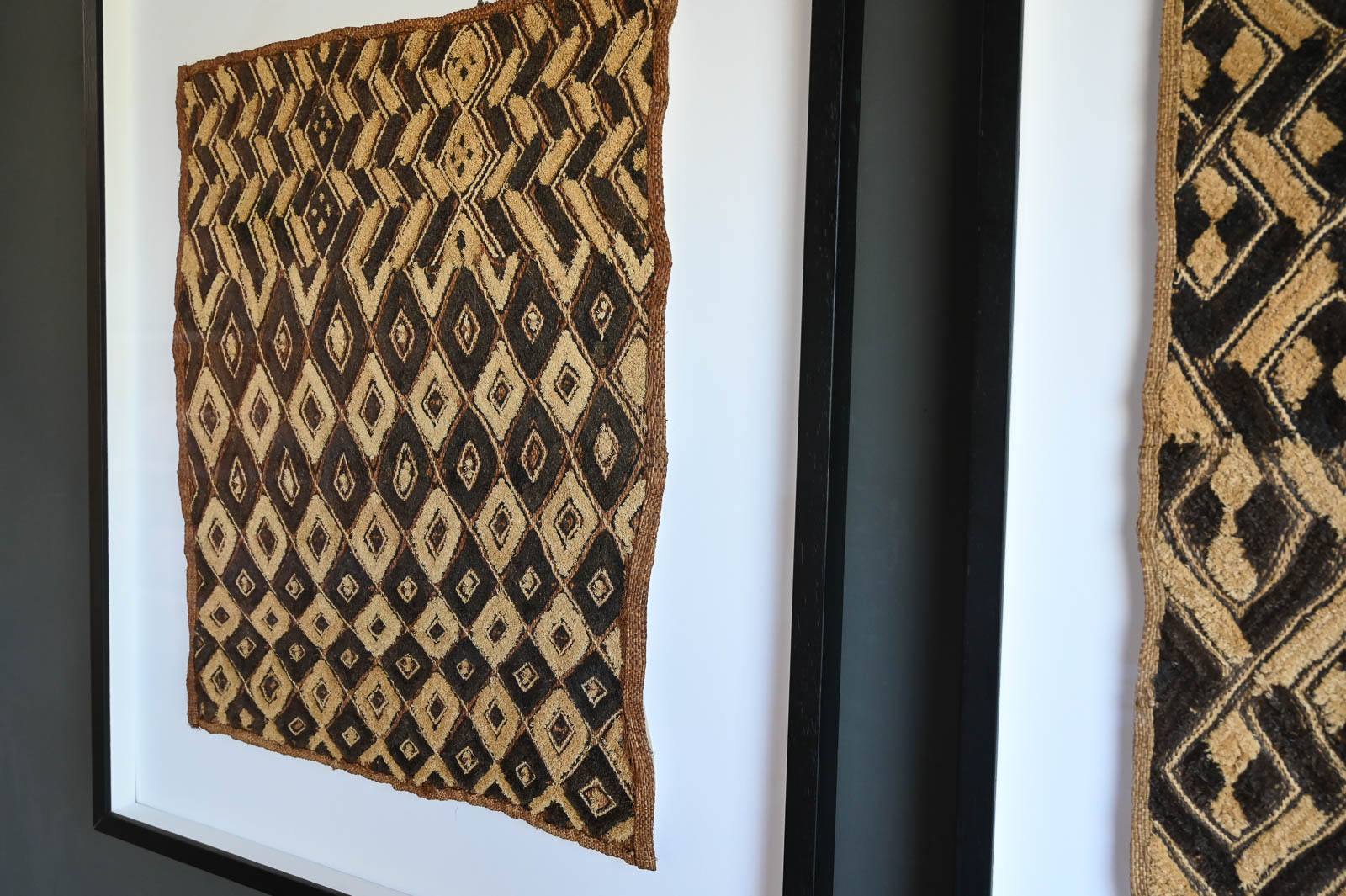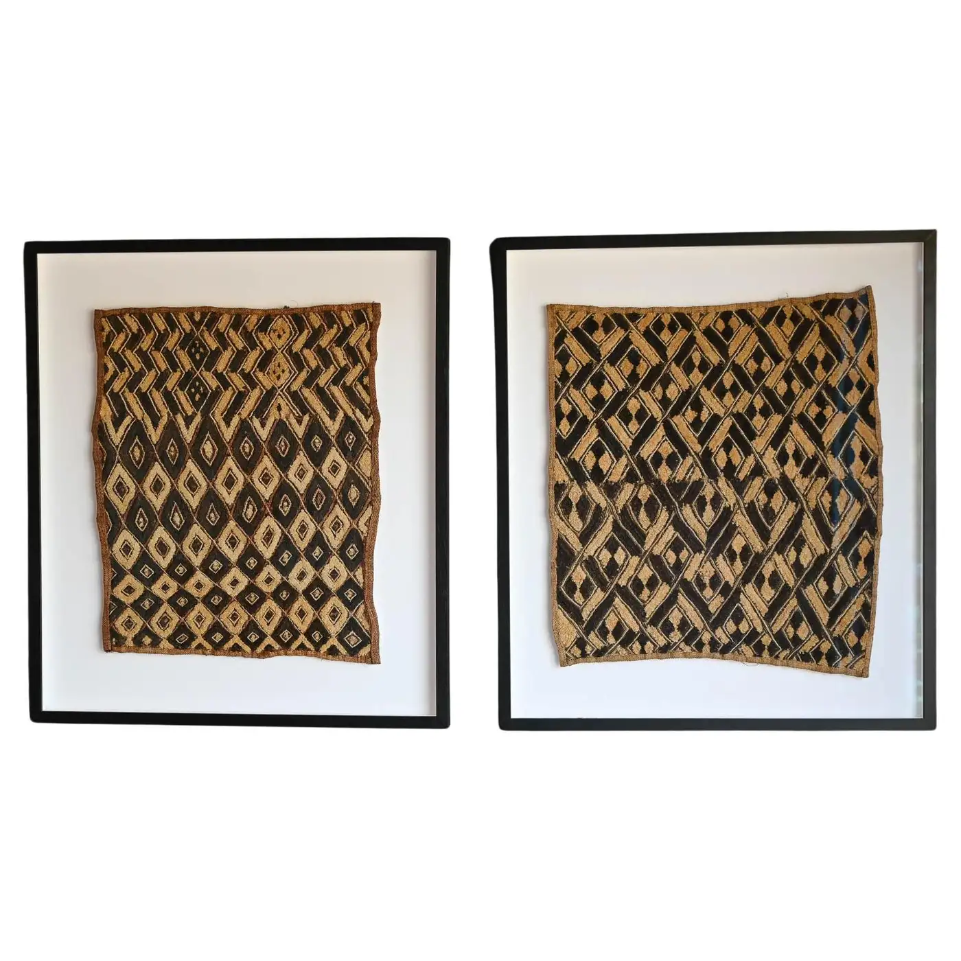 Pair of Vintage Framed Kuba Cloth Wall Decor. Beautifully framed with white shadowbox background and black frame. Measures 29″ W x 33″ H. Sold as a pair. Kuba cloth, a distinctive raffia textile, originated in the 17th-century Kuba Kingdom of central Africa, now in the Democratic Republic of Congo, and is known for its intricate geometric designs and cultural significance.