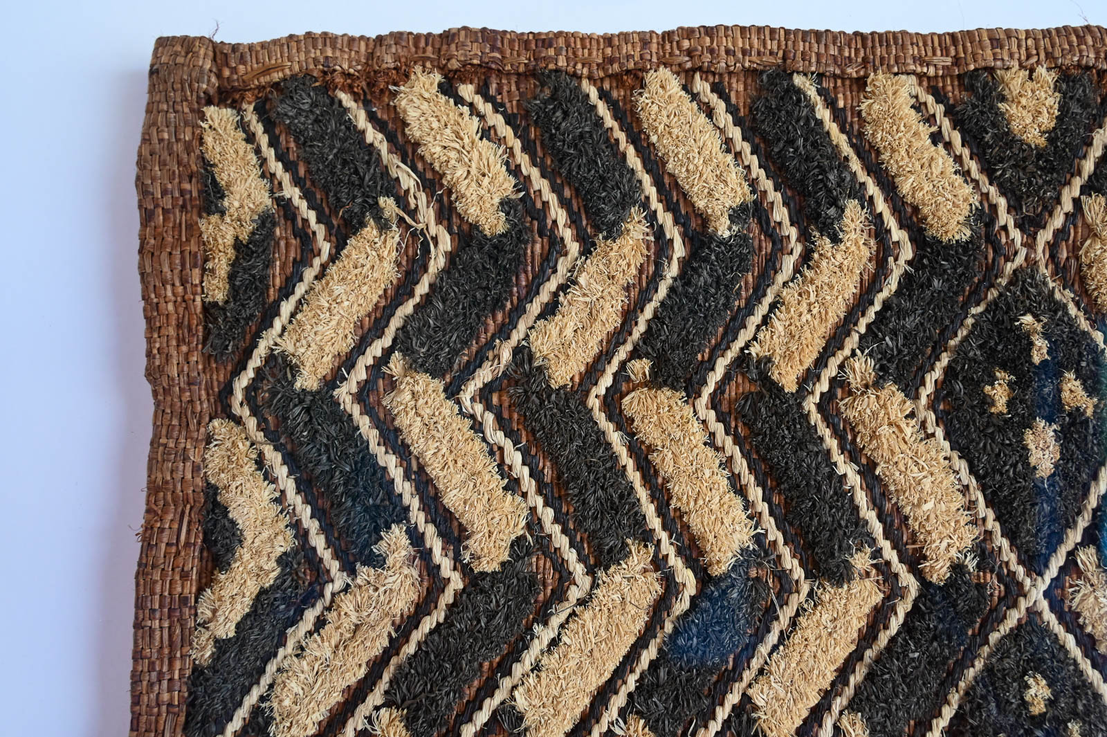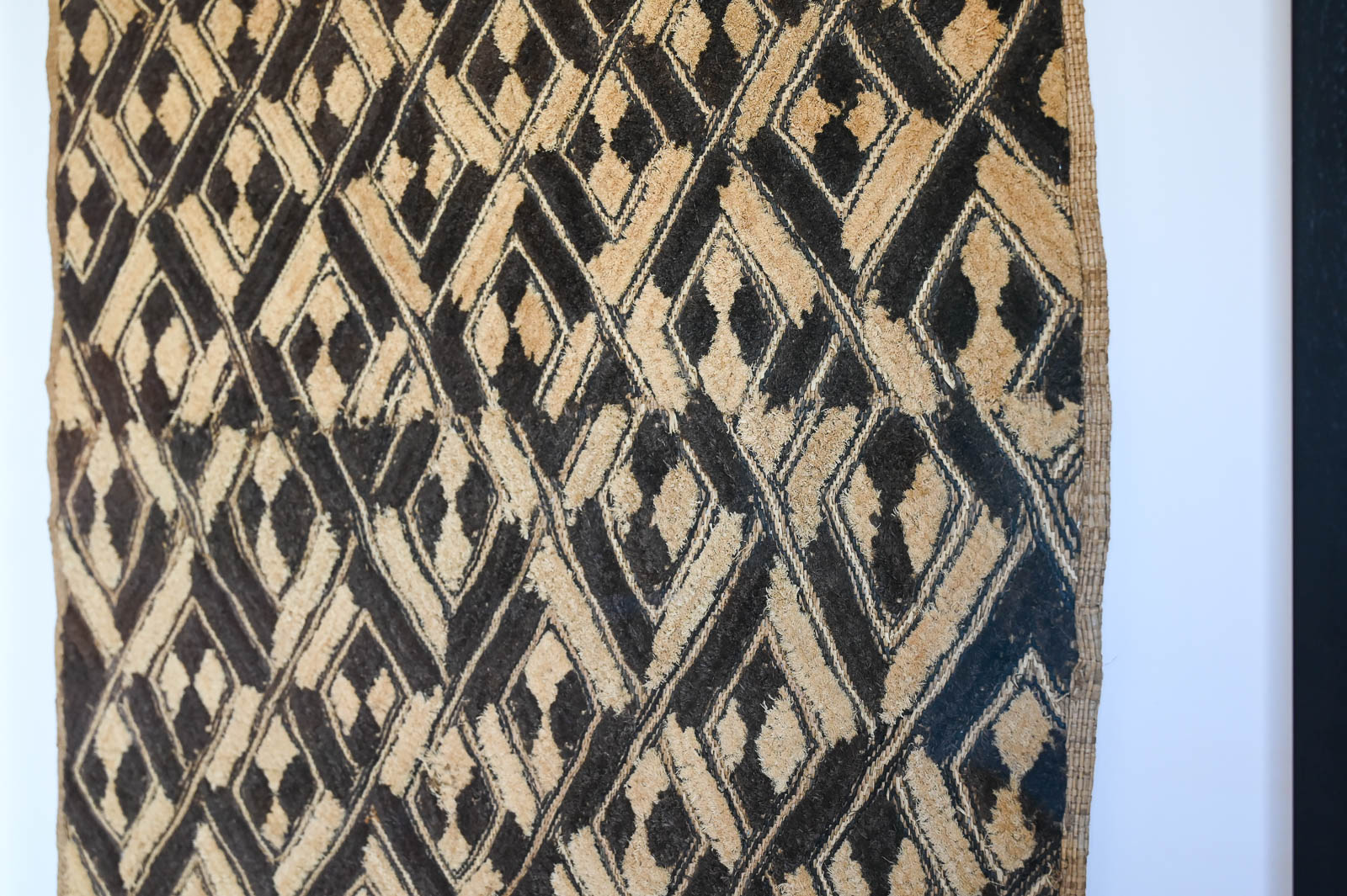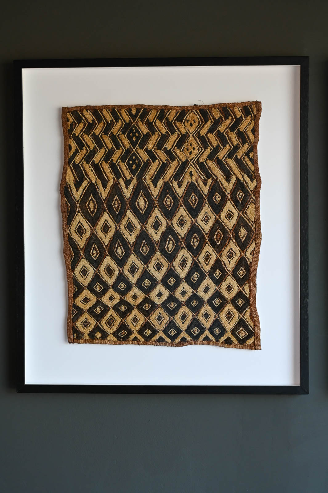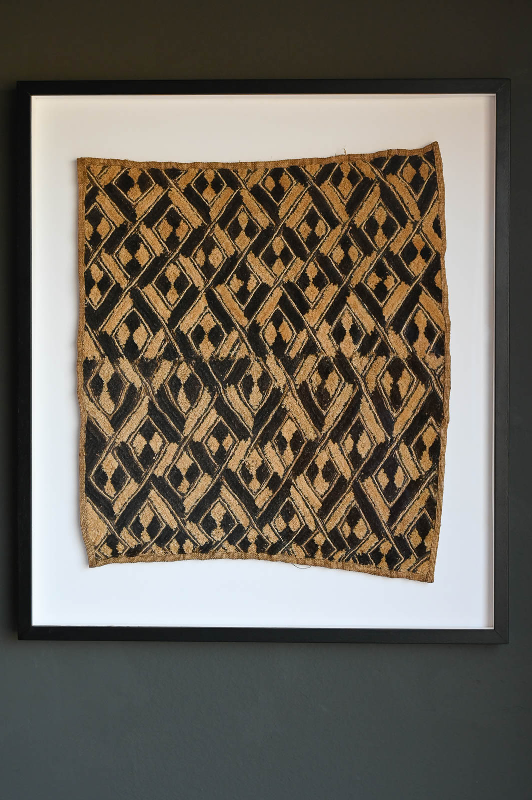 Pair of Vintage Framed Kuba Cloth Wall Decor. Beautifully framed with white shadowbox background and black frame. Measures 29″ W x 33″ H. Sold as a pair. Kuba cloth, a distinctive raffia textile, originated in the 17th-century Kuba Kingdom of central Africa, now in the Democratic Republic of Congo, and is known for its intricate geometric designs and cultural significance.