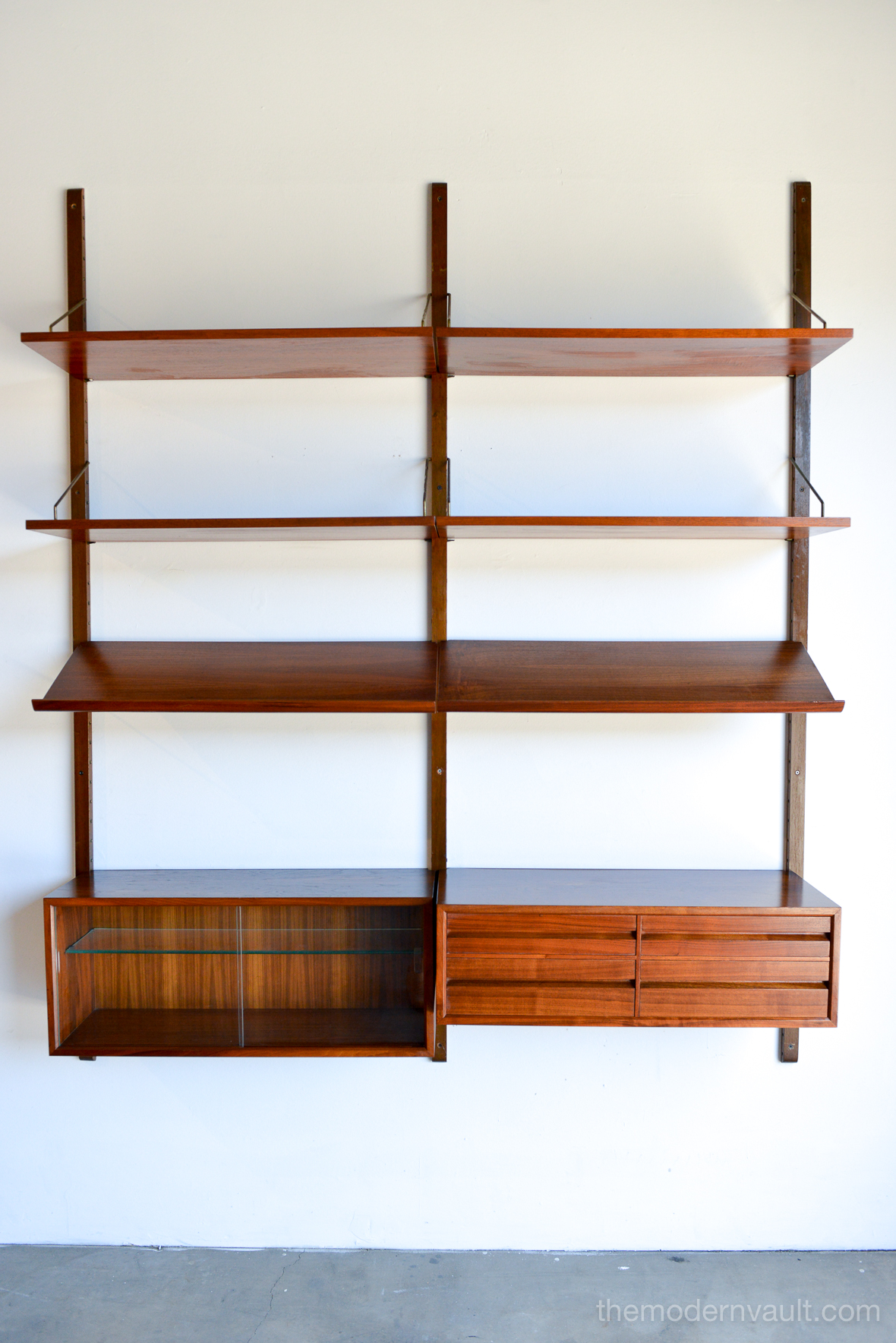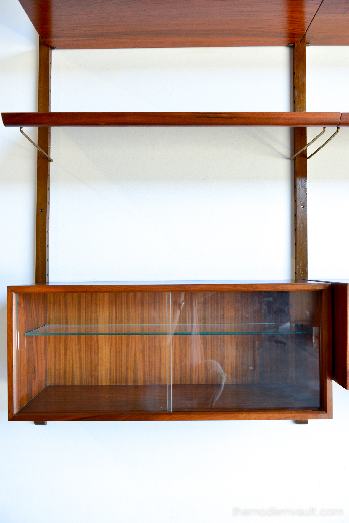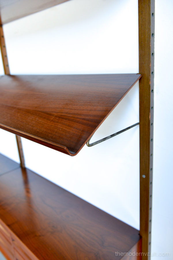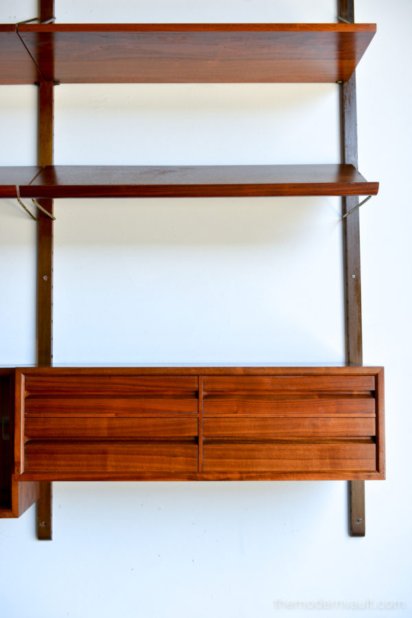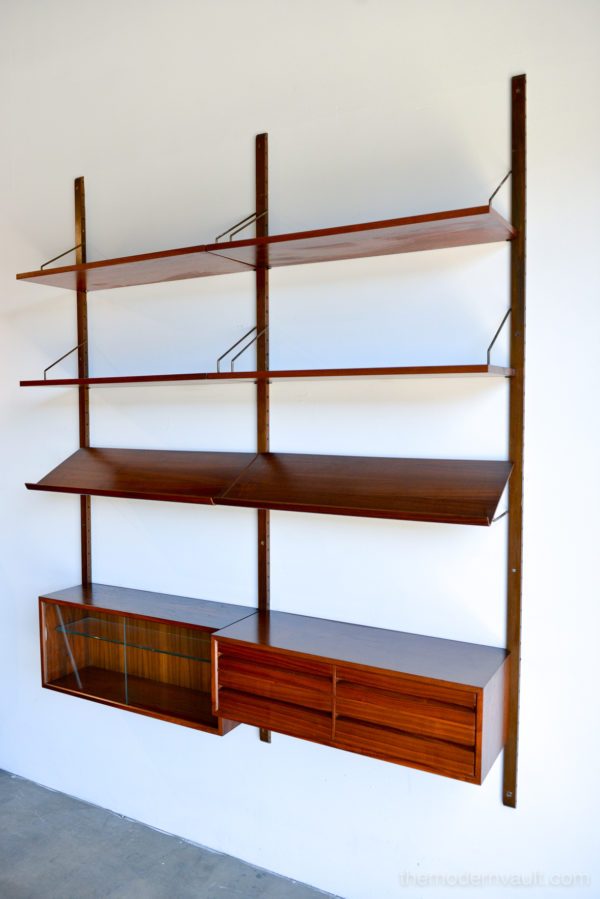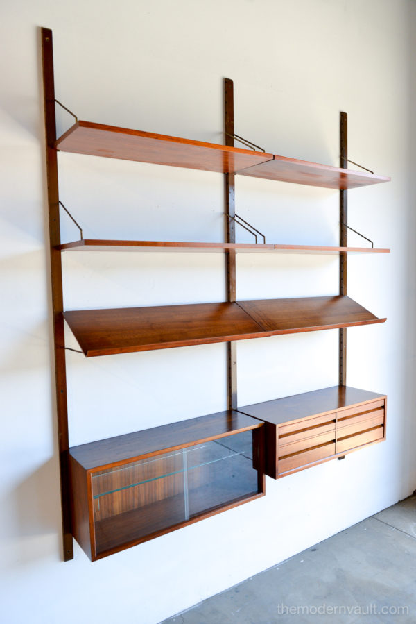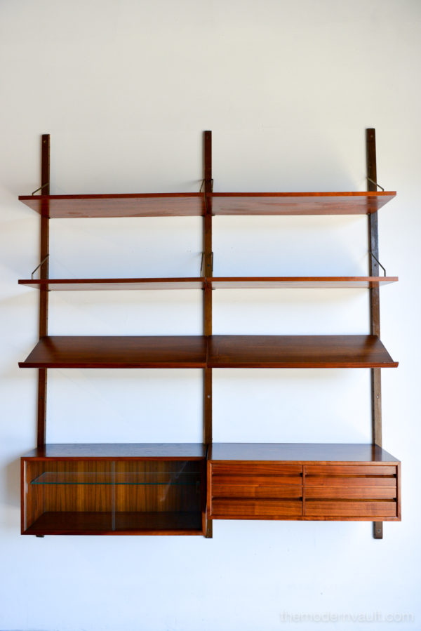 Poul Cadovius walnut 2 Bay wall unit, circa 1965. Beautiful original condition with hardly any wear. Includes as seen: 4 shelves, 2 slanted magazine shelves, 1 sliding glass door cabinet, 1 four drawer cabinet and three mounting poles that are 78″ long. Original brass hardware and glass shelves, doors. Easy assembly and setup. Measures as shown: 64.75″ wide.