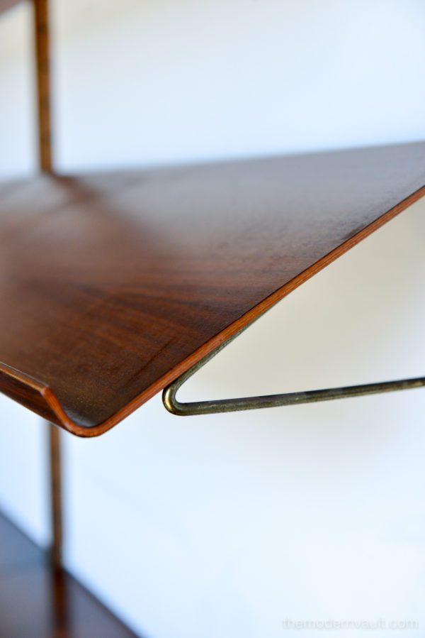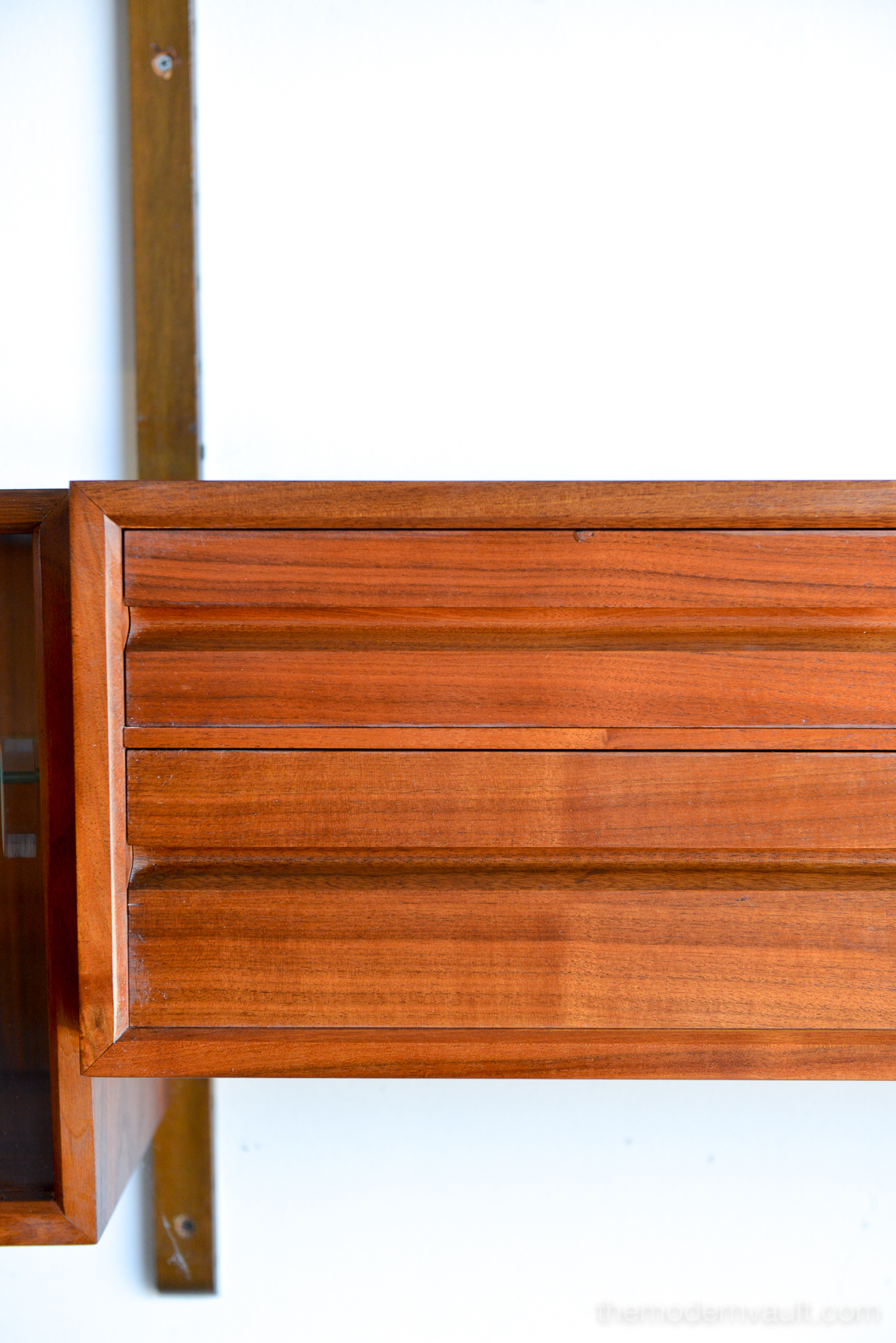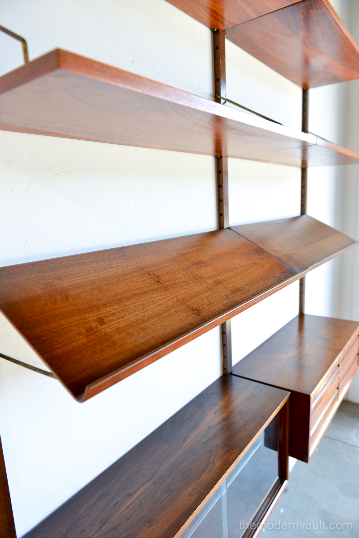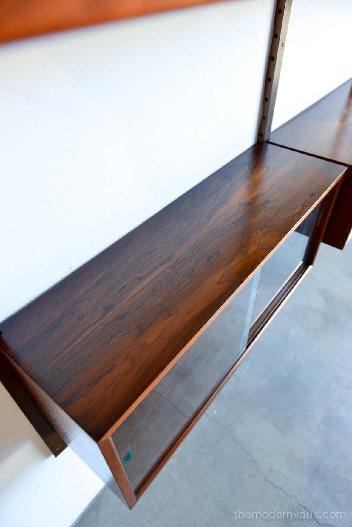 Poul Cadovius walnut 2 Bay wall unit, circa 1965. Beautiful original condition with hardly any wear. Includes as seen: 4 shelves, 2 slanted magazine shelves, 1 sliding glass door cabinet, 1 four drawer cabinet and three mounting poles that are 78″ long. Original brass hardware and glass shelves, doors. Easy assembly and setup. Measures as shown: 64.75″ wide.