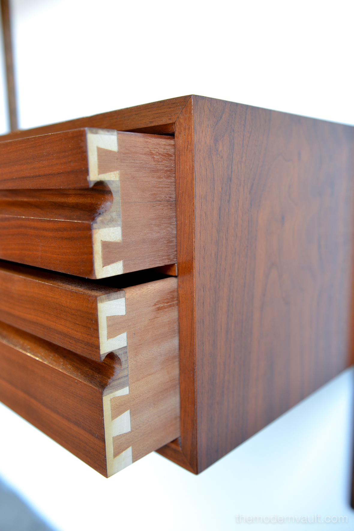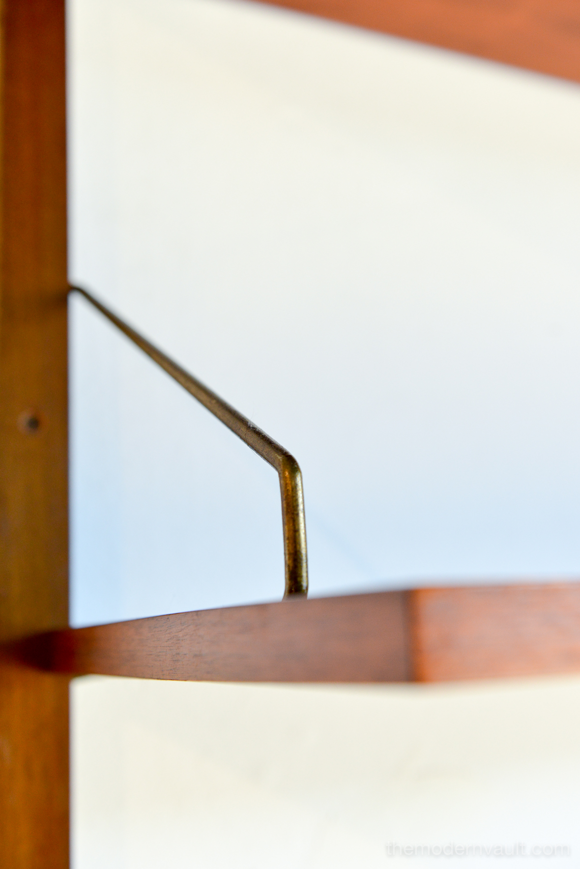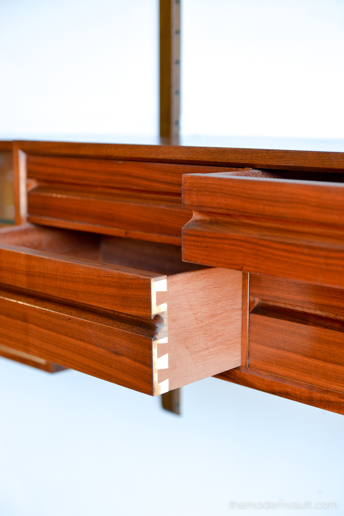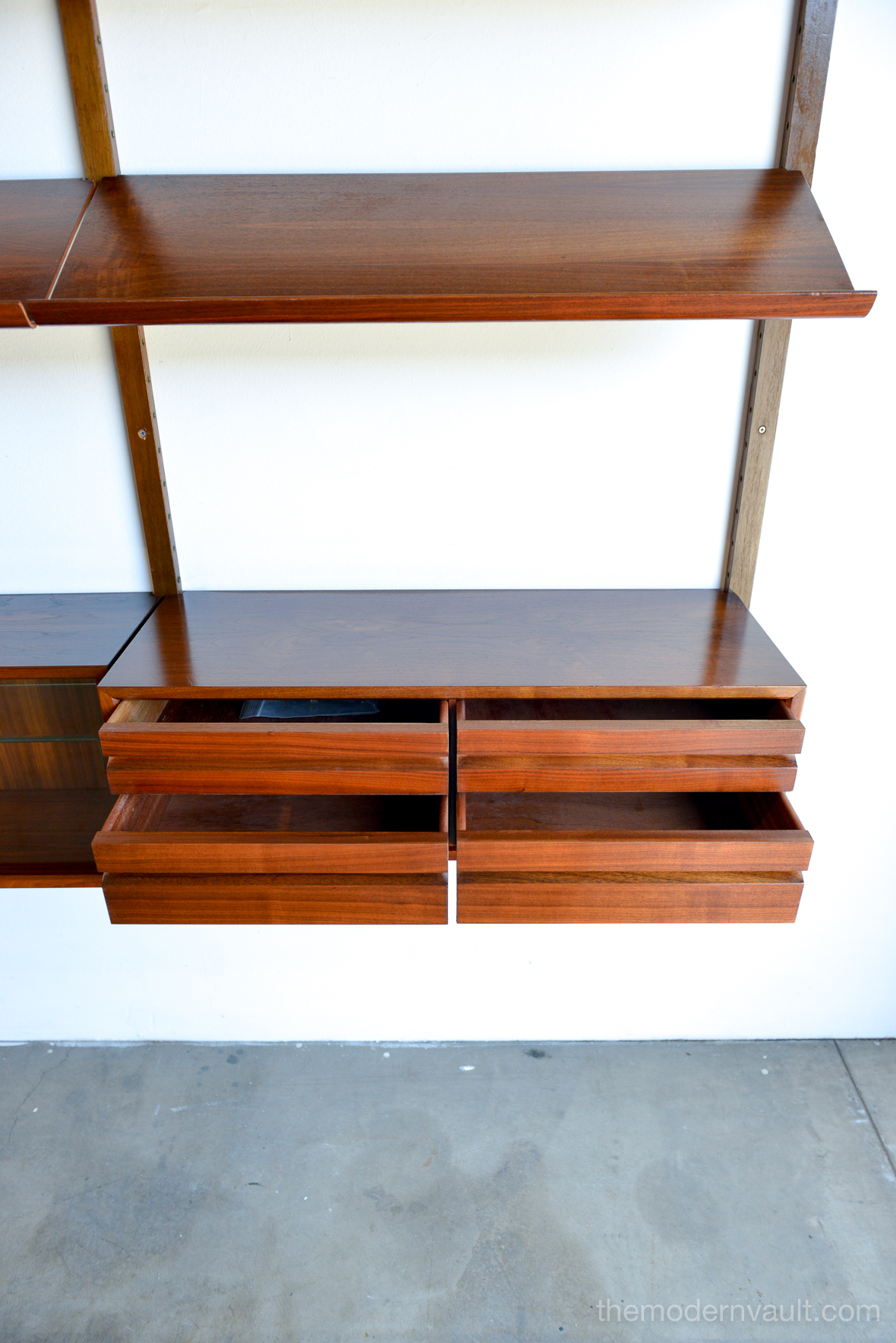 Poul Cadovius walnut 2 Bay wall unit, circa 1965. Beautiful original condition with hardly any wear. Includes as seen: 4 shelves, 2 slanted magazine shelves, 1 sliding glass door cabinet, 1 four drawer cabinet and three mounting poles that are 78″ long. Original brass hardware and glass shelves, doors. Easy assembly and setup. Measures as shown: 64.75″ wide.