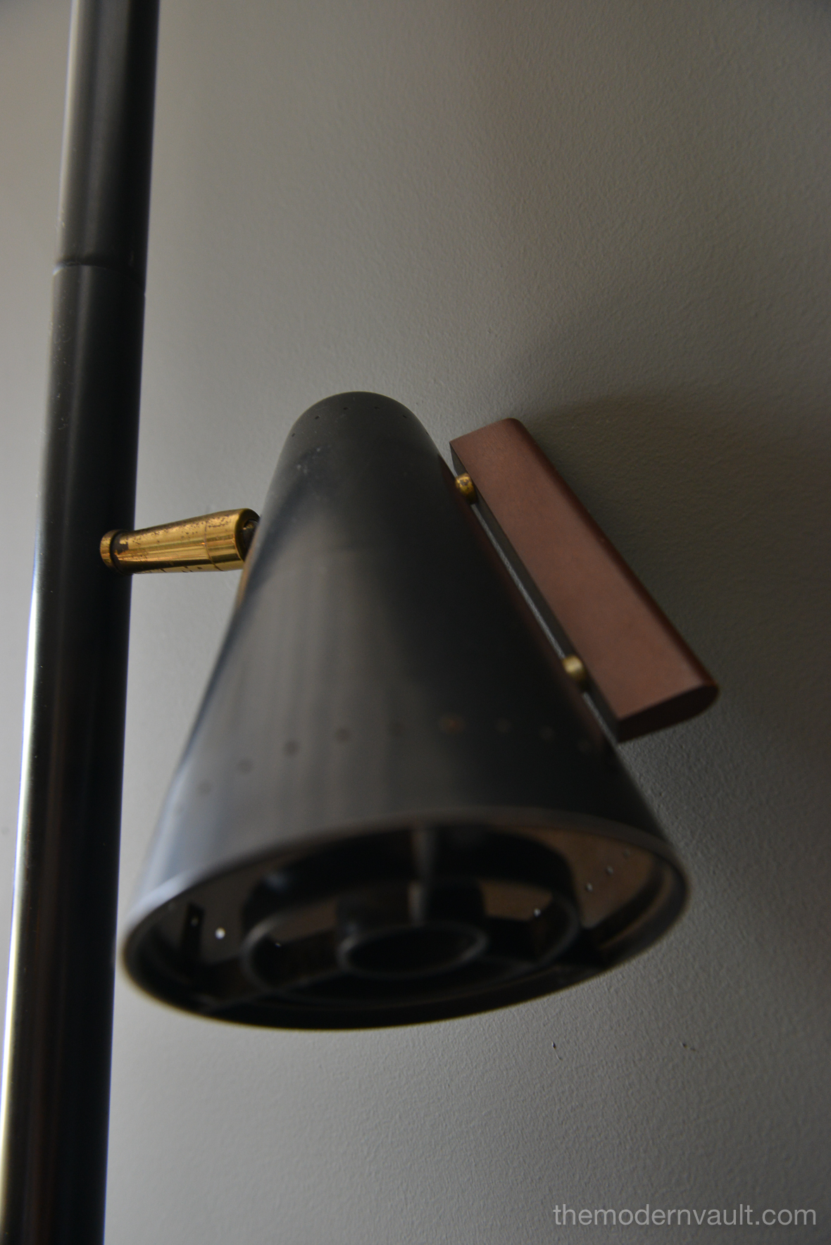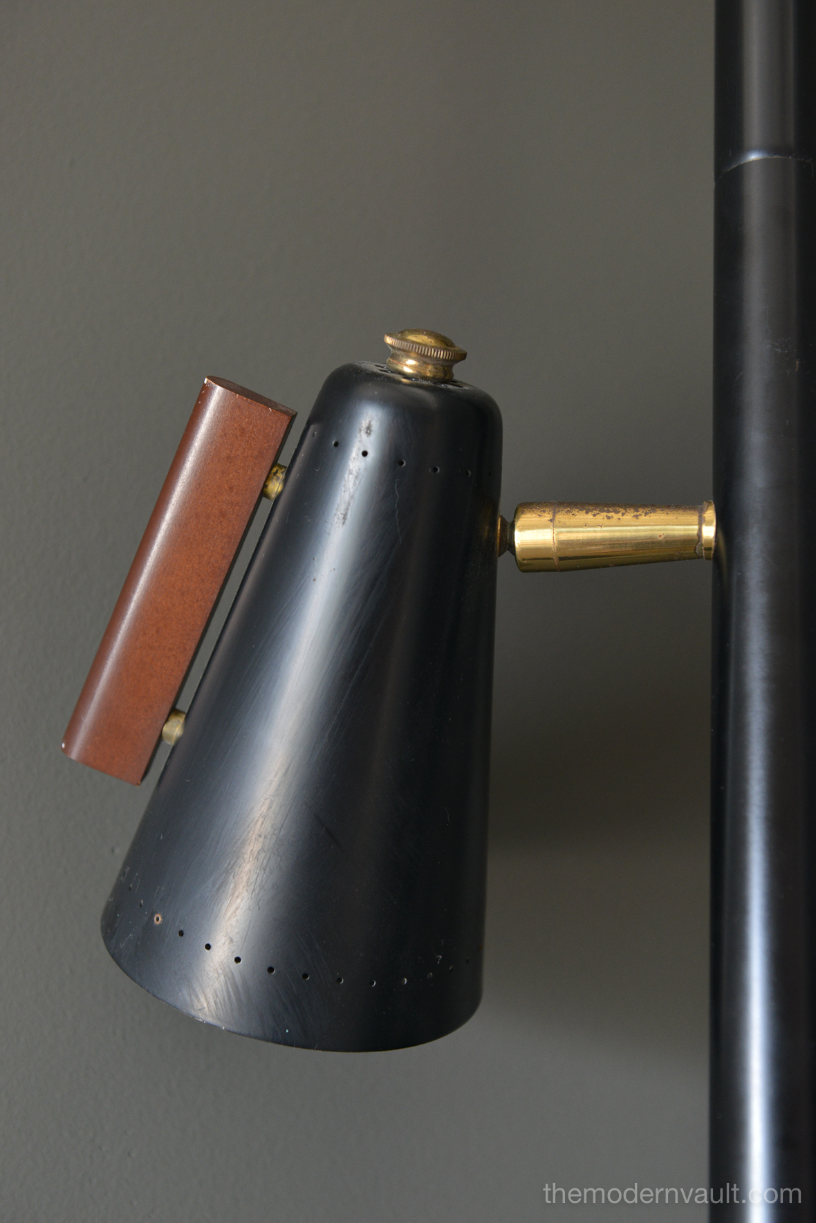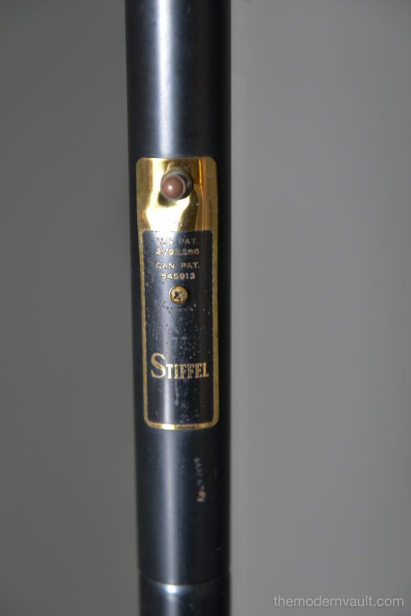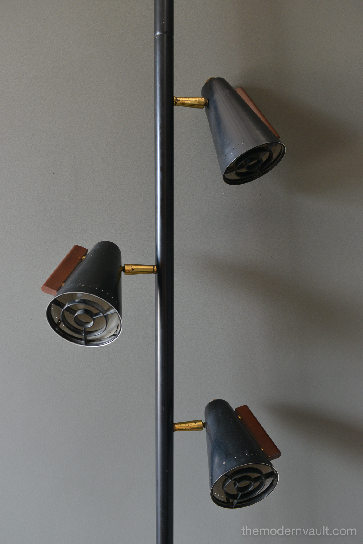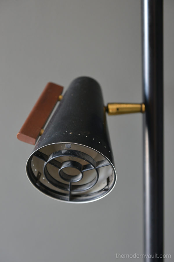 Raymond Lowey for Stiffel tension pole lamp, circa 1965. Black enameled pole and shades with brass and teak accents. Lamp is in good working order, the switch is a 3 way that allows you to turn on each light separately. Retains makers mark on pole, original wiring. Some light patina to brass and some slight wear to shades. All shades have the original diffuser, which are often lost. Bottom pole missing a foot.