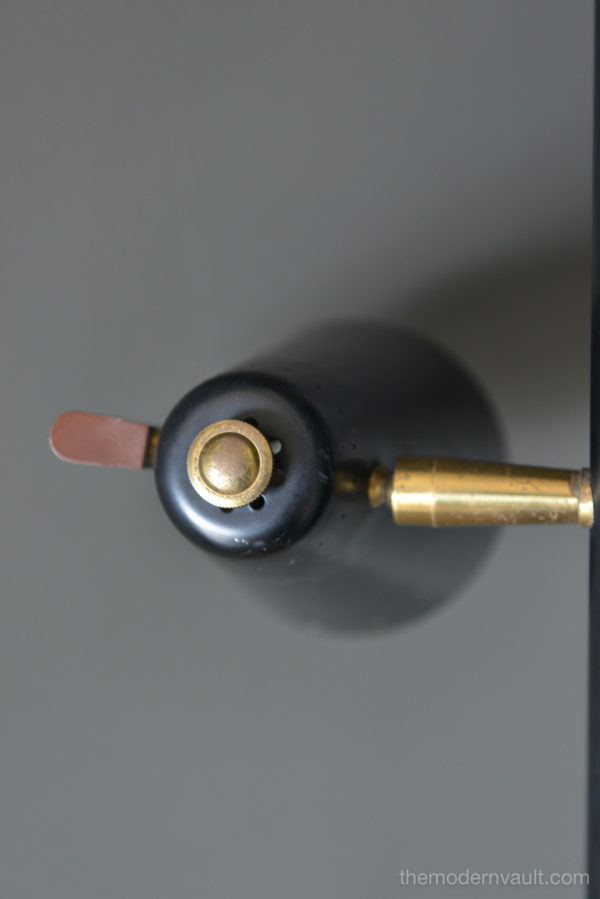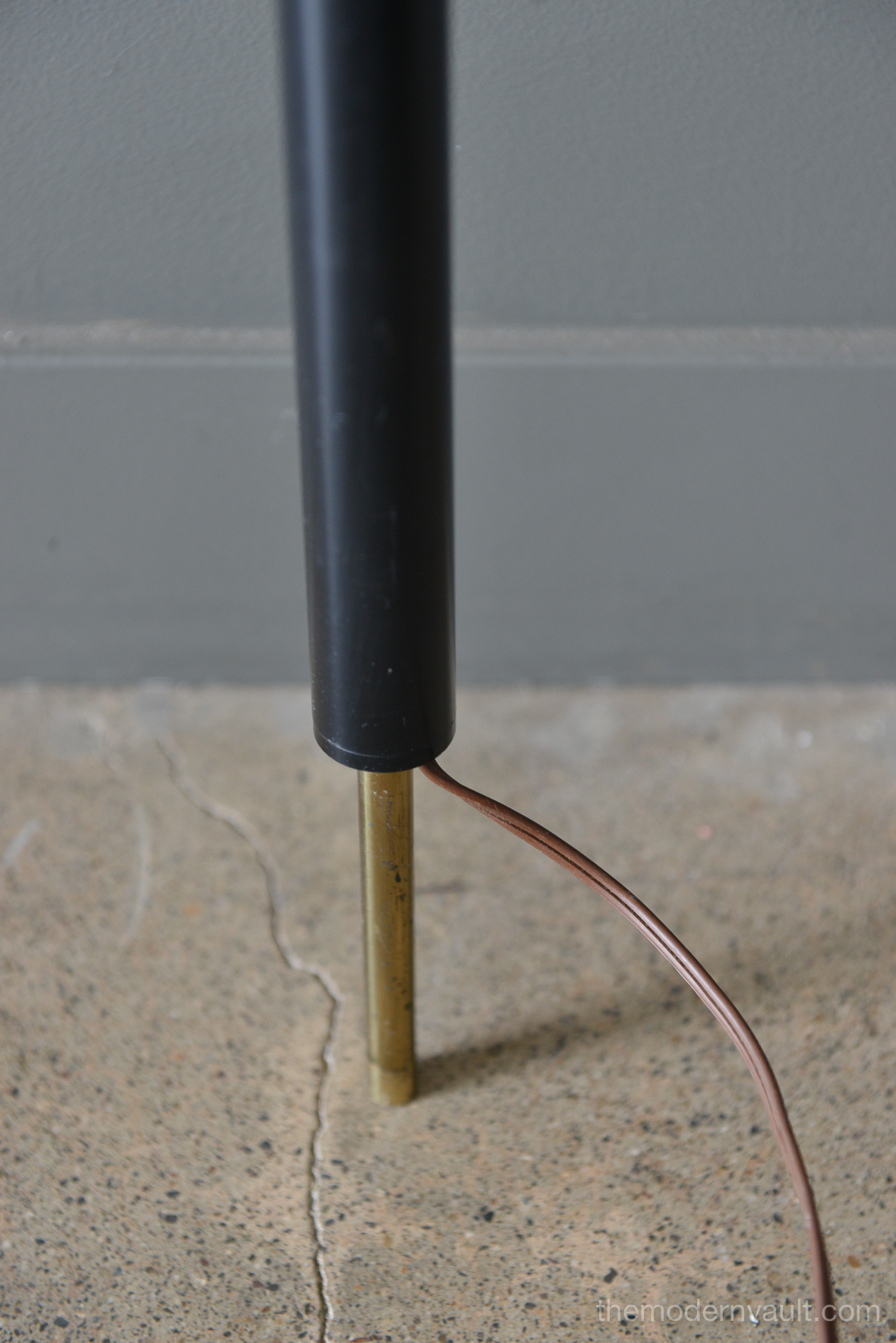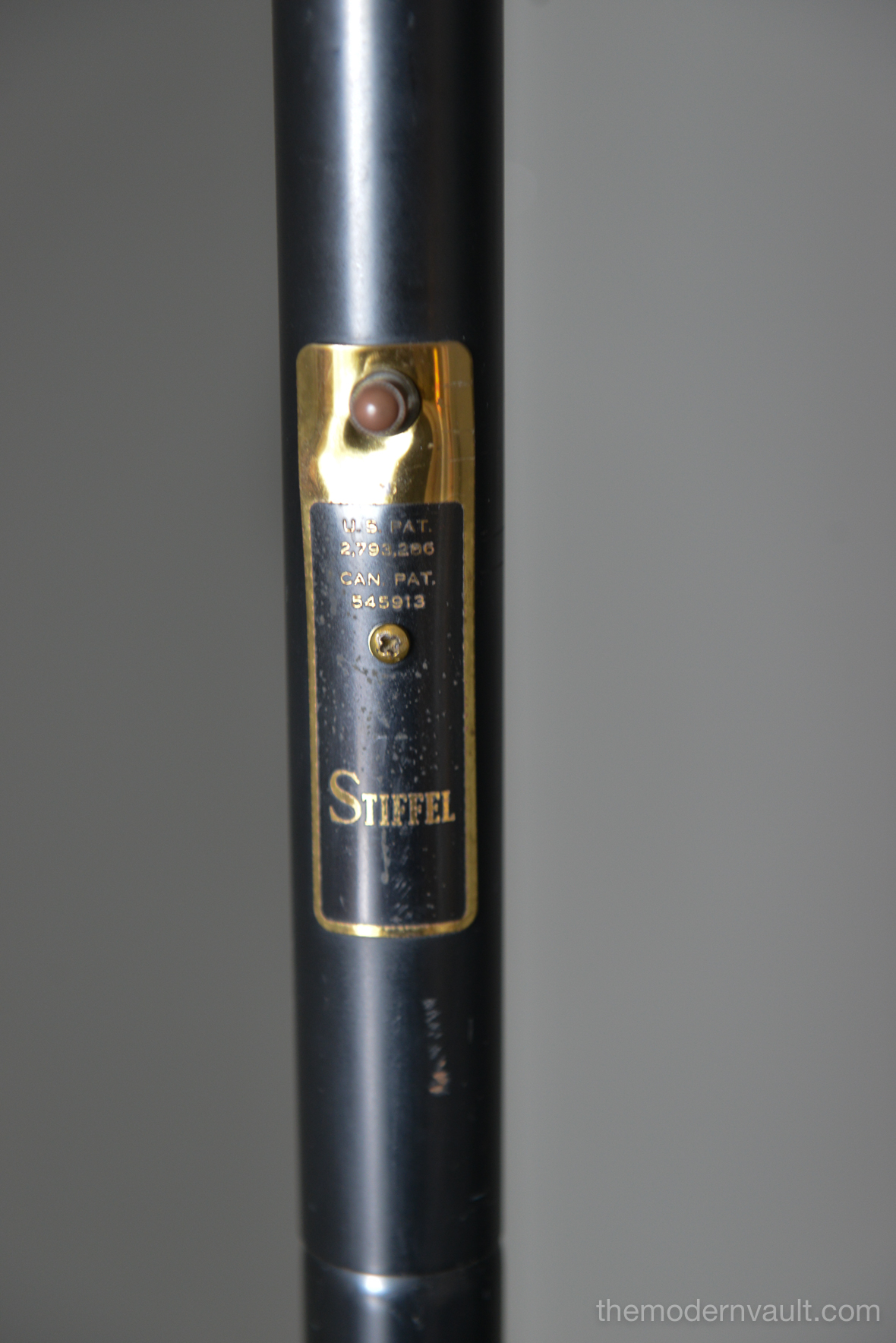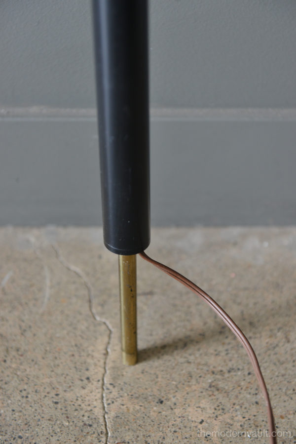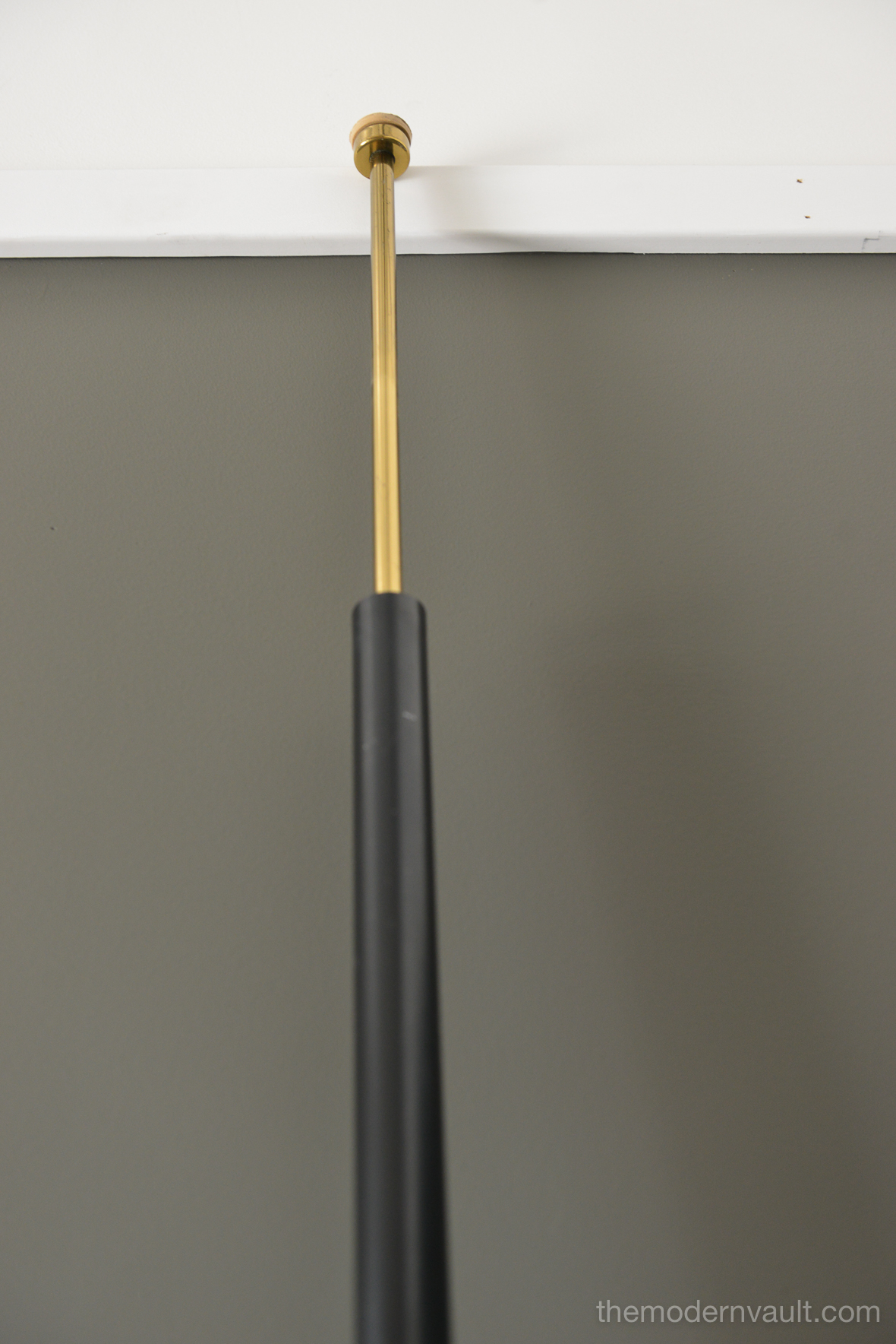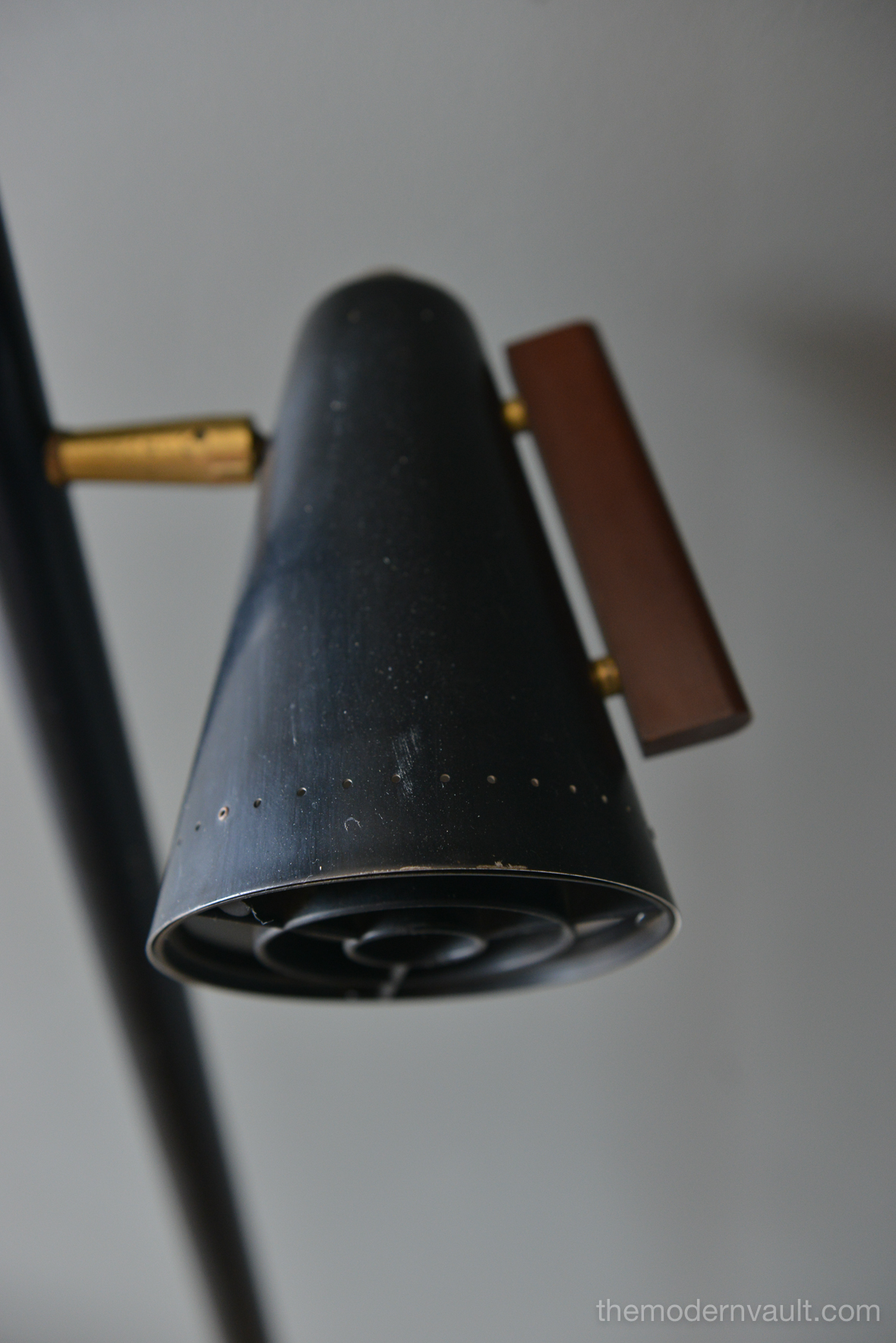Raymond Lowey for Stiffel tension pole lamp, circa 1965. Black enameled pole and shades with brass and teak accents. Lamp is in good working order, the switch is a 3 way that allows you to turn on each light separately. Retains makers mark on pole, original wiring. Some light patina to brass and some slight wear to shades. All shades have the original diffuser, which are often lost. Bottom pole missing a foot.