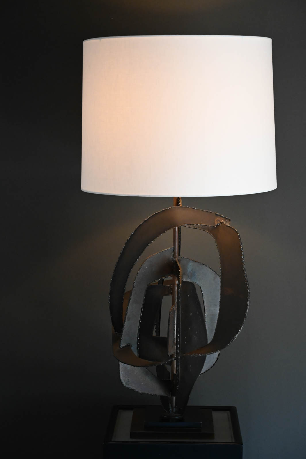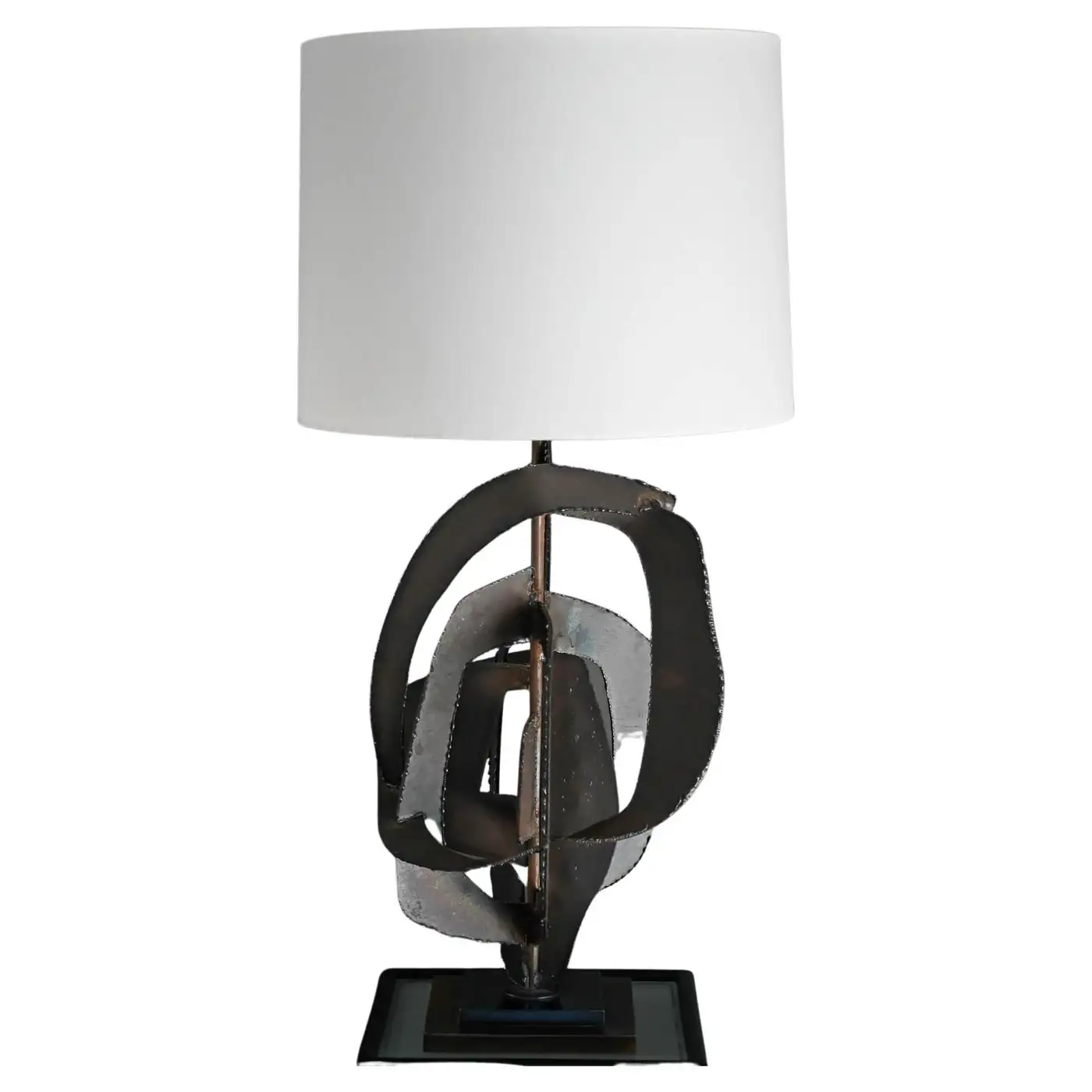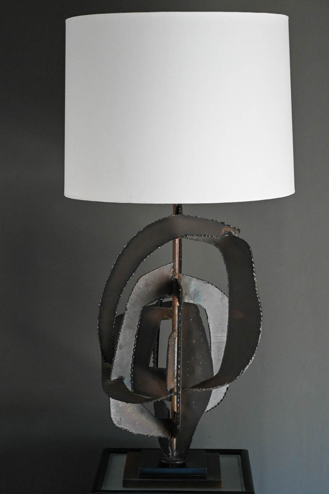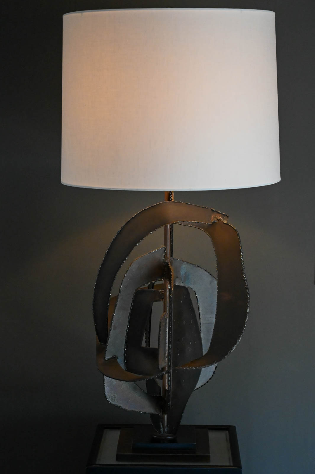 Richard Barr for Laurel Brutalist torch cut bronze and copper lamp, 1965. Model H-821, this beautiful and substantial bronze and textured copper base lamp is a statement for any room. All original in very good condition, the lamp stands as shown 45″ High. Designed by Richard Barr was a prominent designer for Laurel Lamp Company and this original appeared in the supplement B catalog in 1965. Measures as shown: 45″ H x 16″ Diameter. Height to neck switch is 31″. New Ivory Drum Shade Included.