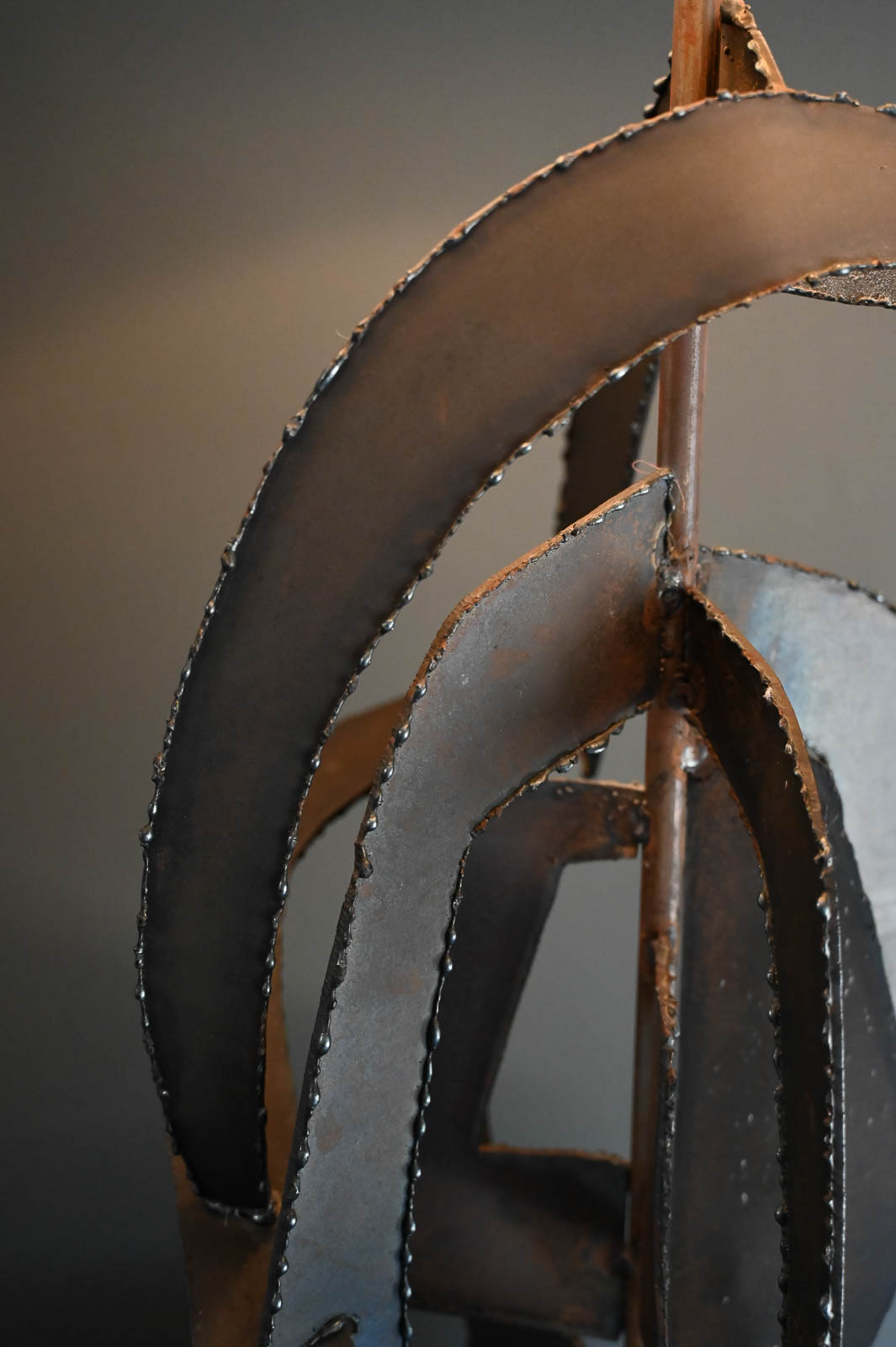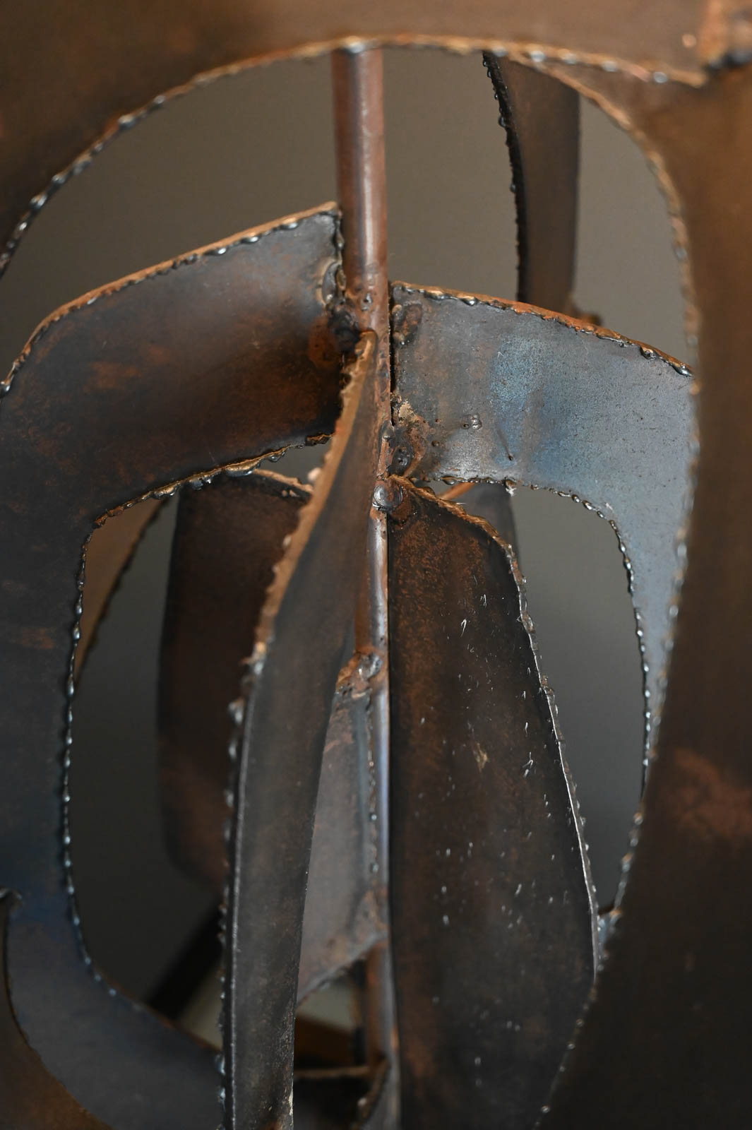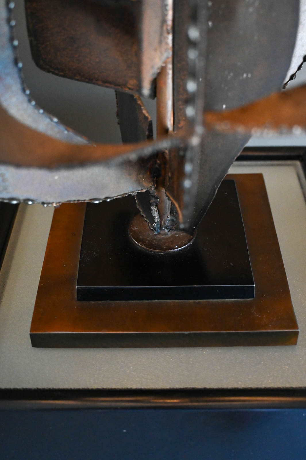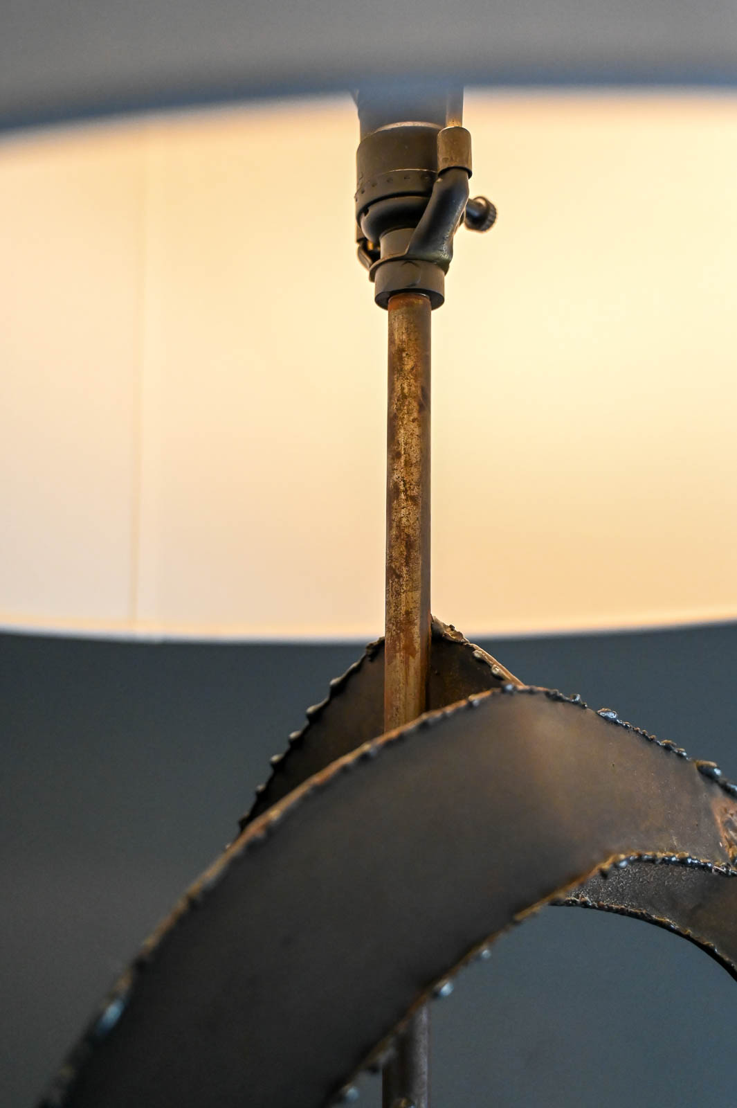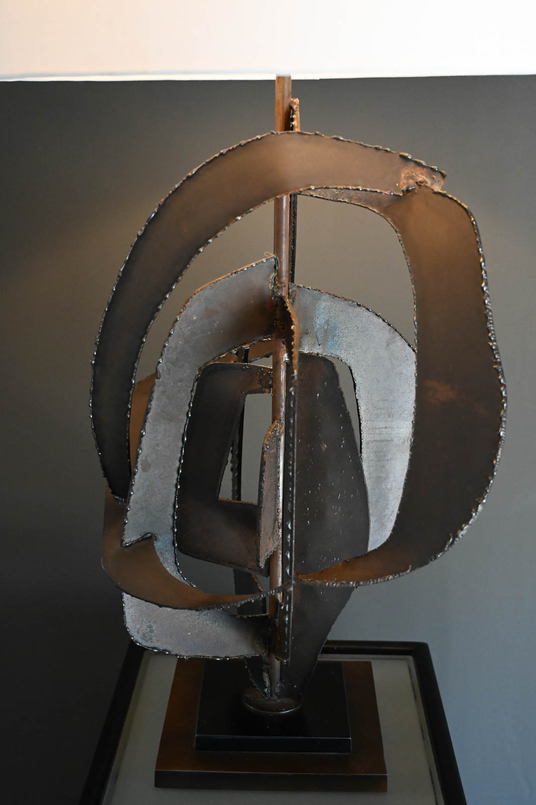 Richard Barr for Laurel Brutalist torch cut bronze and copper lamp, 1965. Model H-821, this beautiful and substantial bronze and textured copper base lamp is a statement for any room. All original in very good condition, the lamp stands as shown 45″ High. Designed by Richard Barr was a prominent designer for Laurel Lamp Company and this original appeared in the supplement B catalog in 1965. Measures as shown: 45″ H x 16″ Diameter. Height to neck switch is 31″. New Ivory Drum Shade Included.
