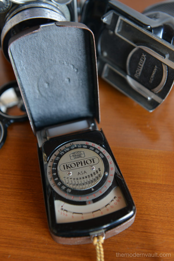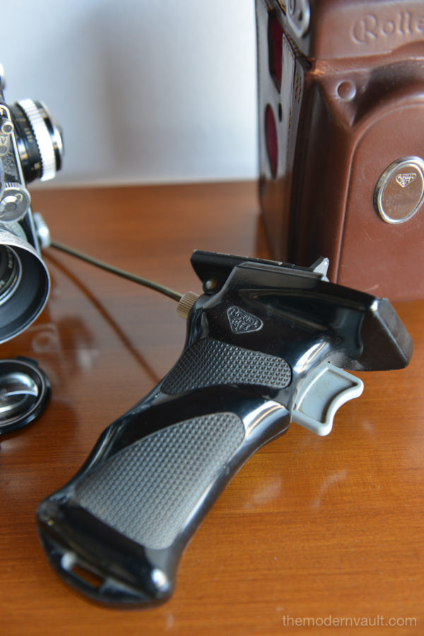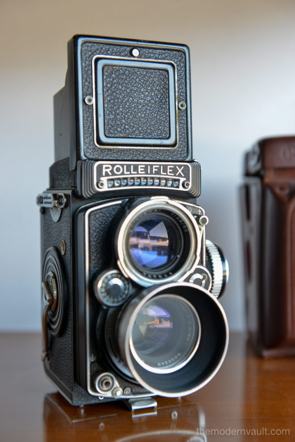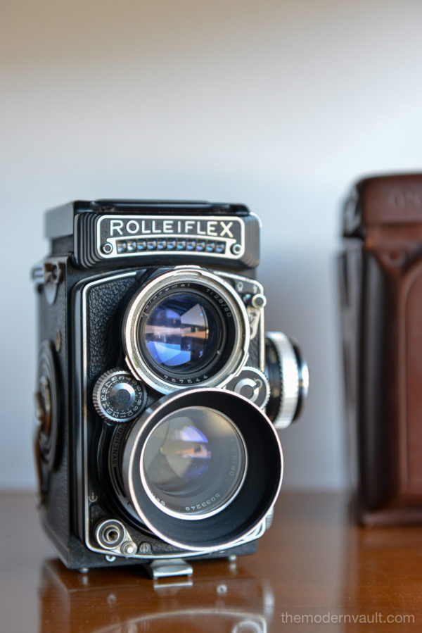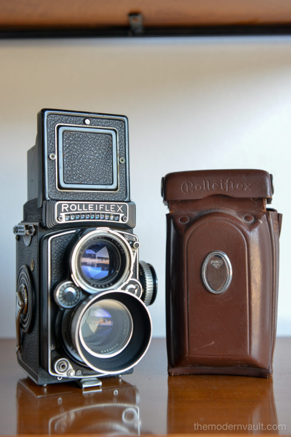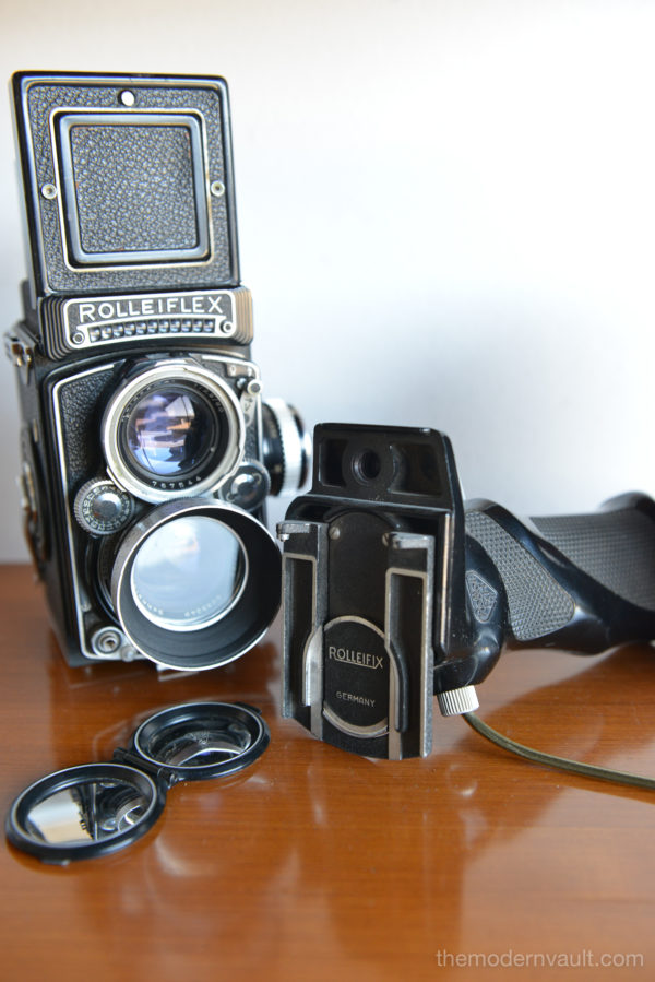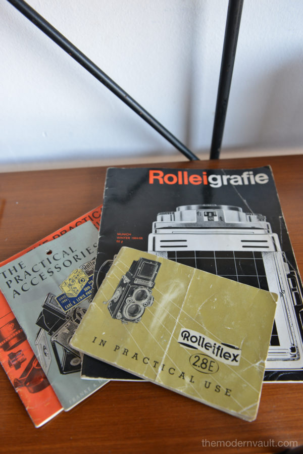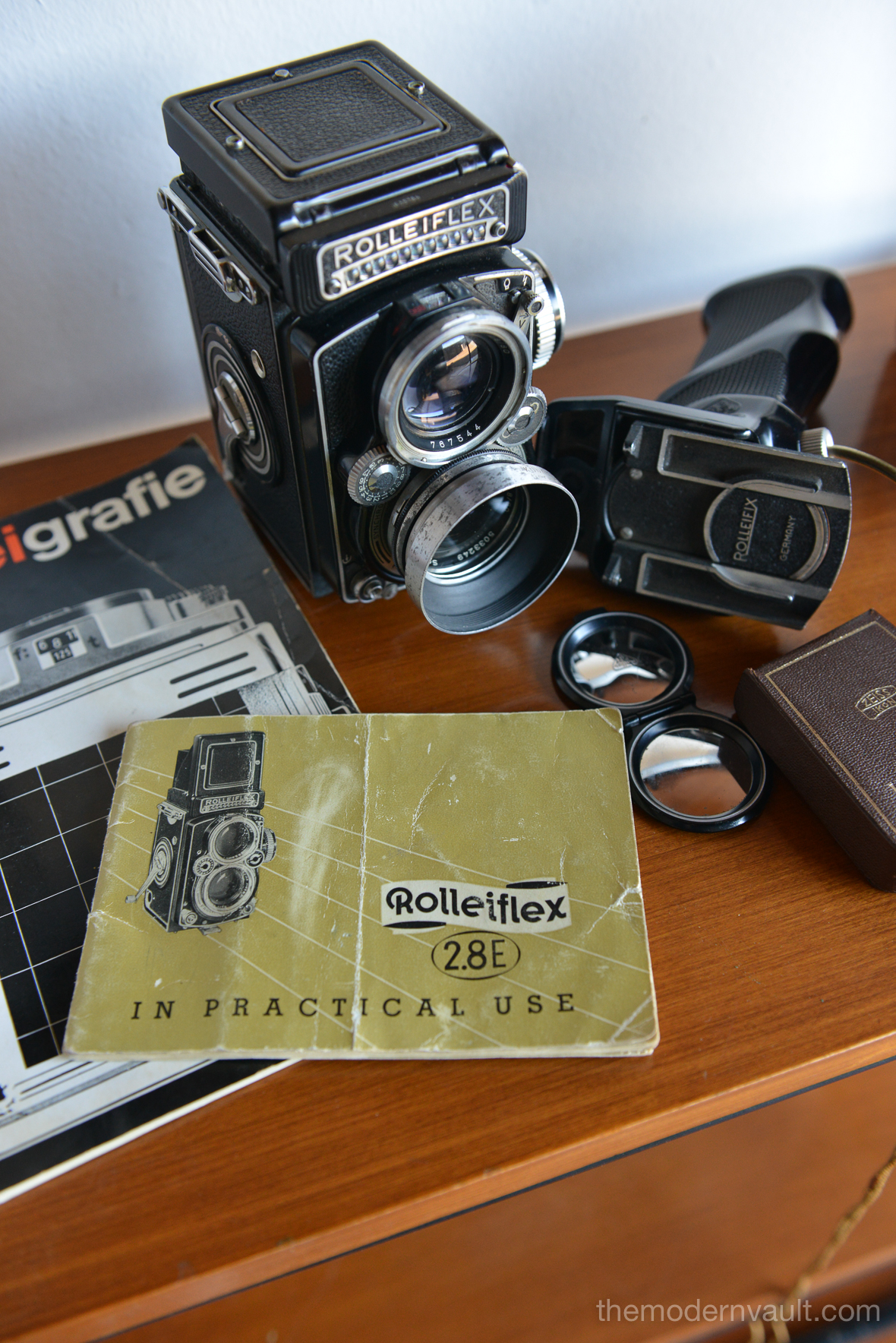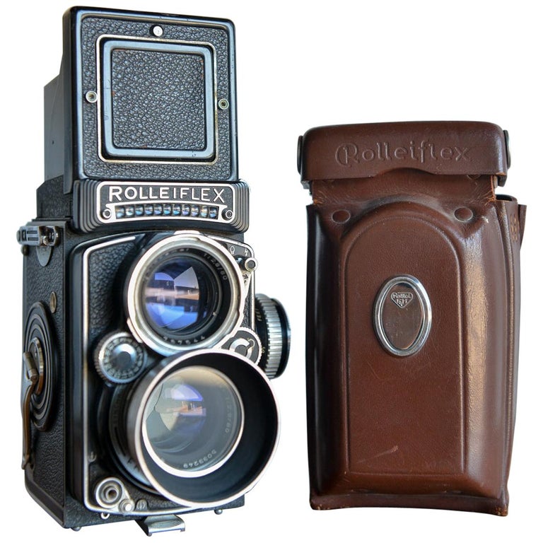 Rolleiflex 2.8E TLR Medium Format Camera with case and accessories, circa 1958. Schneider-Kreuznach Xenotar 2.8 Lens Includes original pistol grip shutter release, Ikophot Light Meter, lens cap, lens hood, original manuals and Rolleigrafie magazine from 1964-1965. Viewfinder is bright and in good condition. Light meter glass is missing as shown, however is still working. Camera will need to be serviced, aperture ring is sticky, Needs CLA, there are several in the U.S. that are authorized, please contact us for details.