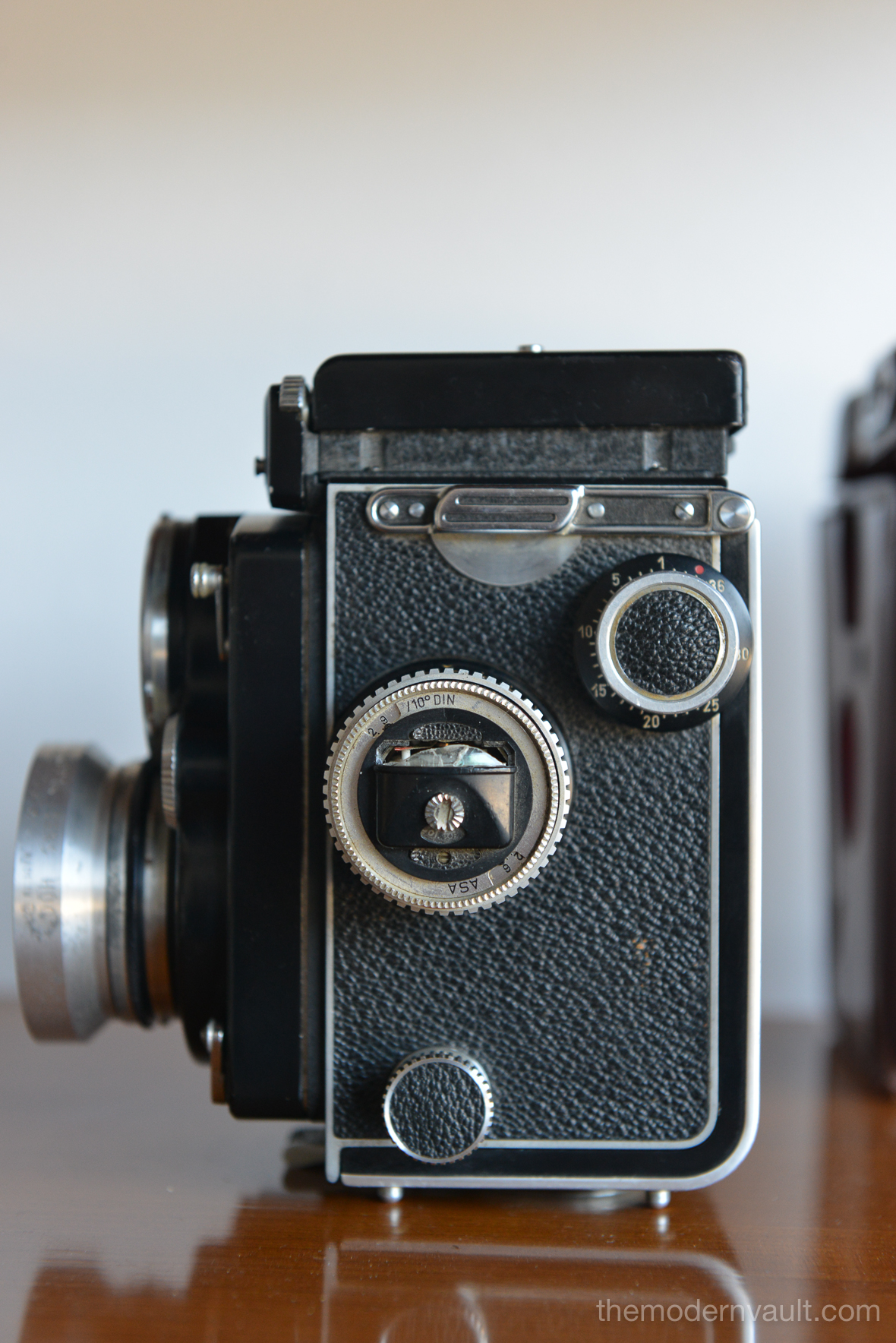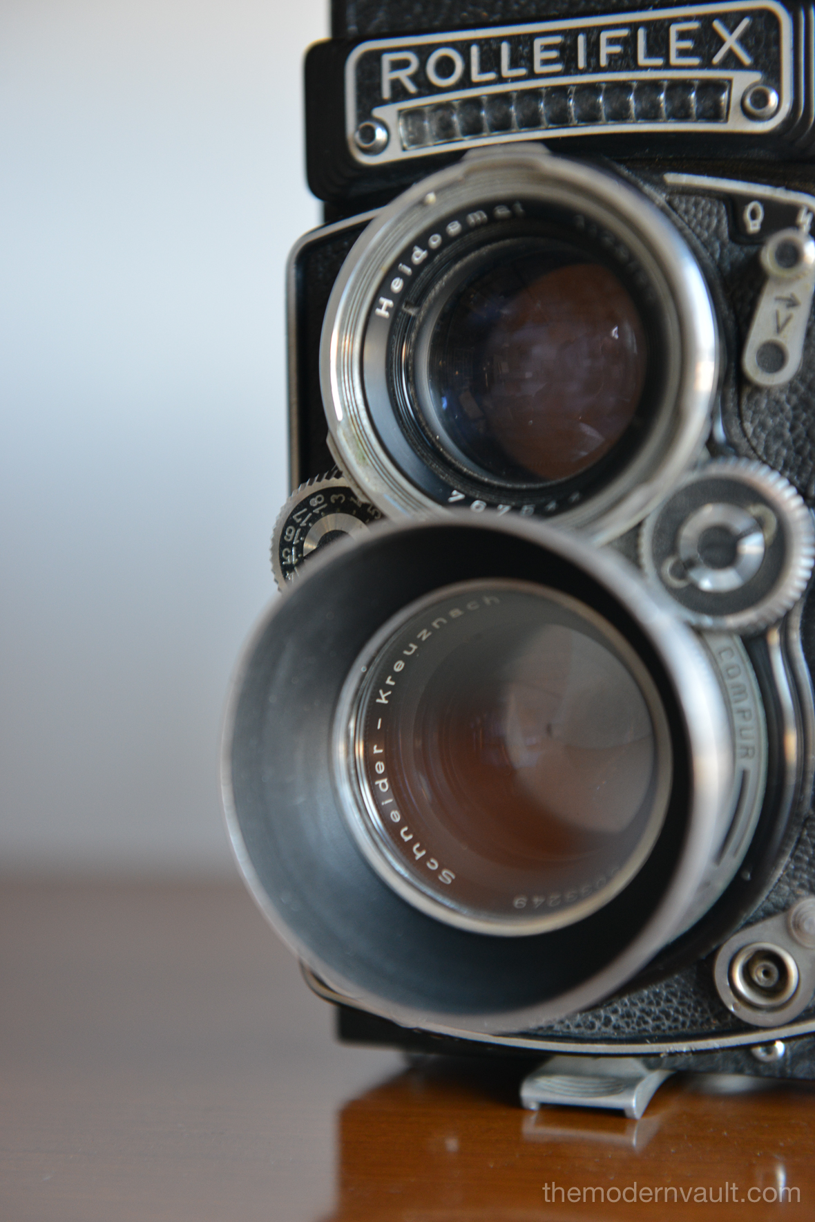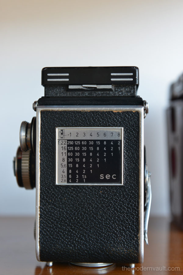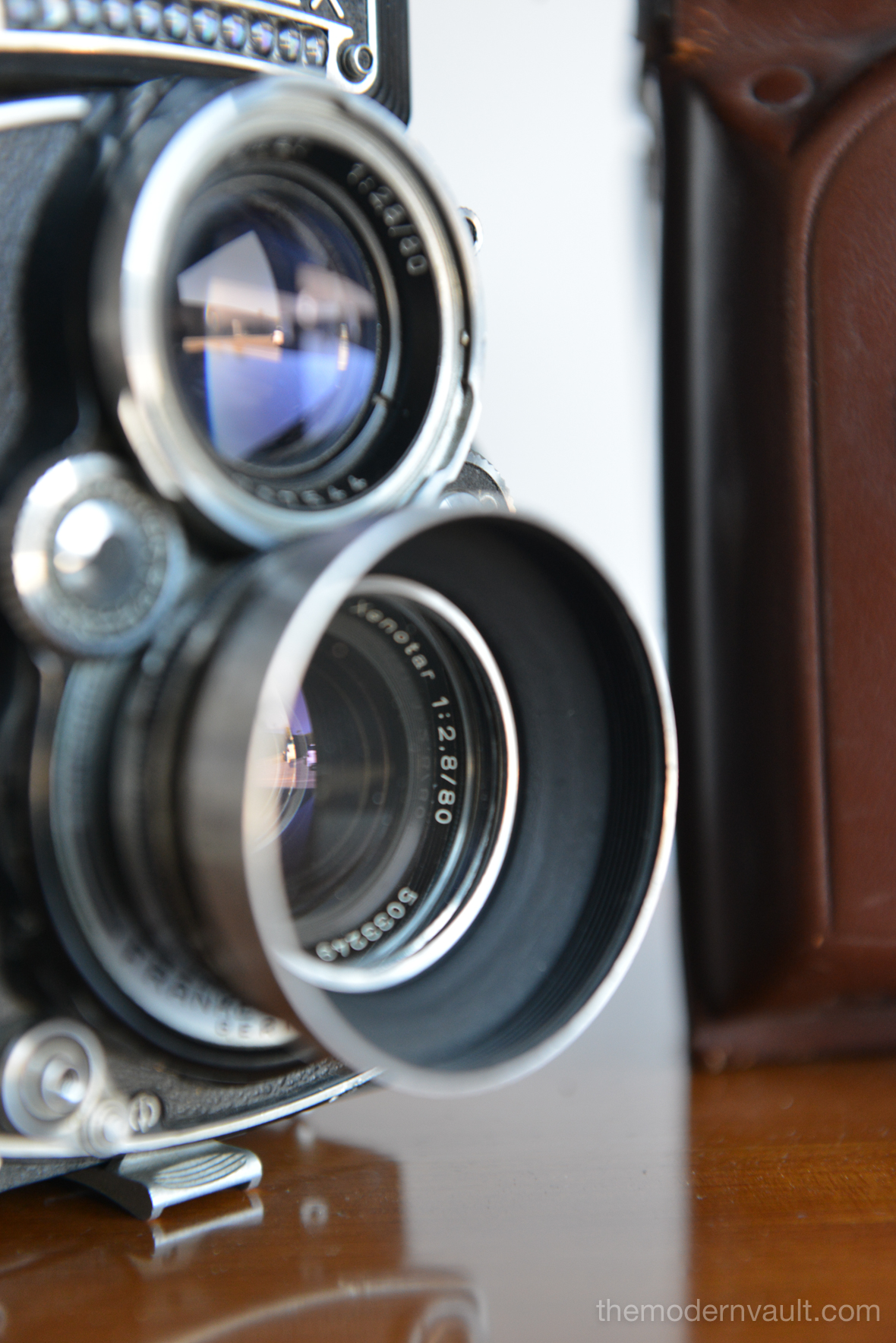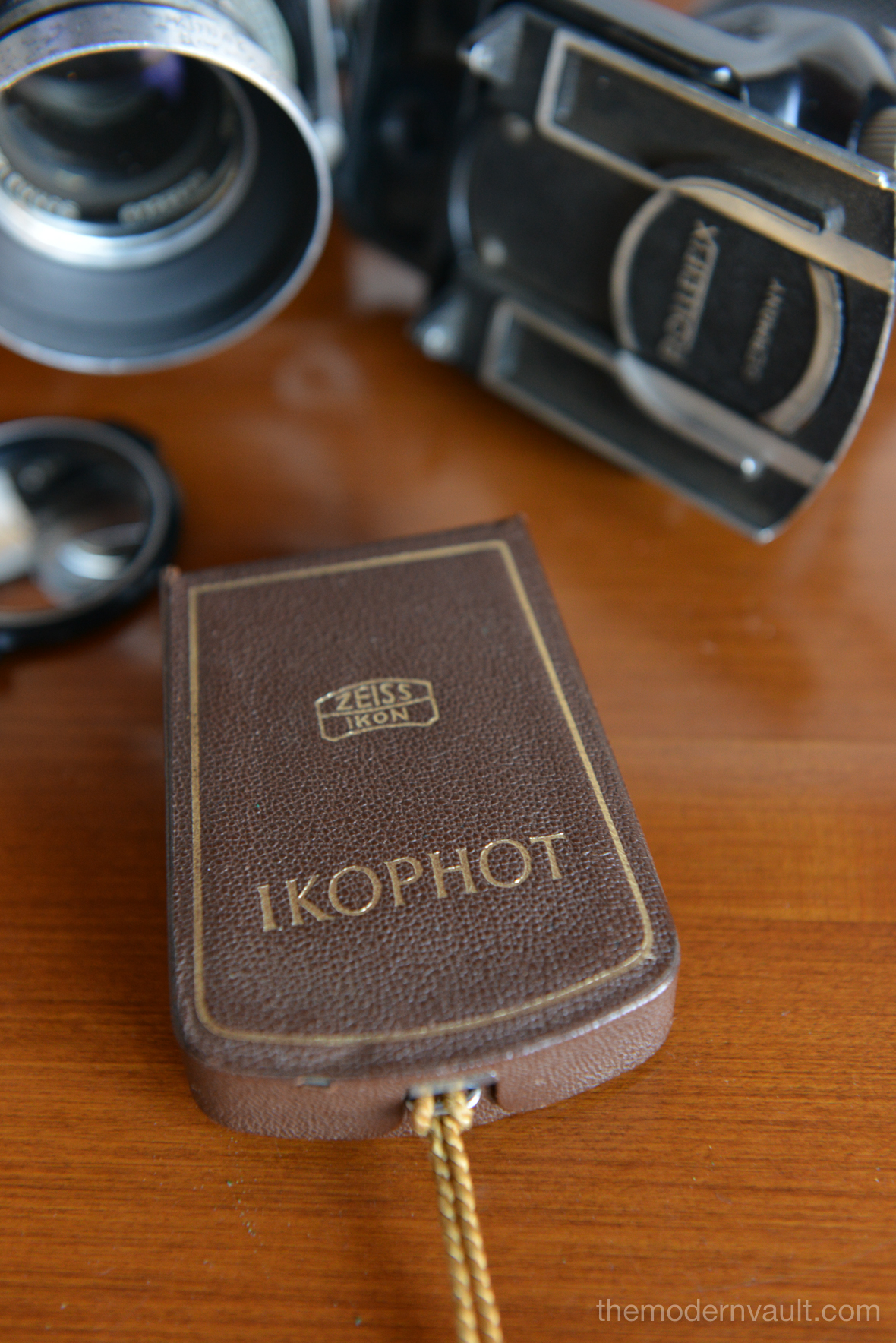 Rolleiflex 2.8E TLR Medium Format Camera with case and accessories, circa 1958. Schneider-Kreuznach Xenotar 2.8 Lens Includes original pistol grip shutter release, Ikophot Light Meter, lens cap, lens hood, original manuals and Rolleigrafie magazine from 1964-1965. Viewfinder is bright and in good condition. Light meter glass is missing as shown, however is still working. Camera will need to be serviced, aperture ring is sticky, Needs CLA, there are several in the U.S. that are authorized, please contact us for details.