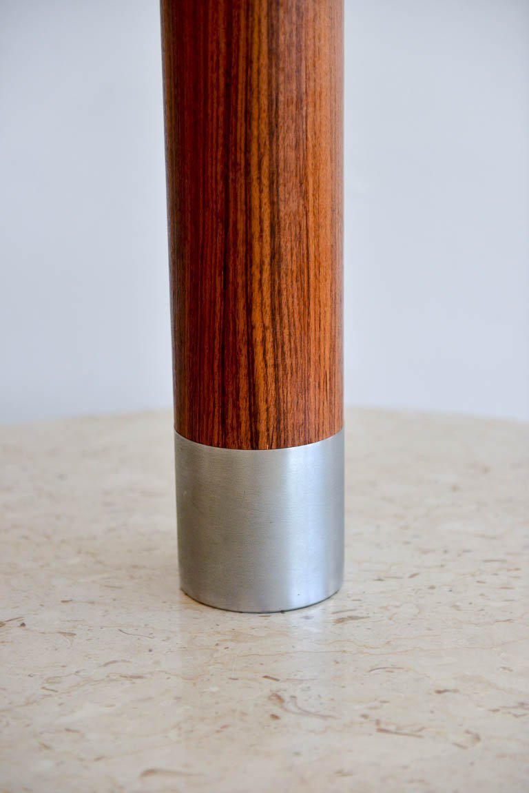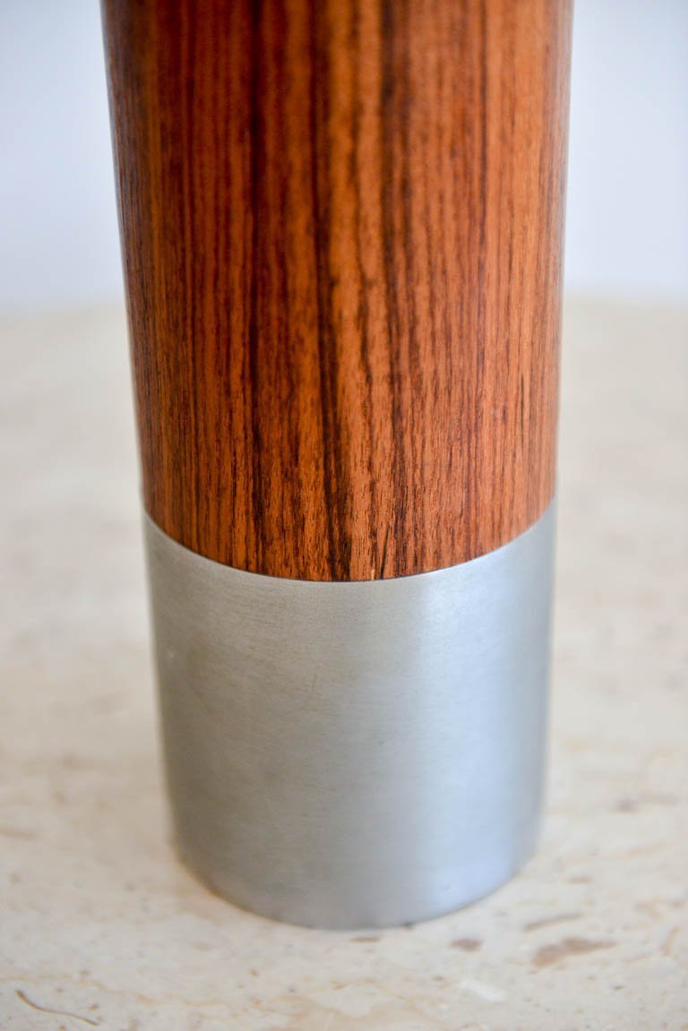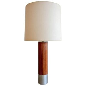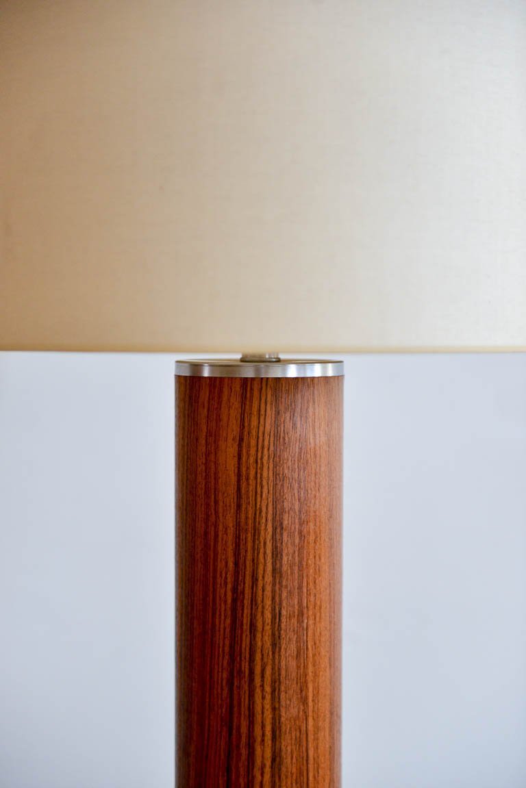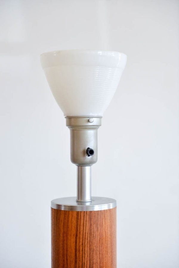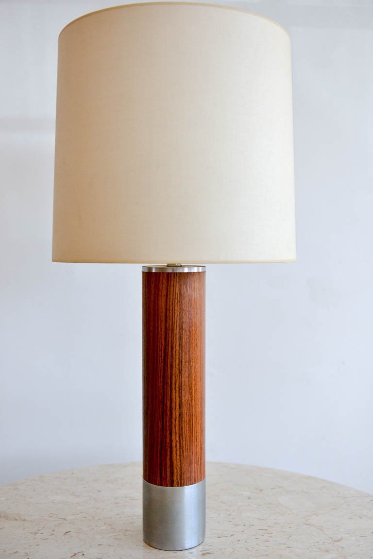 Rosewood and brushed aluminium cylinder table lamp by Laurel, circa 1970. Original glass diffuser and shade. Original wiring, excellent original condition. Can be seen in our Modern Vault Showroom at 361 Old Newport Blvd, Newport Beach, CA.