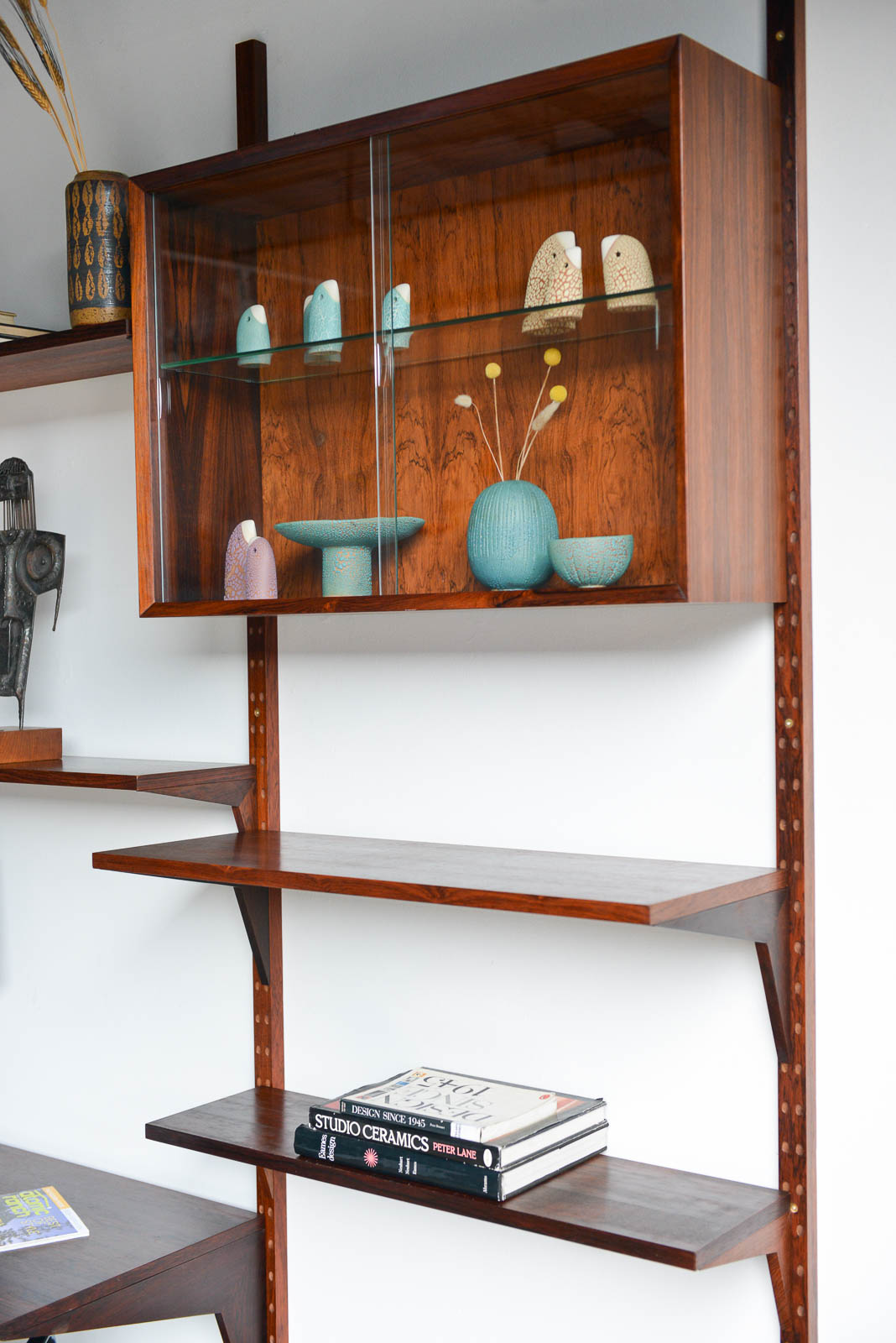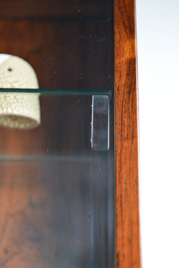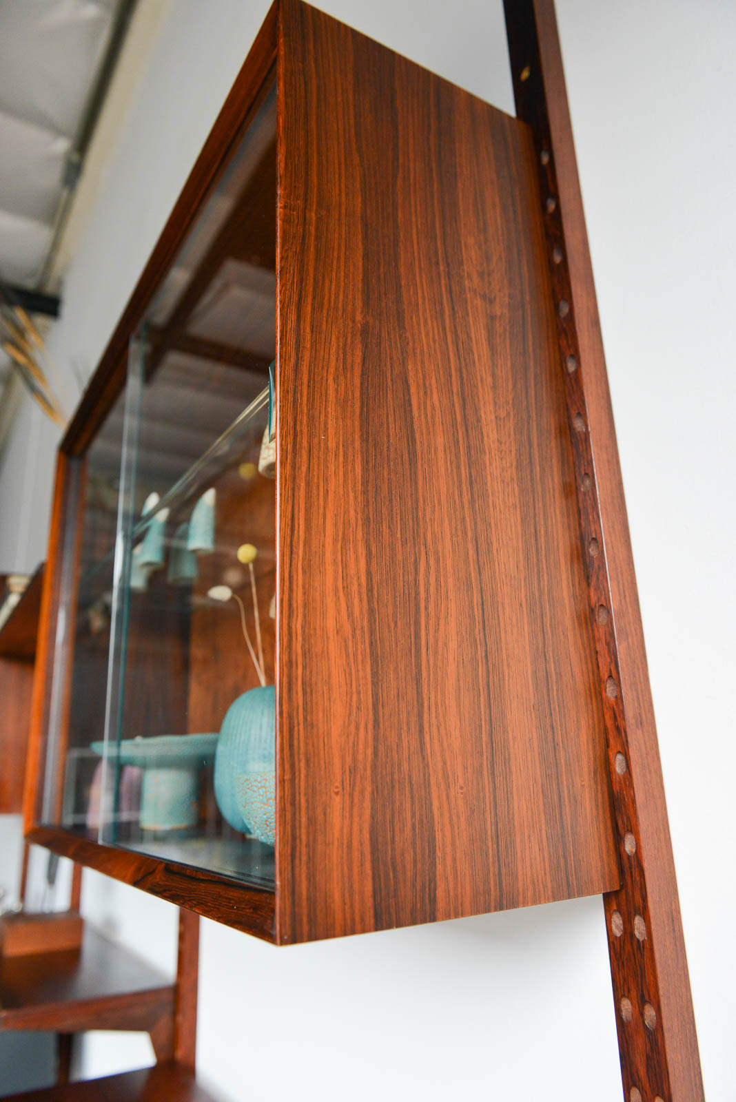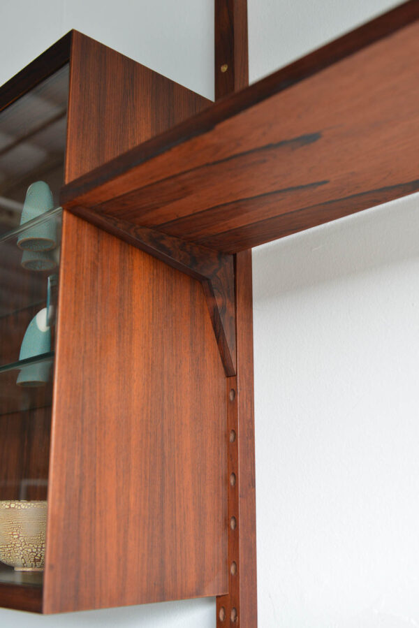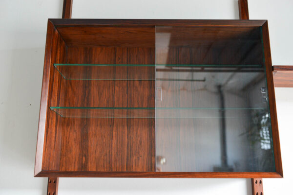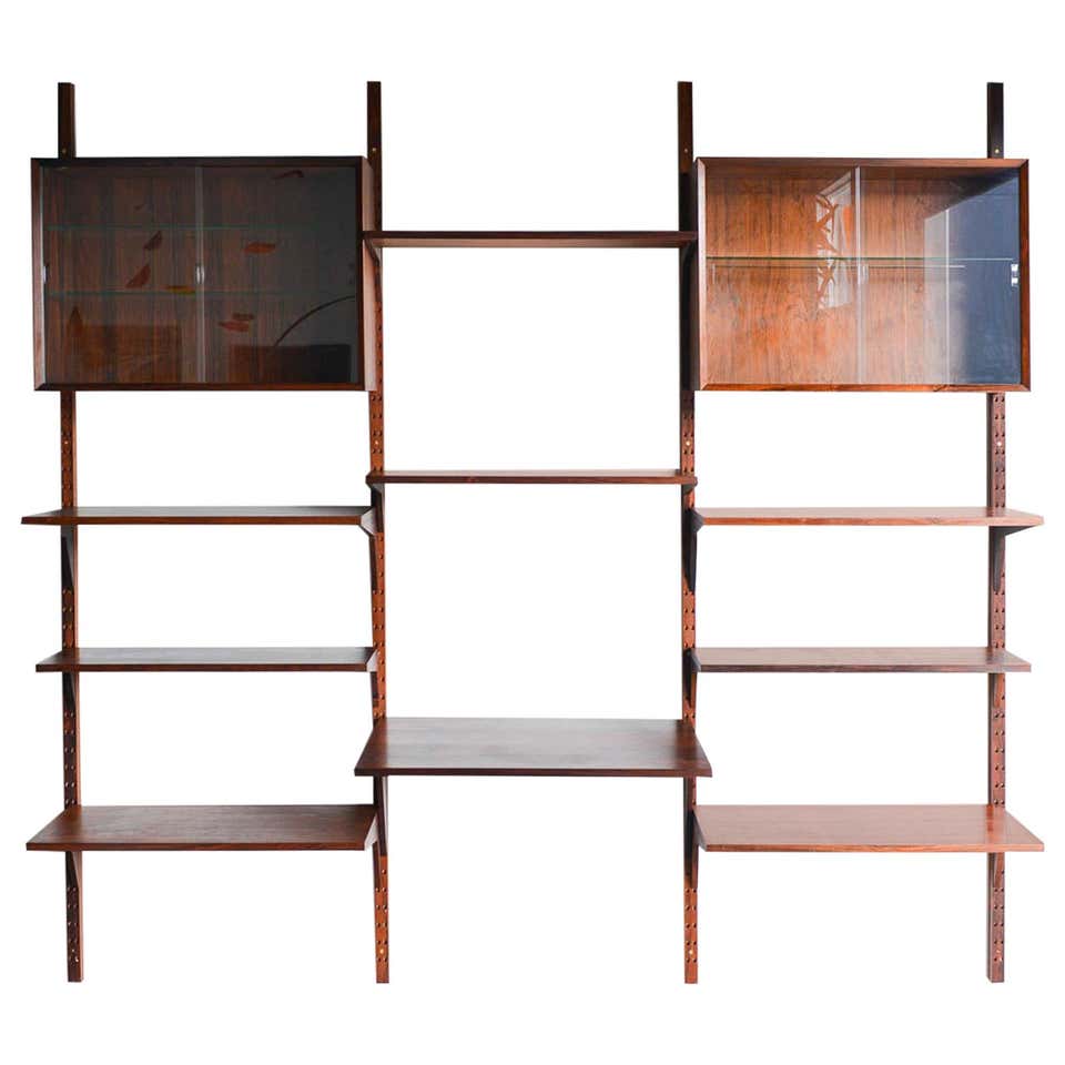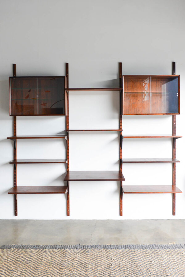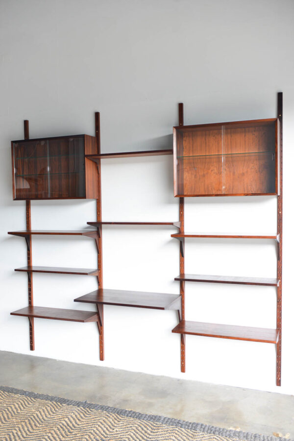 Rosewood Poul Cadovius 3 bay wall or shelving unit, circa 1970. Possibly one of the finest wall units we have ever acquired, this piece is in pristine vintage condition with hardly any wear to shelves or poles. Exceptional rare old growth rosewood with amazing grain on all the pieces including the poles. The glass doors are free of chips and are original, including the glass shelves and shelf clips inside. Looks unused and was in storage for over 15 years by the original owner.