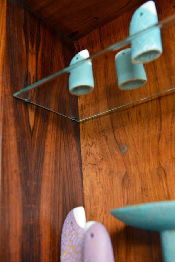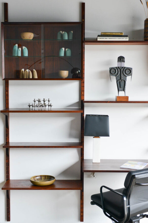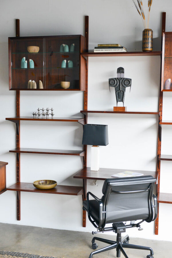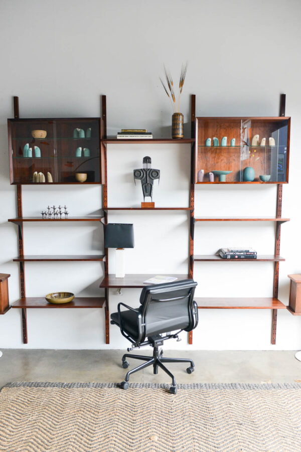 4 rosewood poles 91″ H Measures as shown 91″ H x 95″ W x 18″ D at widest (largest desk shelf).
