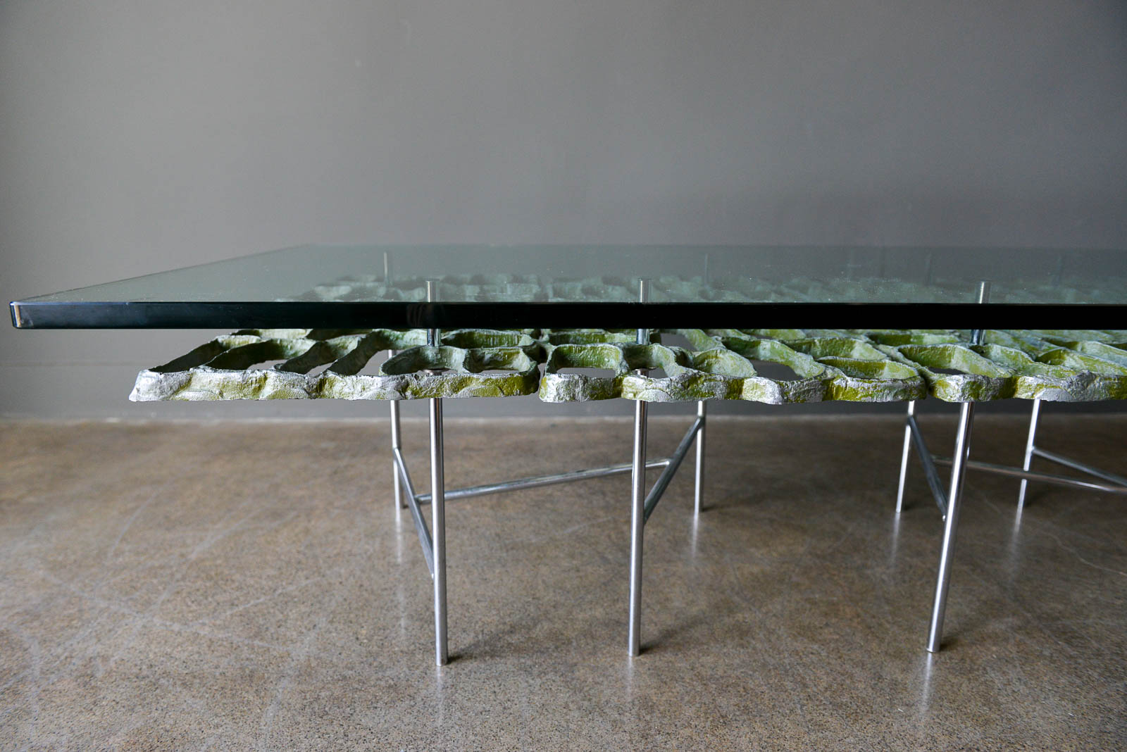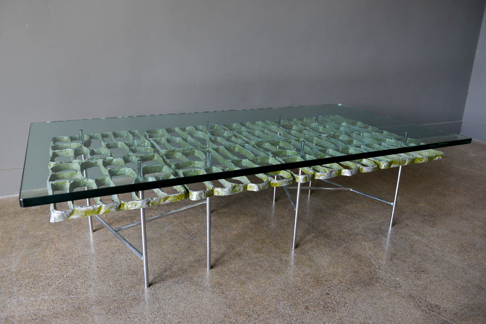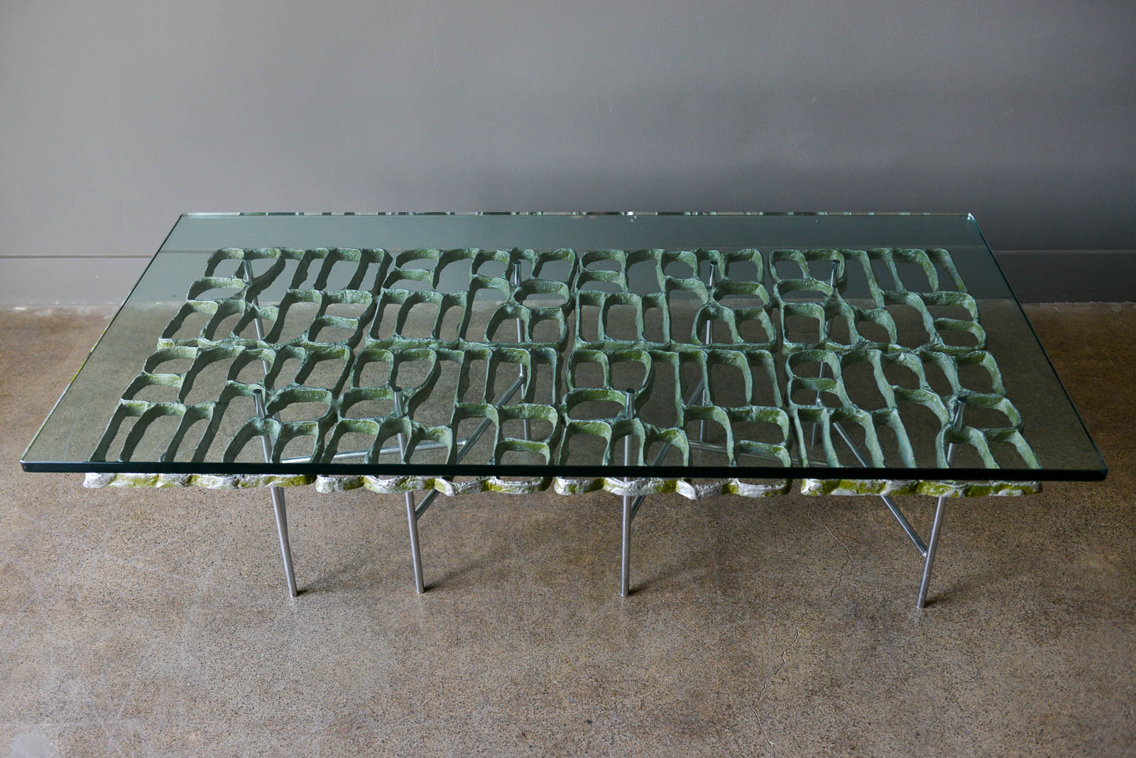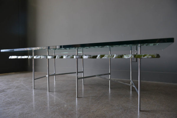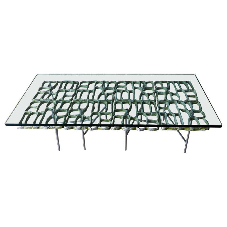 Sculptural Brutalist coffee table by Artist Donald Drumm, circa 1970. Brutalist design with new floating top 3/4″ thick glass. Legs are free of rust or patina and there is wonderful patina to the cast aluminum metalwork frame. Three dimensional with asymmetrical chromed base.