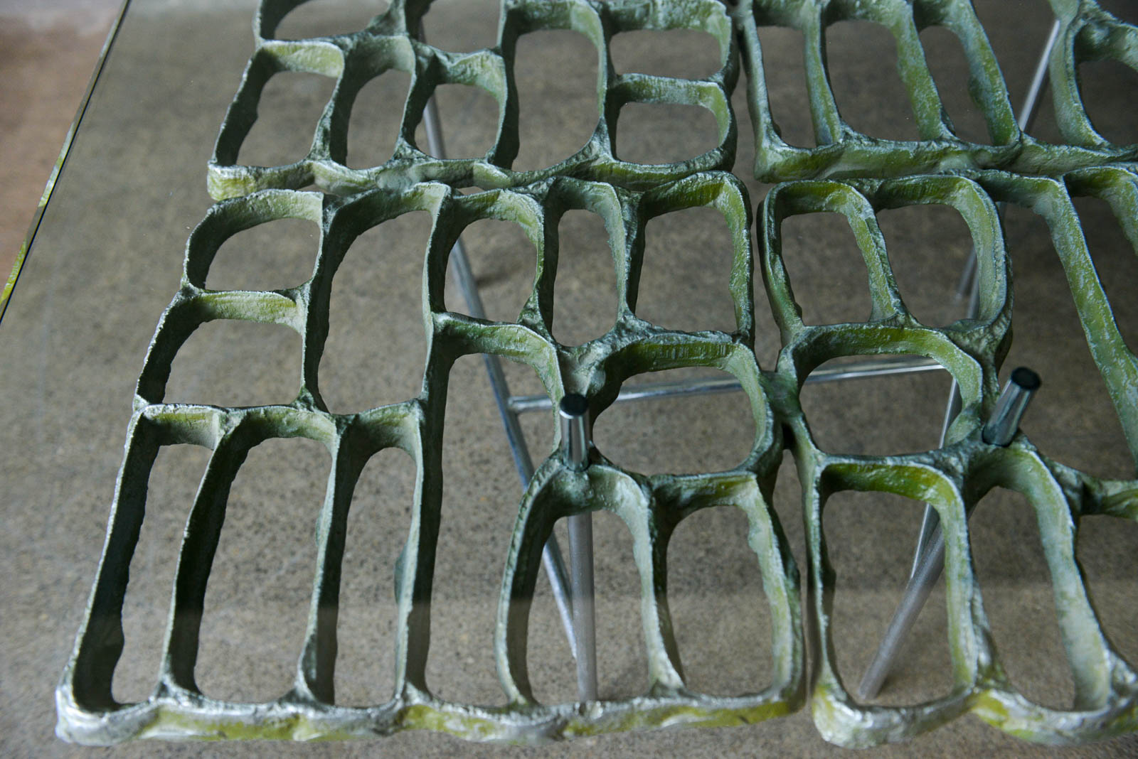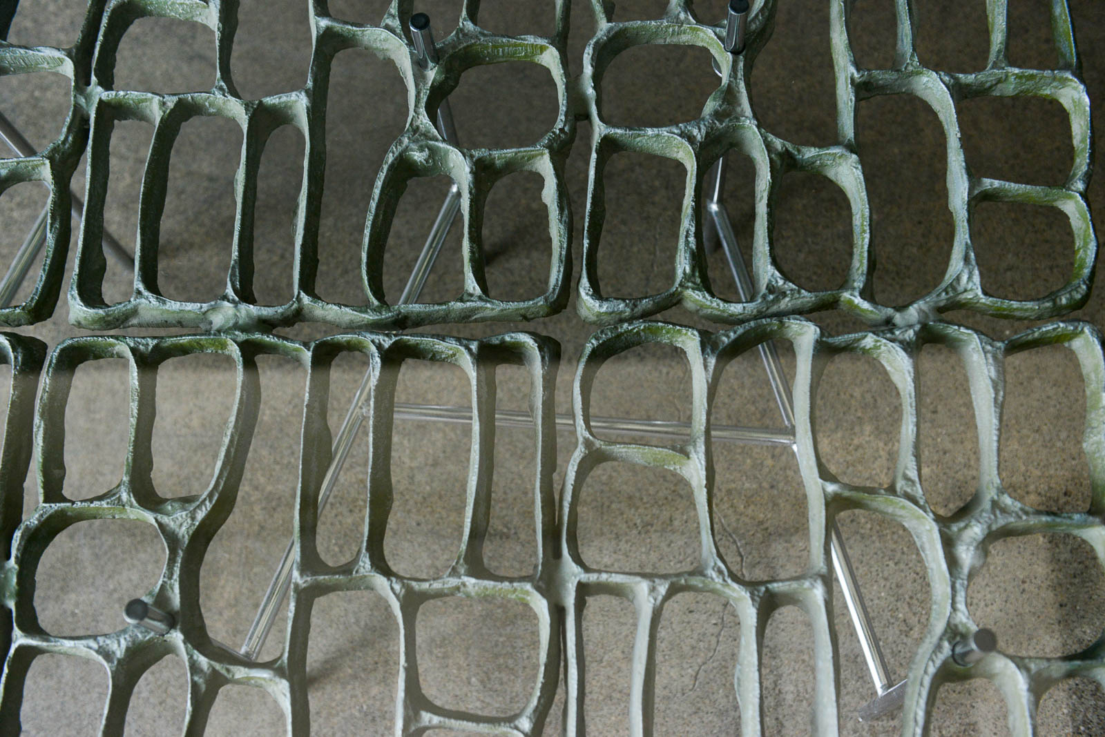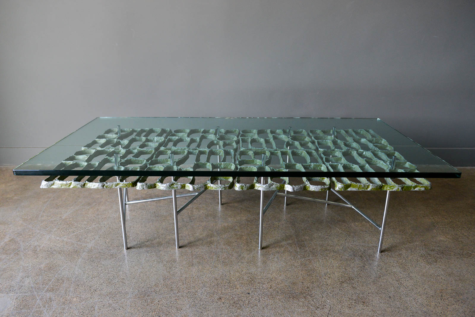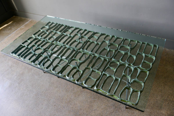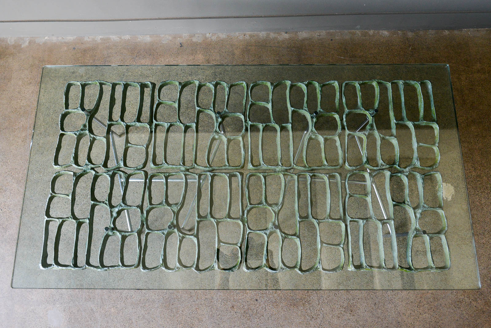Sculptural Brutalist coffee table by Artist Donald Drumm, circa 1970. Brutalist design with new floating top 3/4″ thick glass. Legs are free of rust or patina and there is wonderful patina to the cast aluminum metalwork frame. Three dimensional with asymmetrical chromed base.