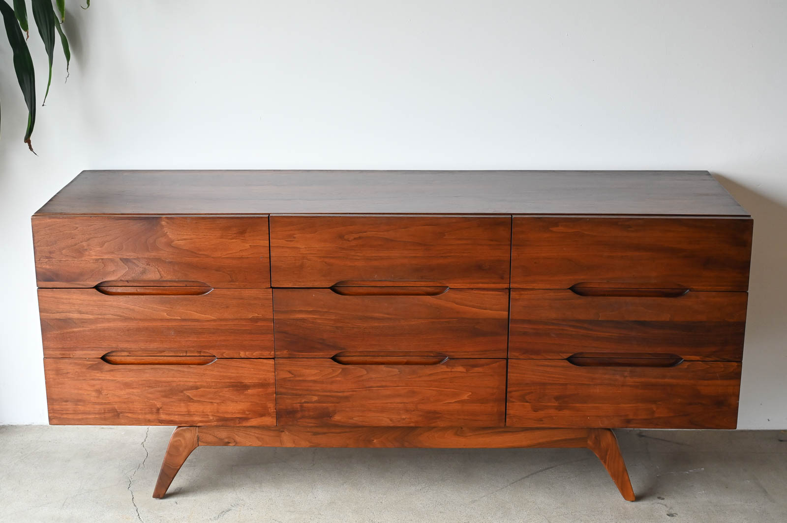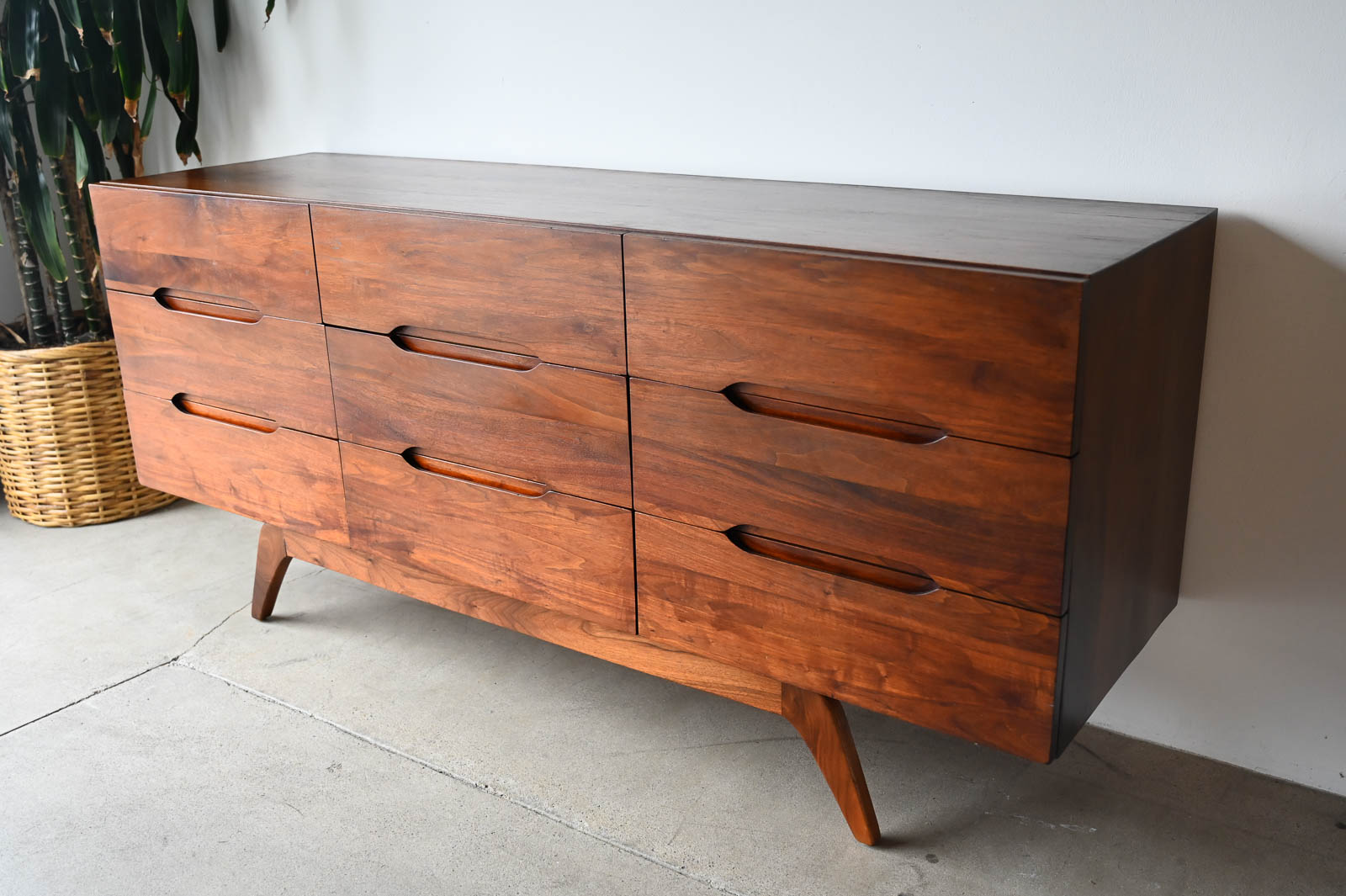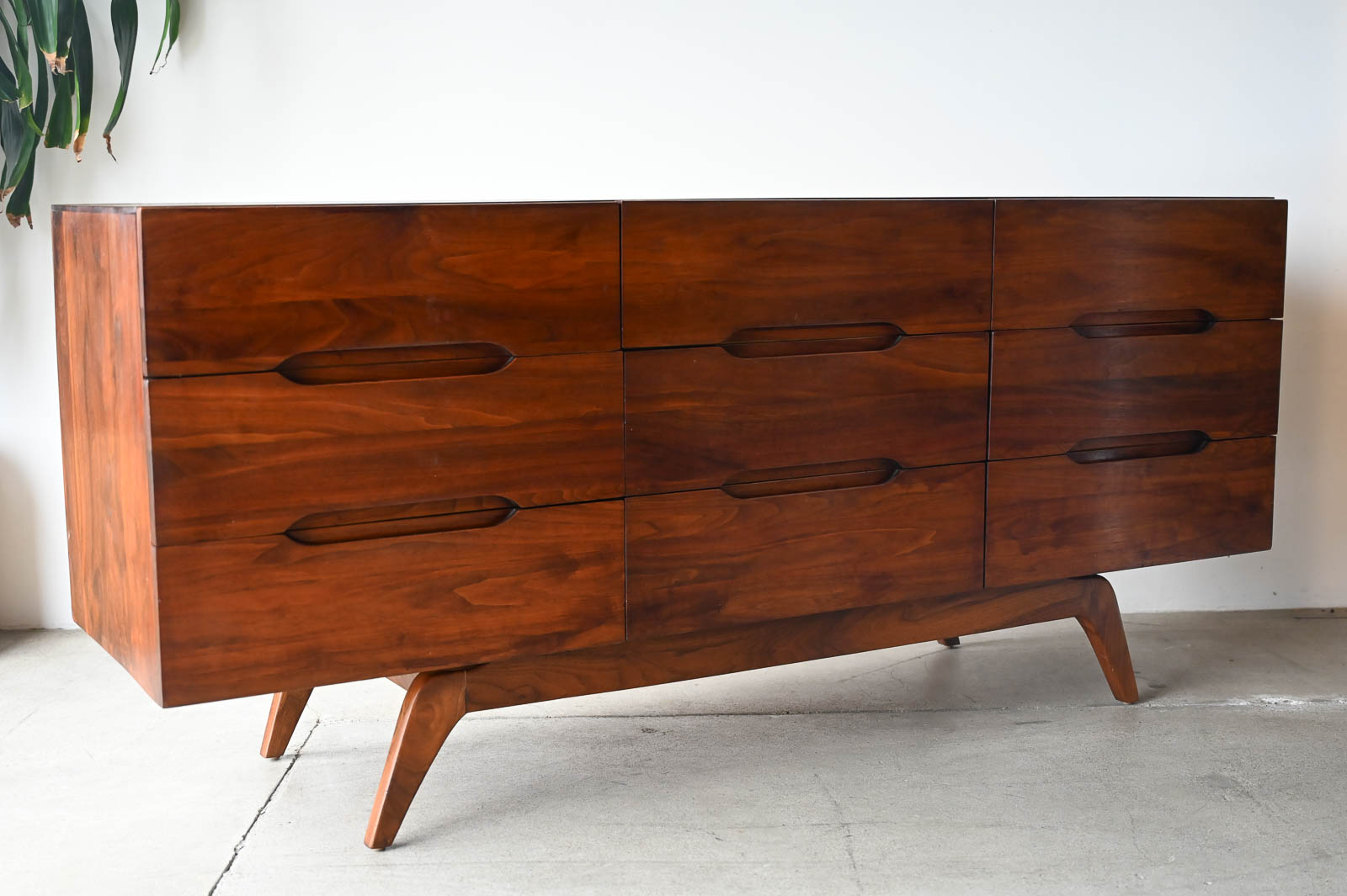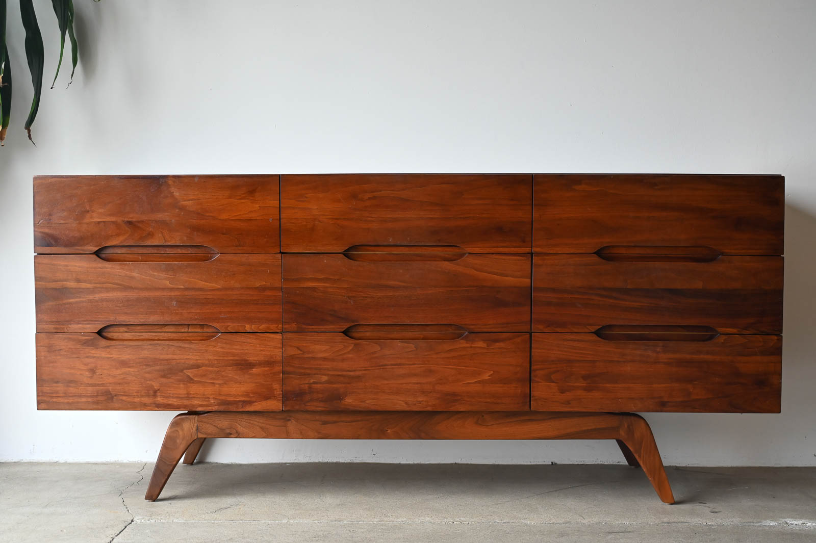 Sculptural walnut nine-drawer dresser or credenza, circa 1965. Solid walnut, not veneer, dovetail drawers and recessed sculpted pulls on a splayed leg base. Gorgeous walnut grain. Excellent original condition with hand oiled finish. Measures 66″ W x 19″ D x 30″ H.