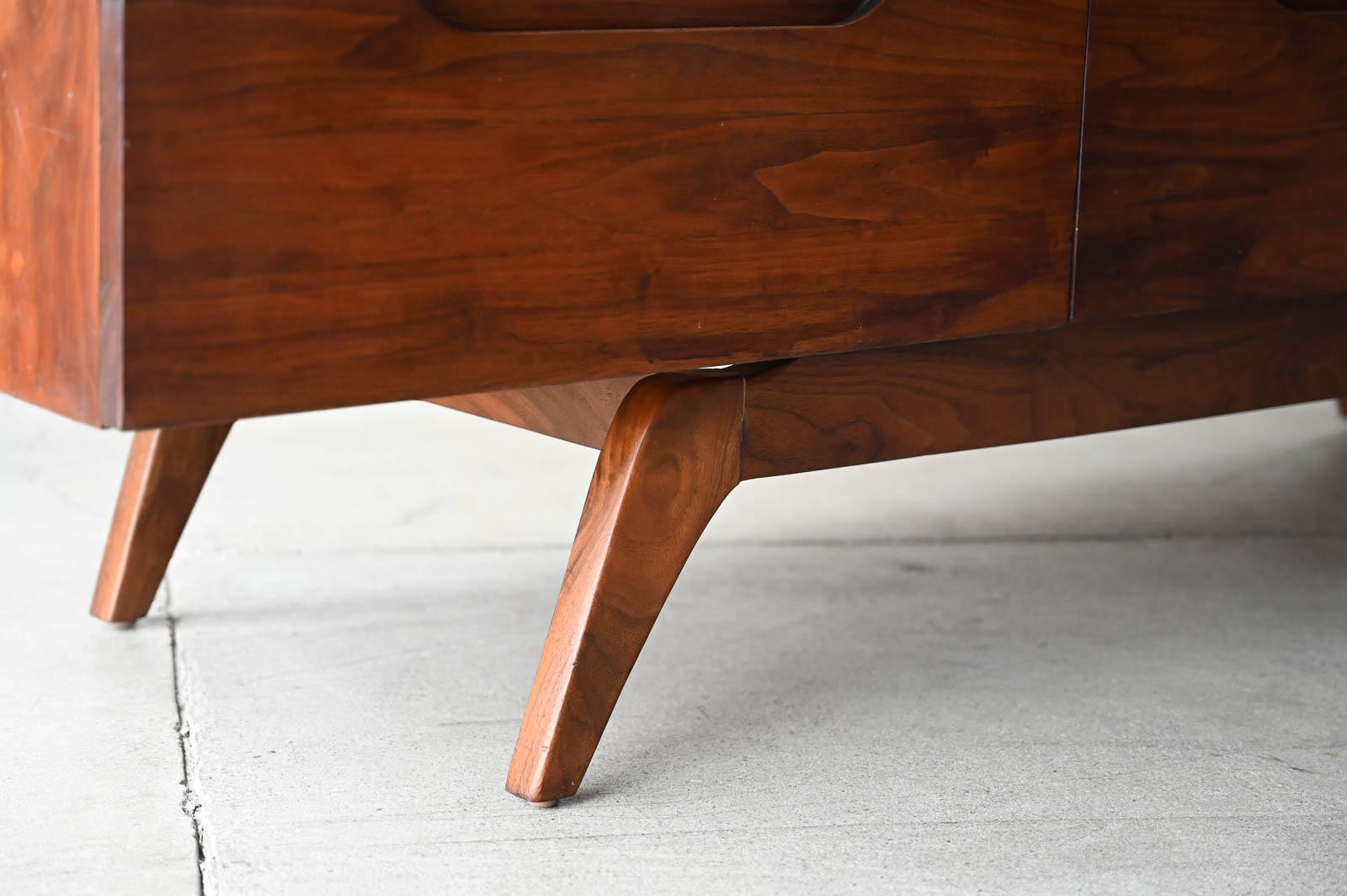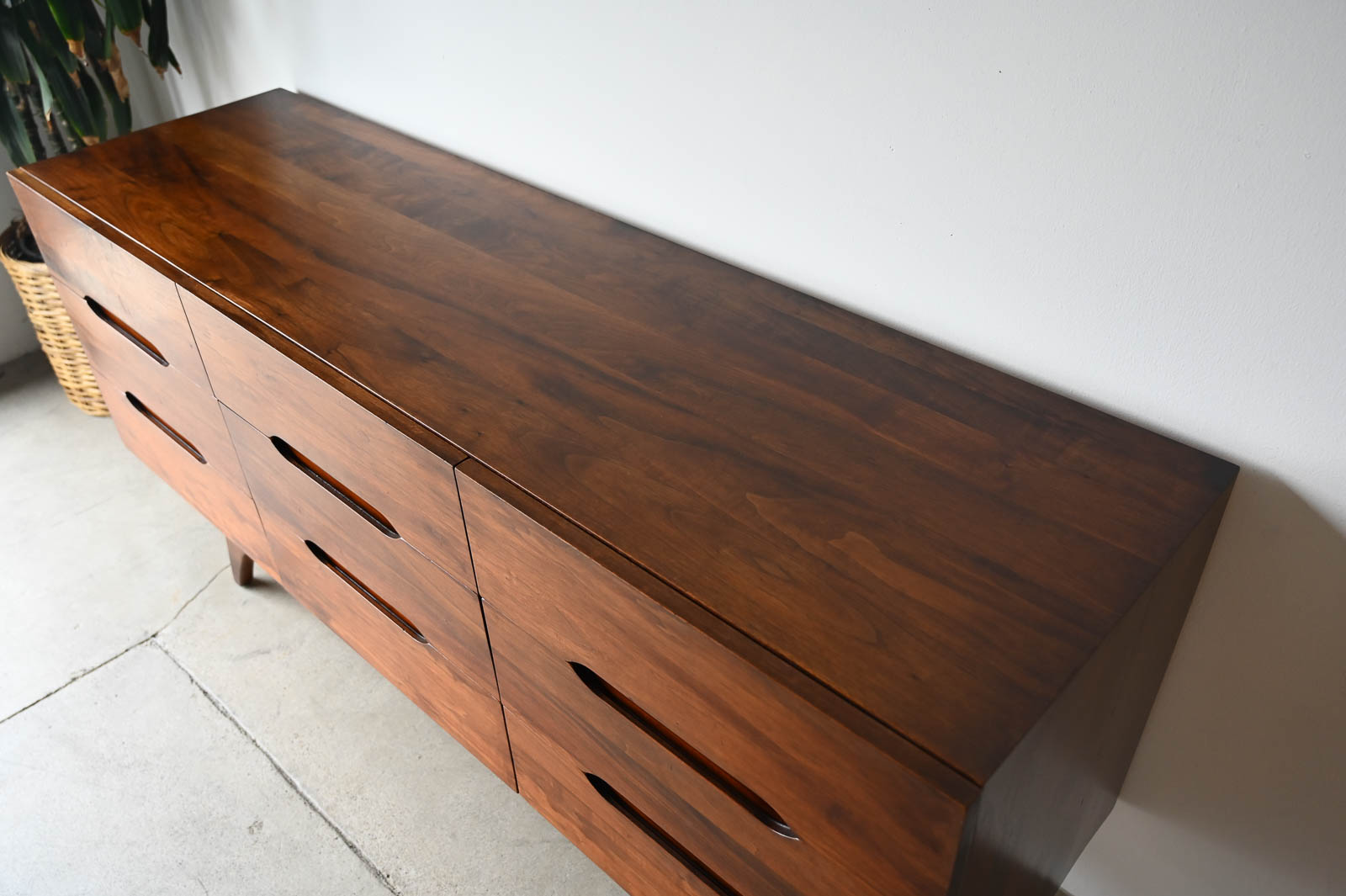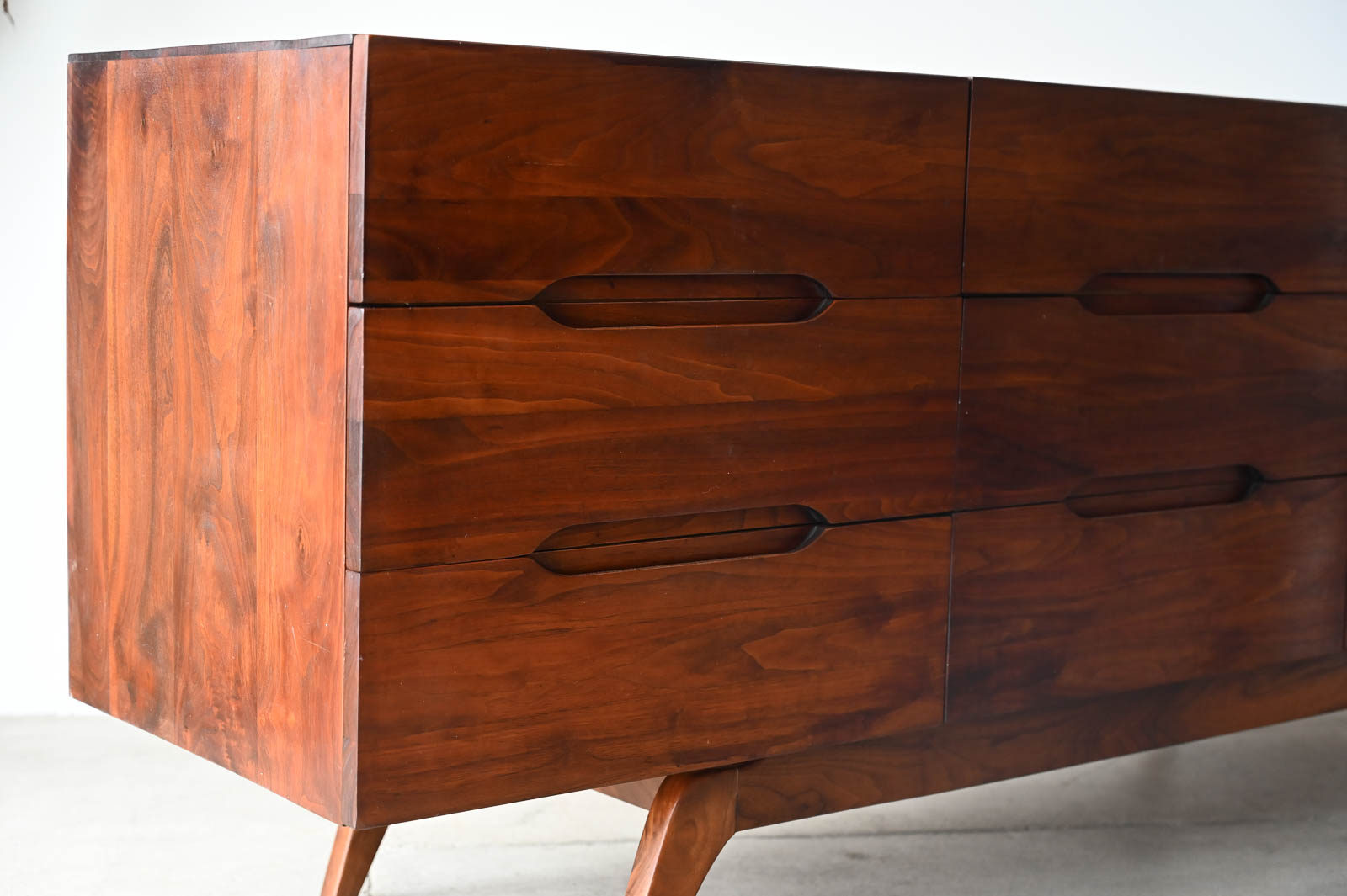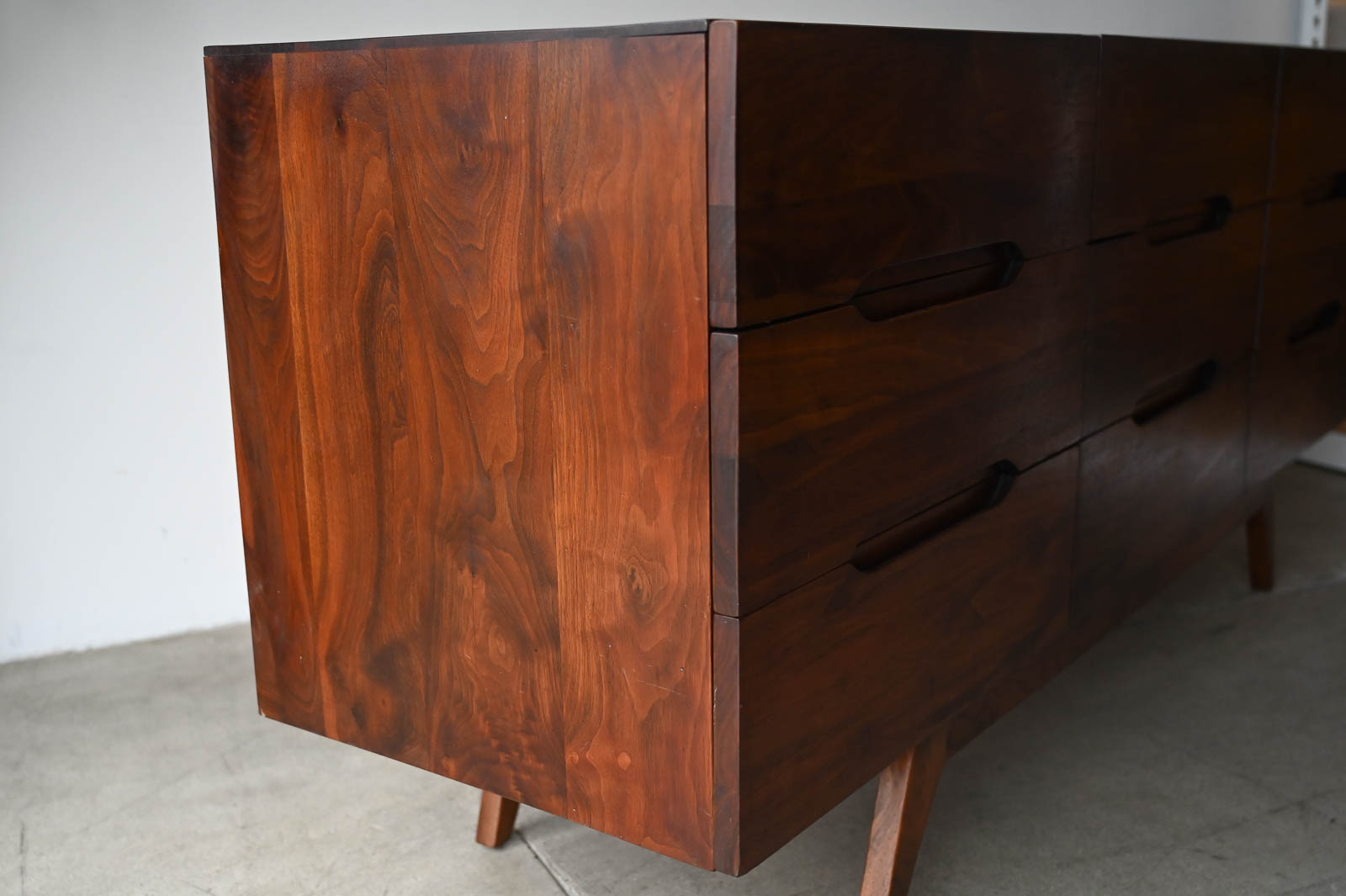 Sculptural walnut nine-drawer dresser or credenza, circa 1965. Solid walnut, not veneer, dovetail drawers and recessed sculpted pulls on a splayed leg base. Gorgeous walnut grain. Excellent original condition with hand oiled finish. Measures 66″ W x 19″ D x 30″ H.