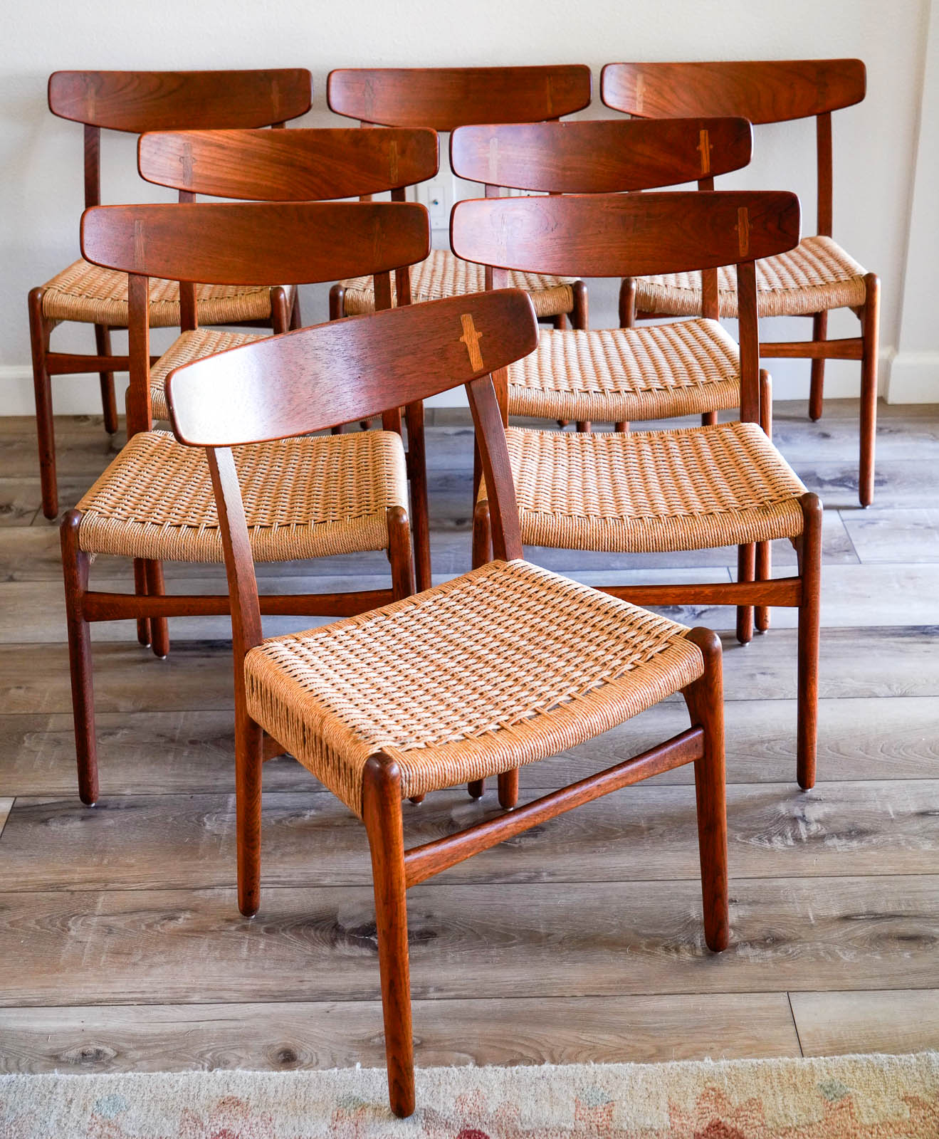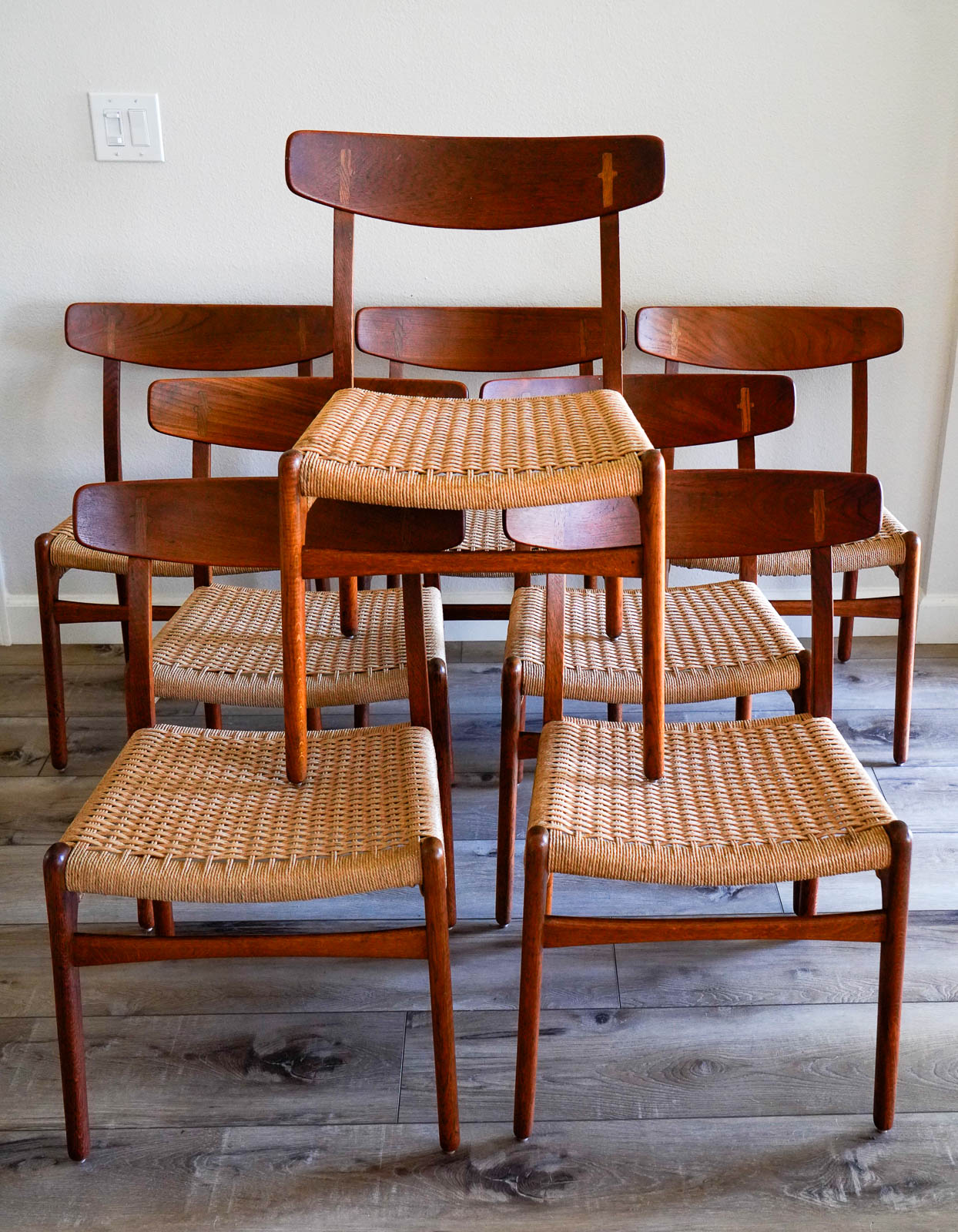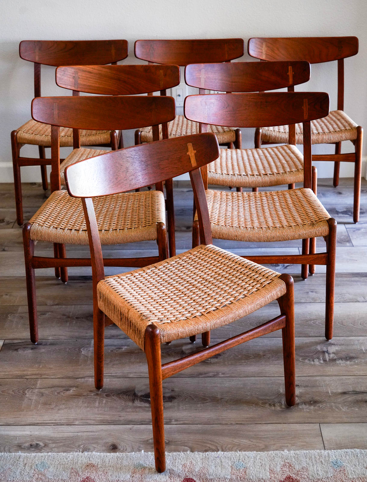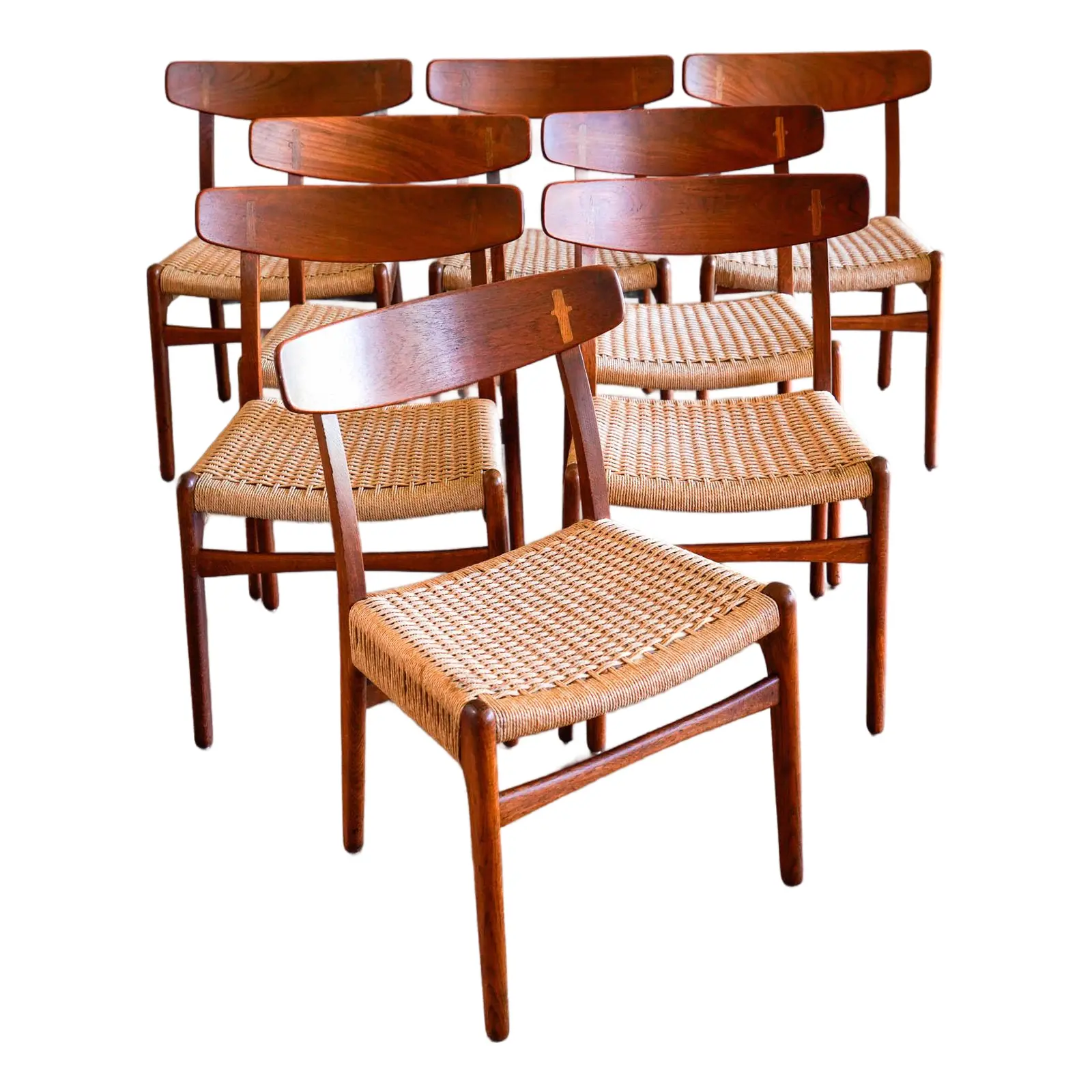 Set of 8 Hans Wegner Ch-23 Dining Chairs, Ca. 1959. Rare and hard to find in this condition. This beautiful set is 100% original and has not been restored, they are in wonderful original condition. All the original papercord seats are excellent with no breaks and frames are structurally sound.
