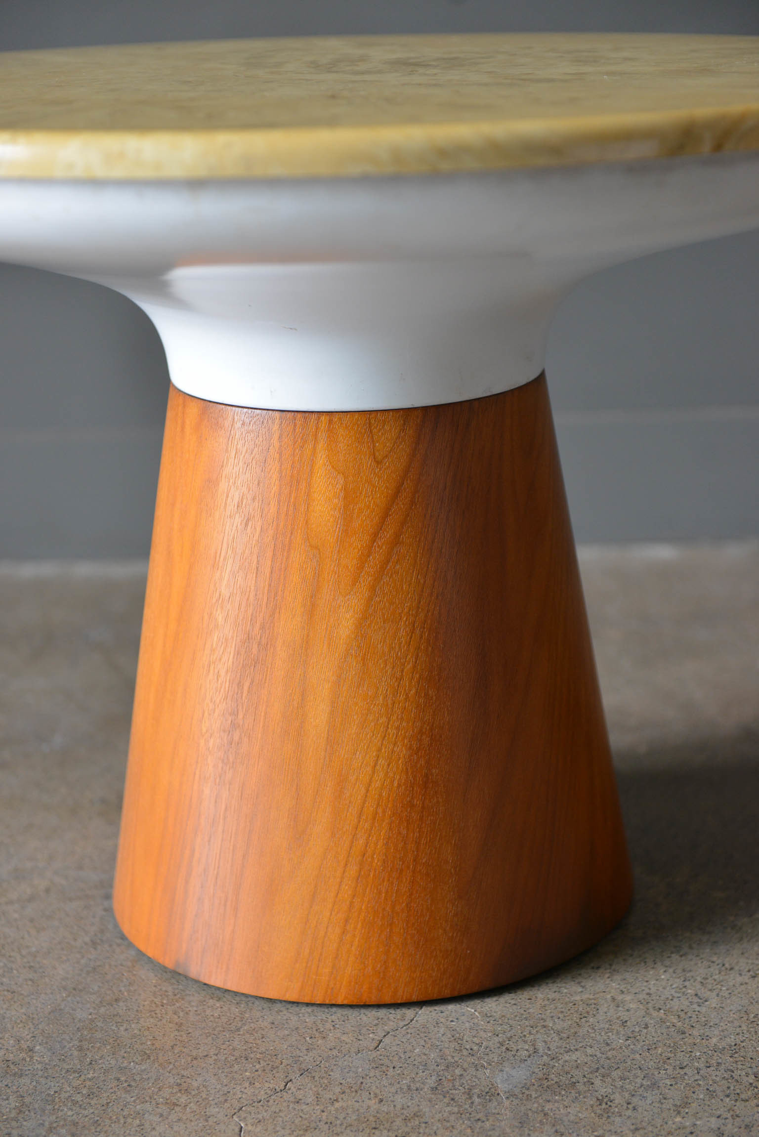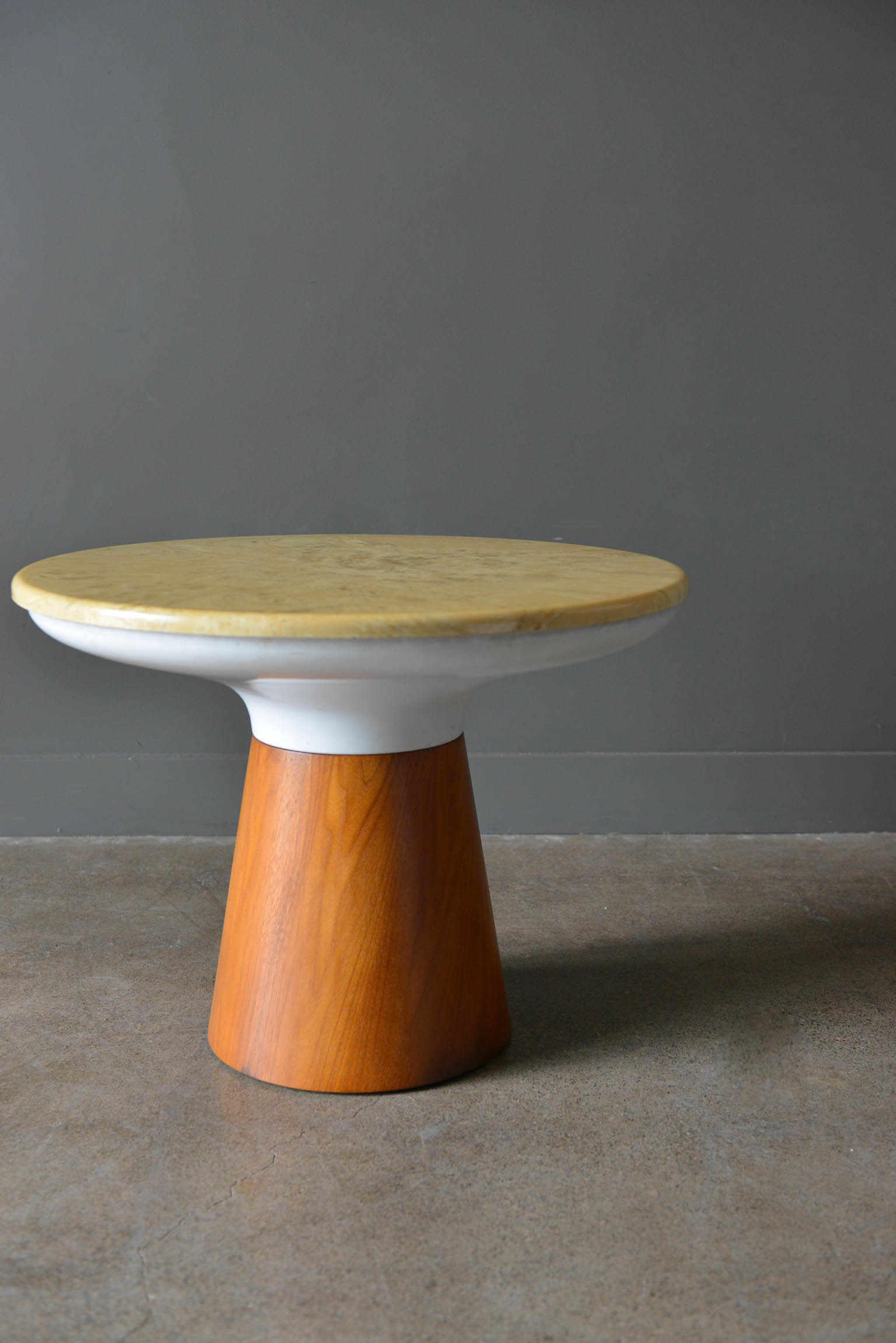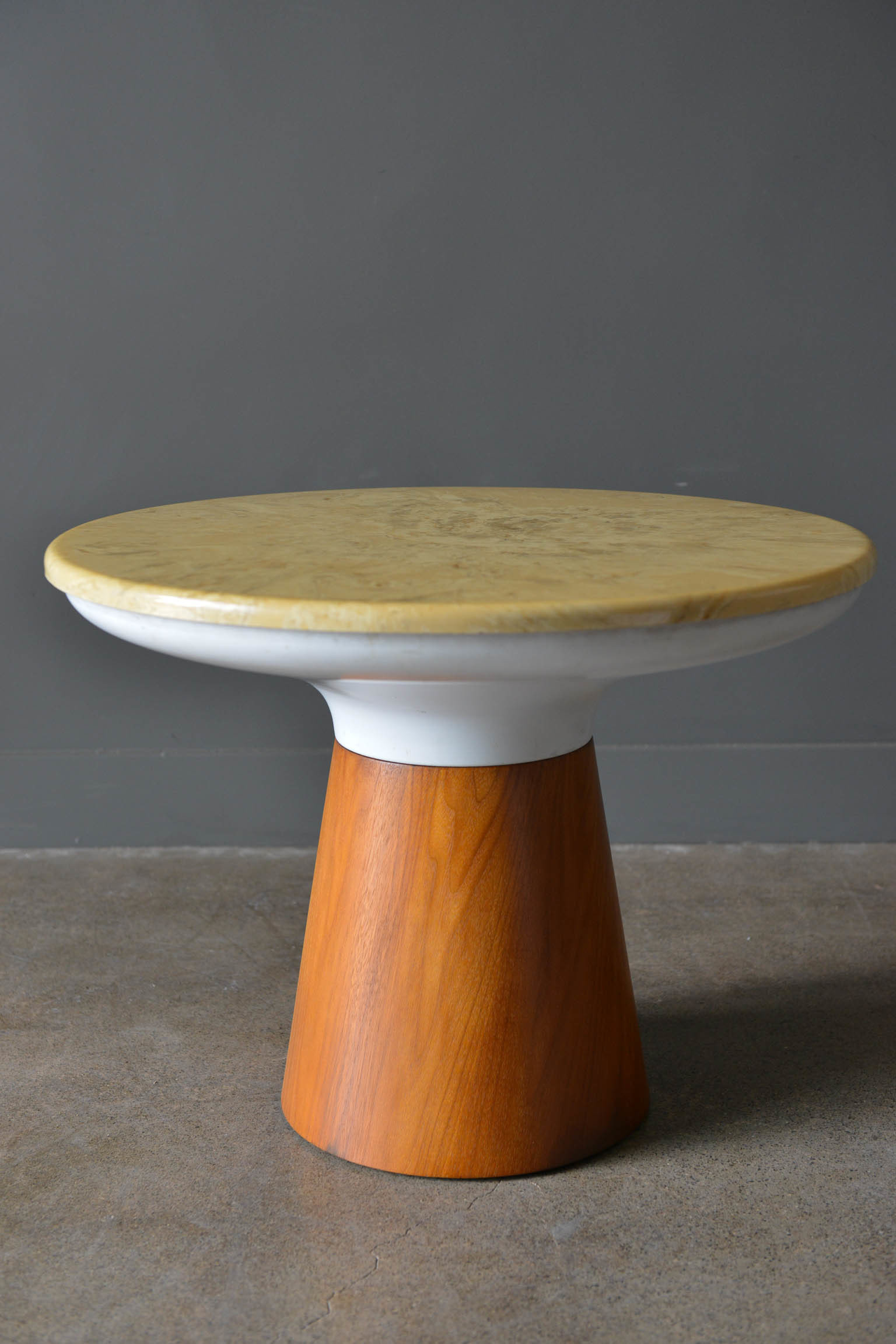 Stone occasional table by Frank Rohloff for Brown Saltman, circa 1965. Walnut base with removable stone top in good condition with only slight wear. Small chip on the underside of the table, not visible from top. Measures 25″ diameter x 18″ height.