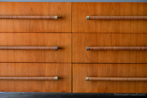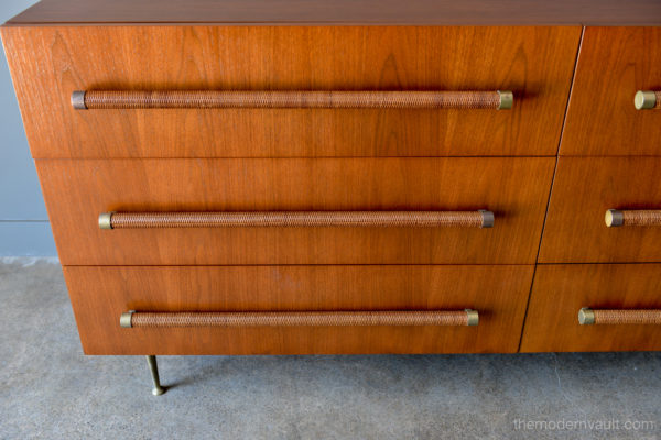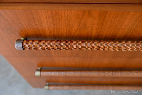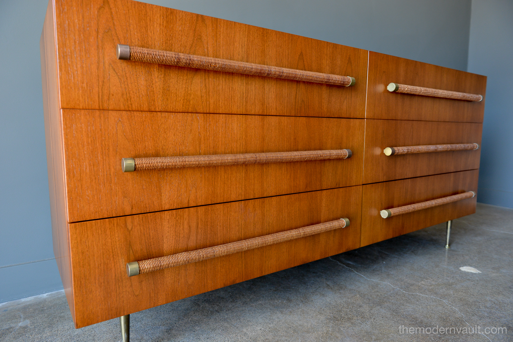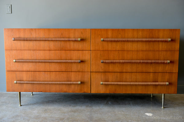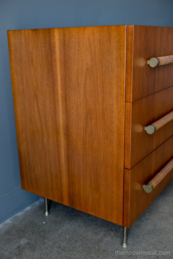 T. H. Robsjohn-Gibbings 6-drawer walnut and brass dresser or credenza, circa 1955. Original cane wrapped brass hardware with original legs and great patina. Walnut finish has been professionally restored in showroom perfect condition. Dresser is finished on the reverse so it can float in a room. Exceptional craftsmanship.