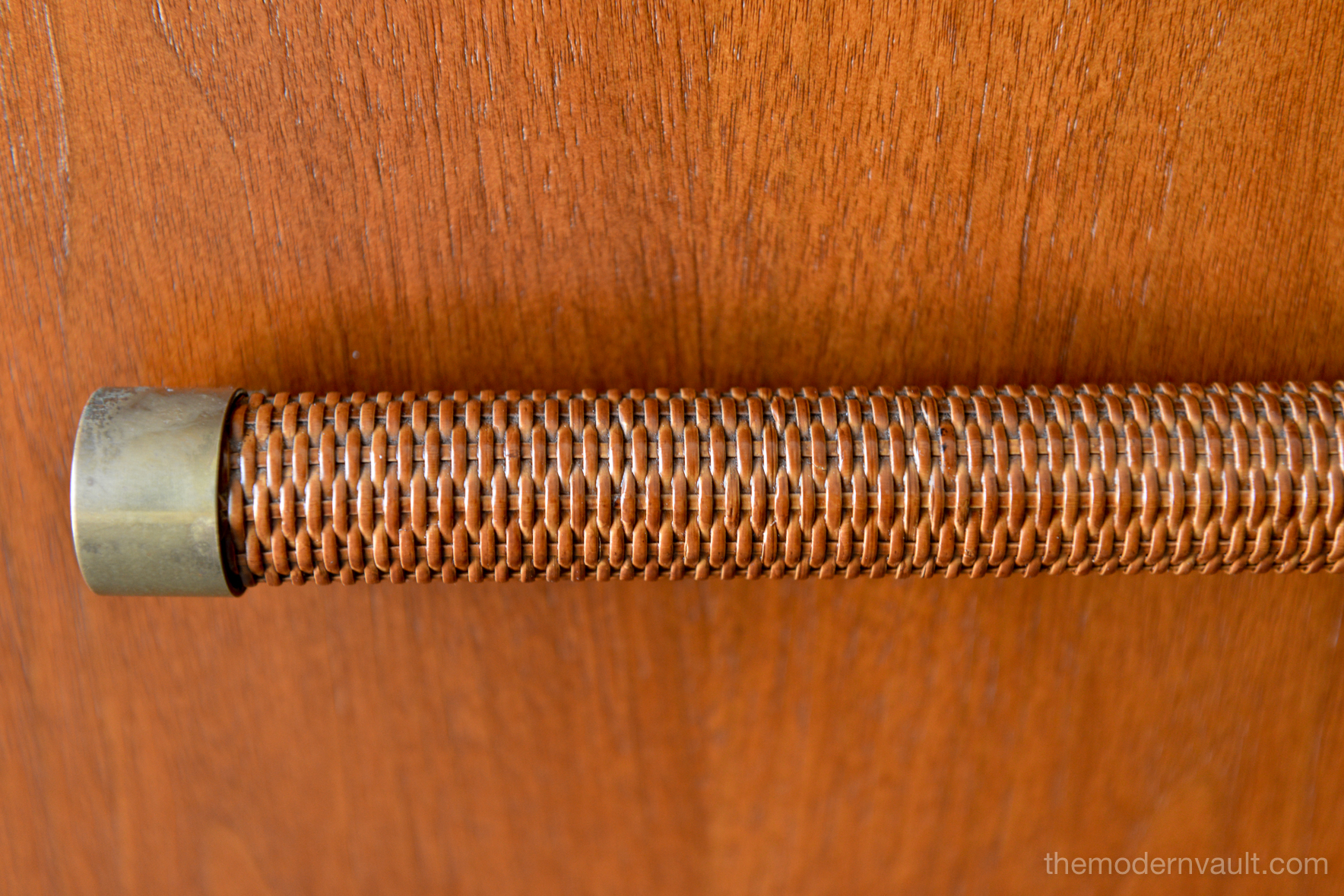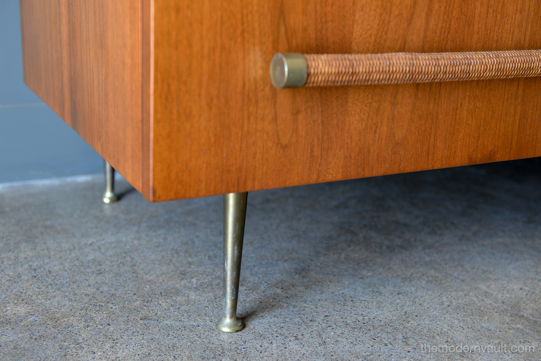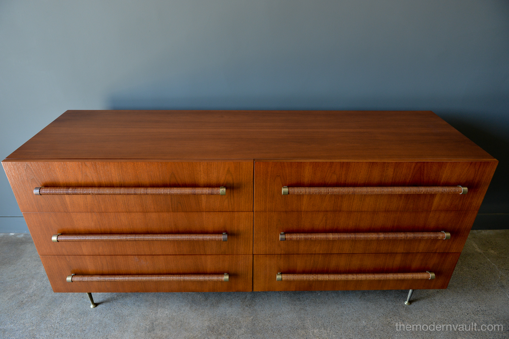 T. H. Robsjohn-Gibbings 6-drawer walnut and brass dresser or credenza, circa 1955. Original cane wrapped brass hardware with original legs and great patina. Walnut finish has been professionally restored in showroom perfect condition. Dresser is finished on the reverse so it can float in a room. Exceptional craftsmanship.