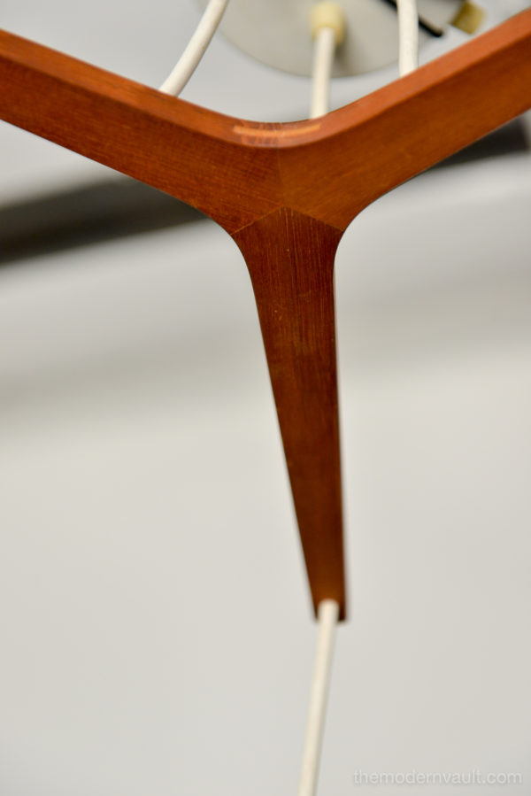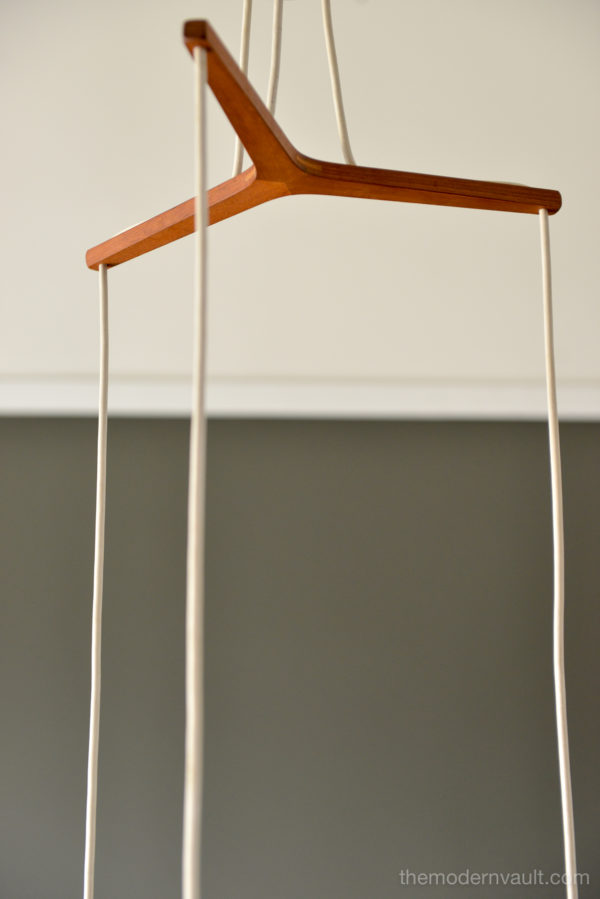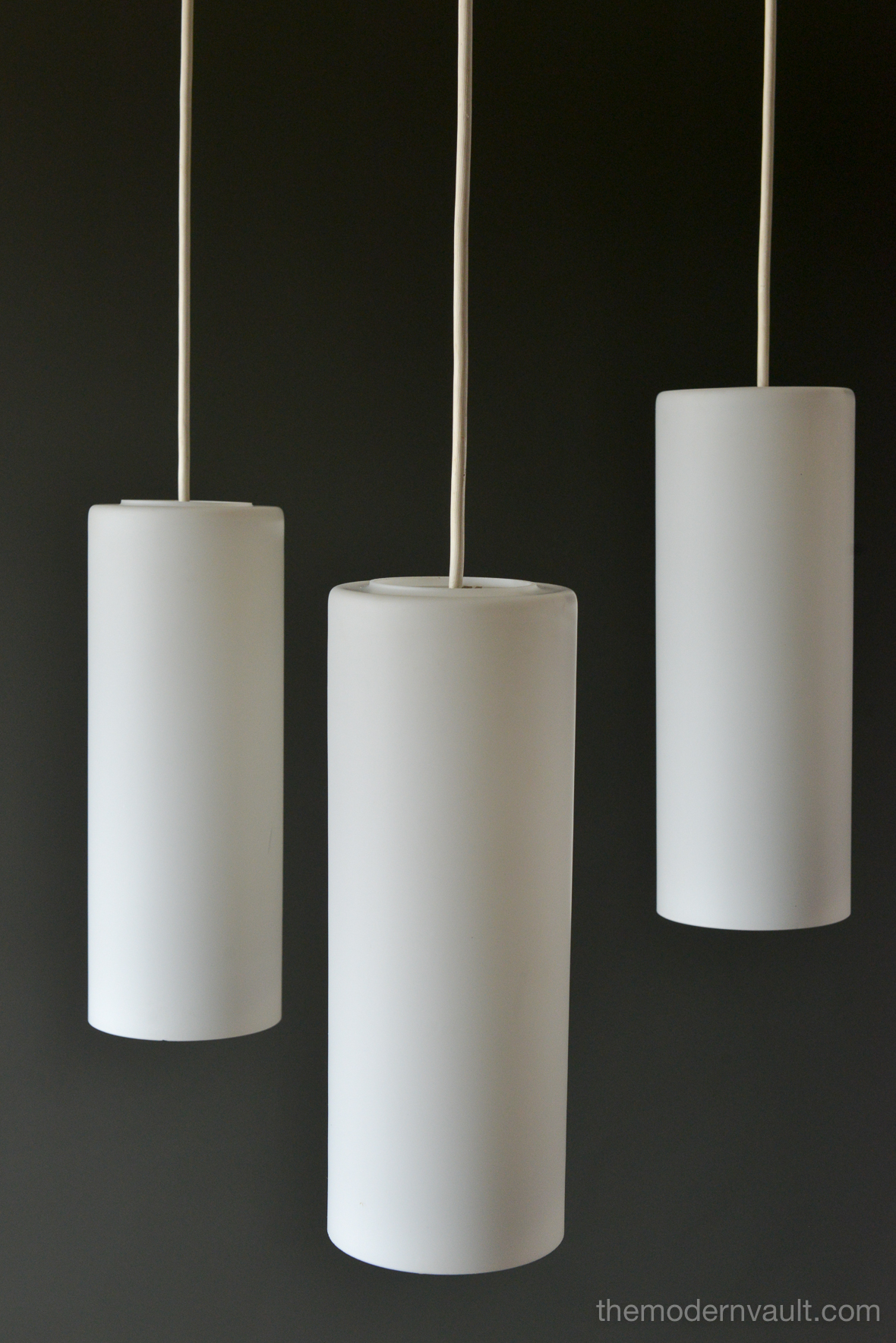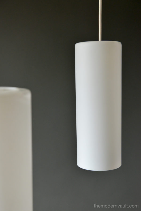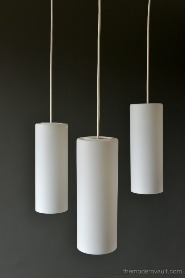 Uno & Östen Kristiansson for Luxus Frosted Triple Cylinder Pendant, ca. 1960. Swedish Modern Uno & Osten Kristiansson for Luxus of Sweden. Translucent Frosted Glass Cylinder and Hanging Lamps. Featuring Three opaline glass shades, that hang at various heights, sculpted teak support, White vinyl cords are original. Pendant will need to be hard-wired to ceiling. Excellent vintage condition, the glass is free from chips or cracks and retains original label, Made in Sweden.