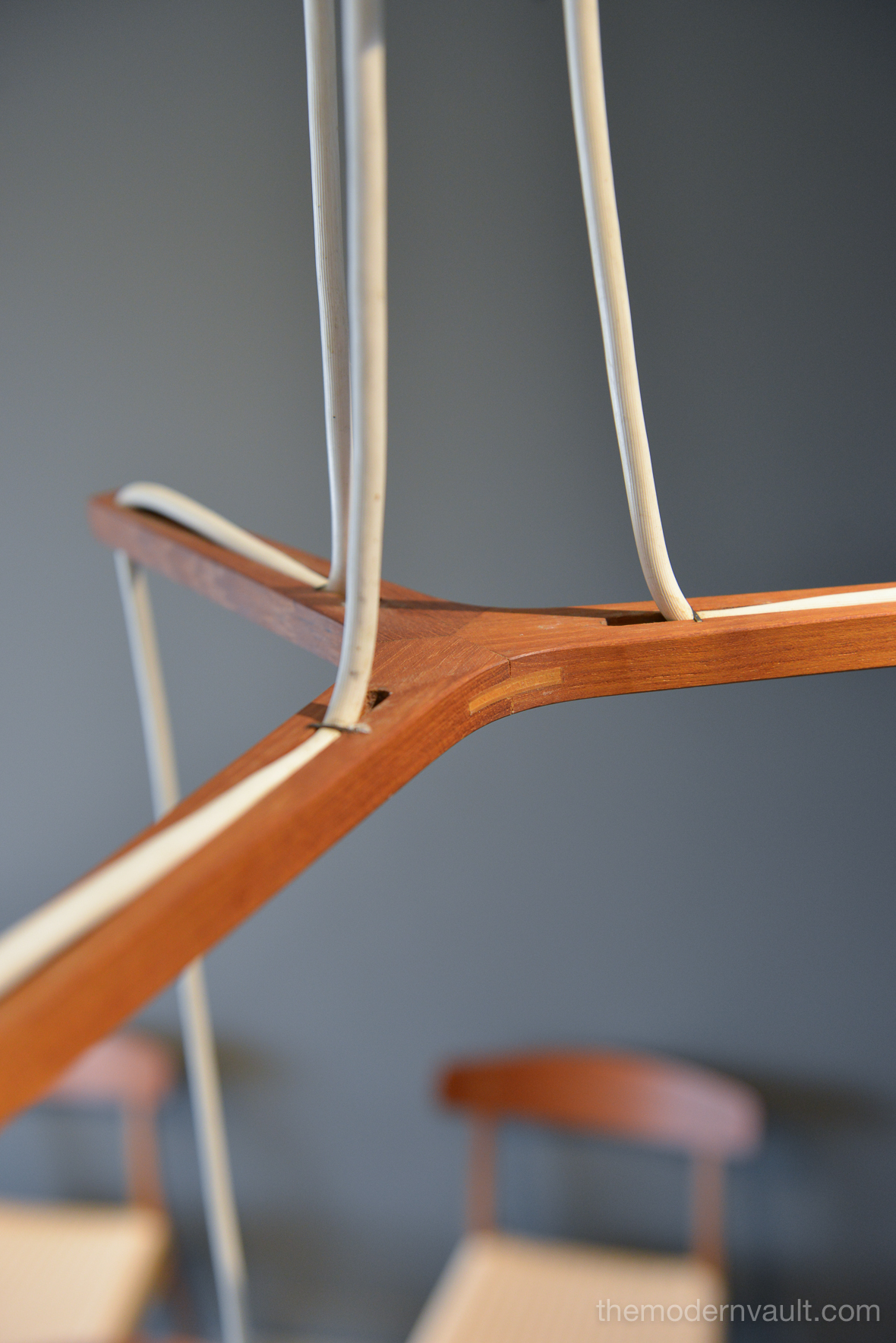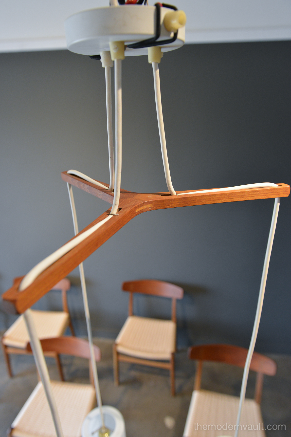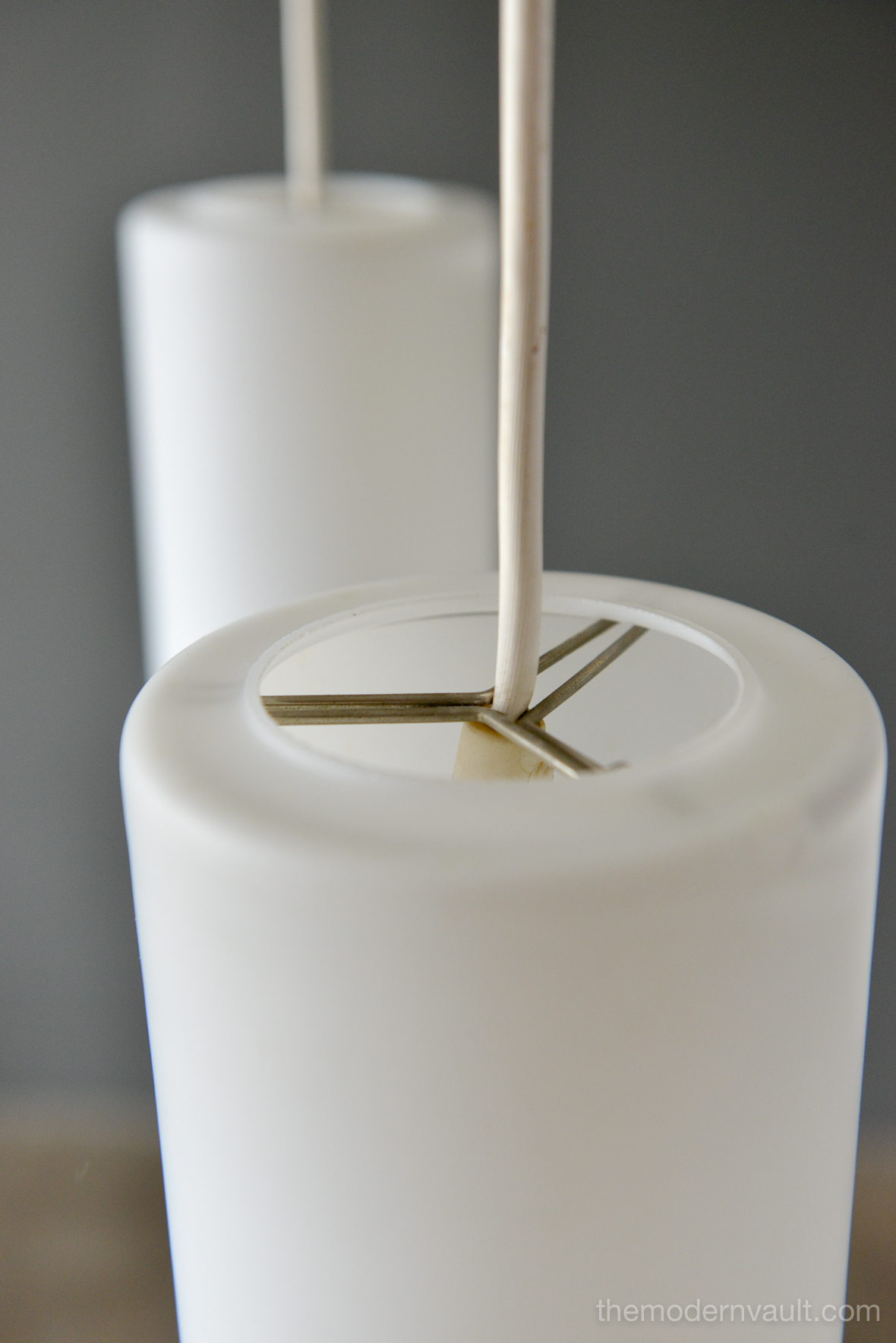 Uno & Östen Kristiansson for Luxus Frosted Triple Cylinder Pendant, ca. 1960. Swedish Modern Uno & Osten Kristiansson for Luxus of Sweden. Translucent Frosted Glass Cylinder and Hanging Lamps. Featuring Three opaline glass shades, that hang at various heights, sculpted teak support, White vinyl cords are original. Pendant will need to be hard-wired to ceiling. Excellent vintage condition, the glass is free from chips or cracks and retains original label, Made in Sweden.