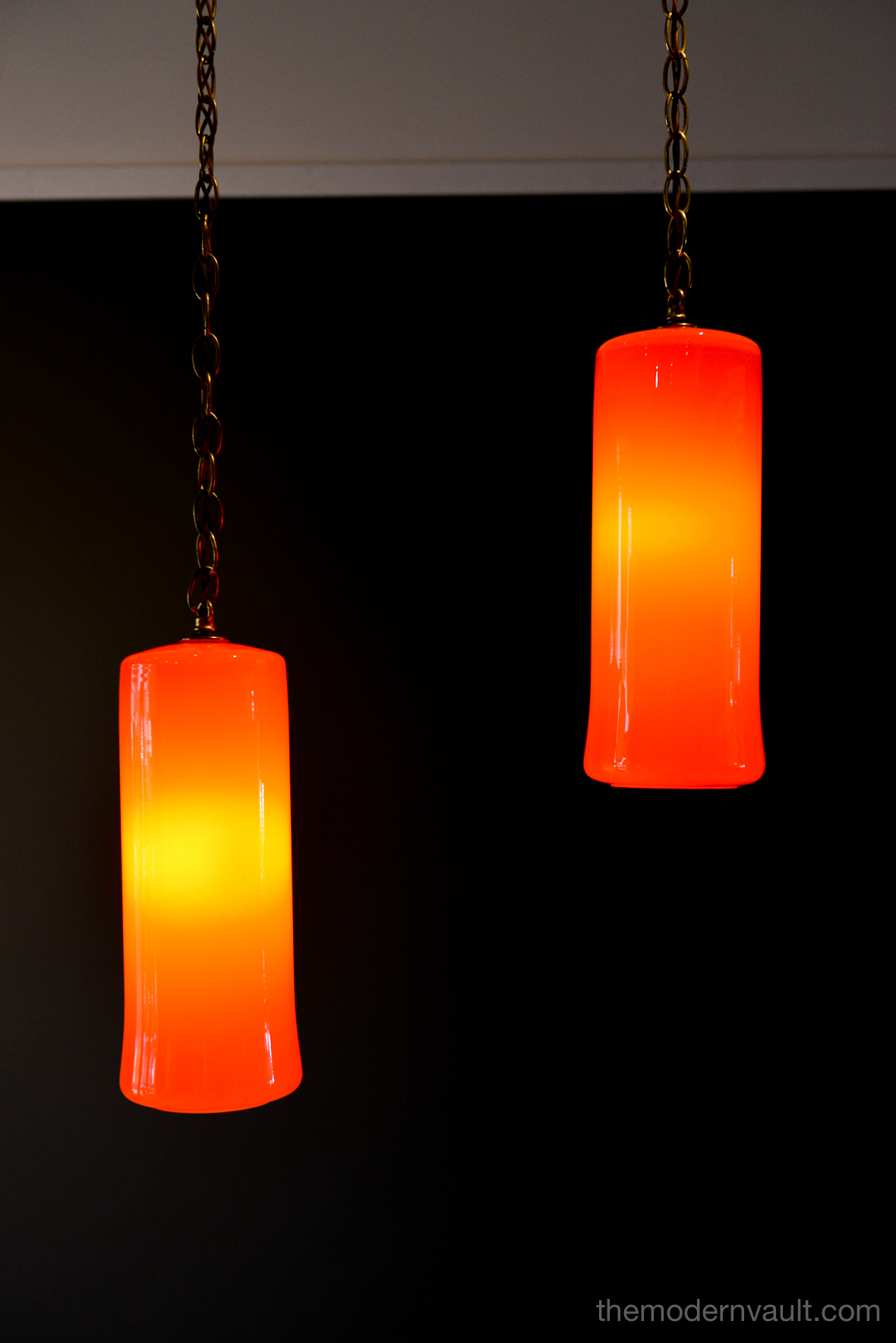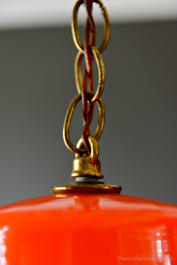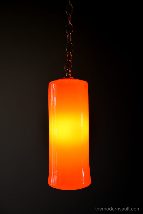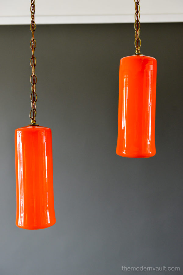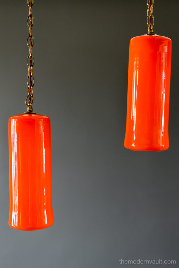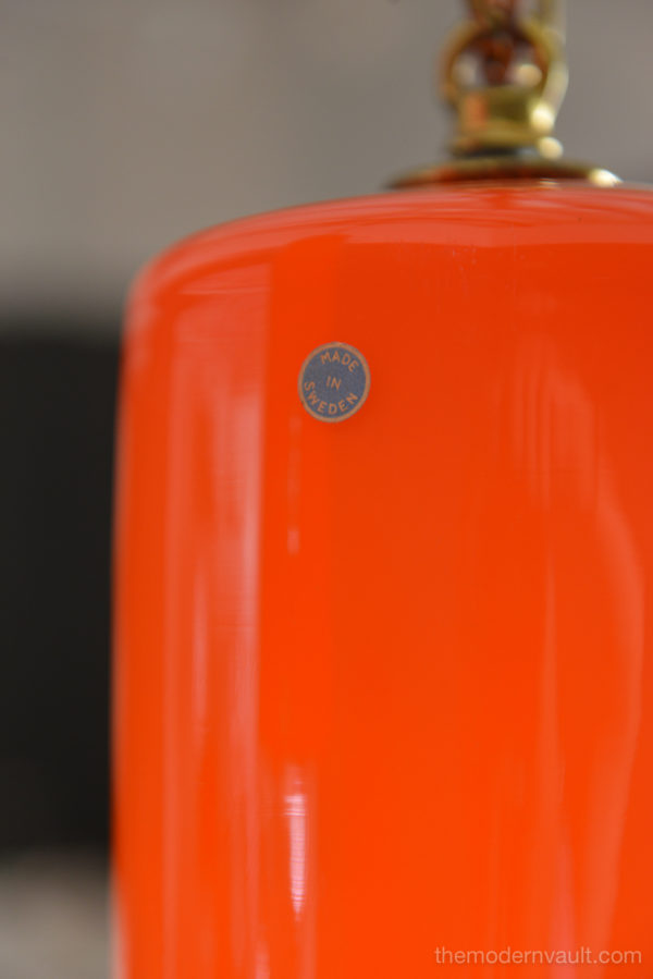 Uno & Östen Kristiansson for Luxus Orange Glass Pendant Lights, ca 1960. Beautiful deep orange colored blown glass pendant swag lights with original chain and wiring. Lights can be kept original as a plug in as shown, or you can easily separate them and ceiling mount them as pendants on the side of a credenza or over nightstands. Wonderful orange glow when illuminated and glass is in excellent condition with no chips or cracks. Retains label Made in Sweden.