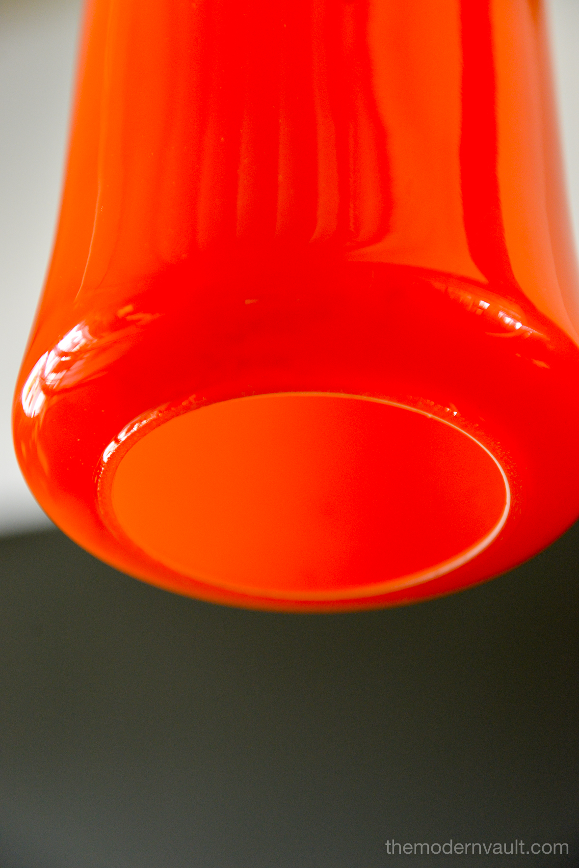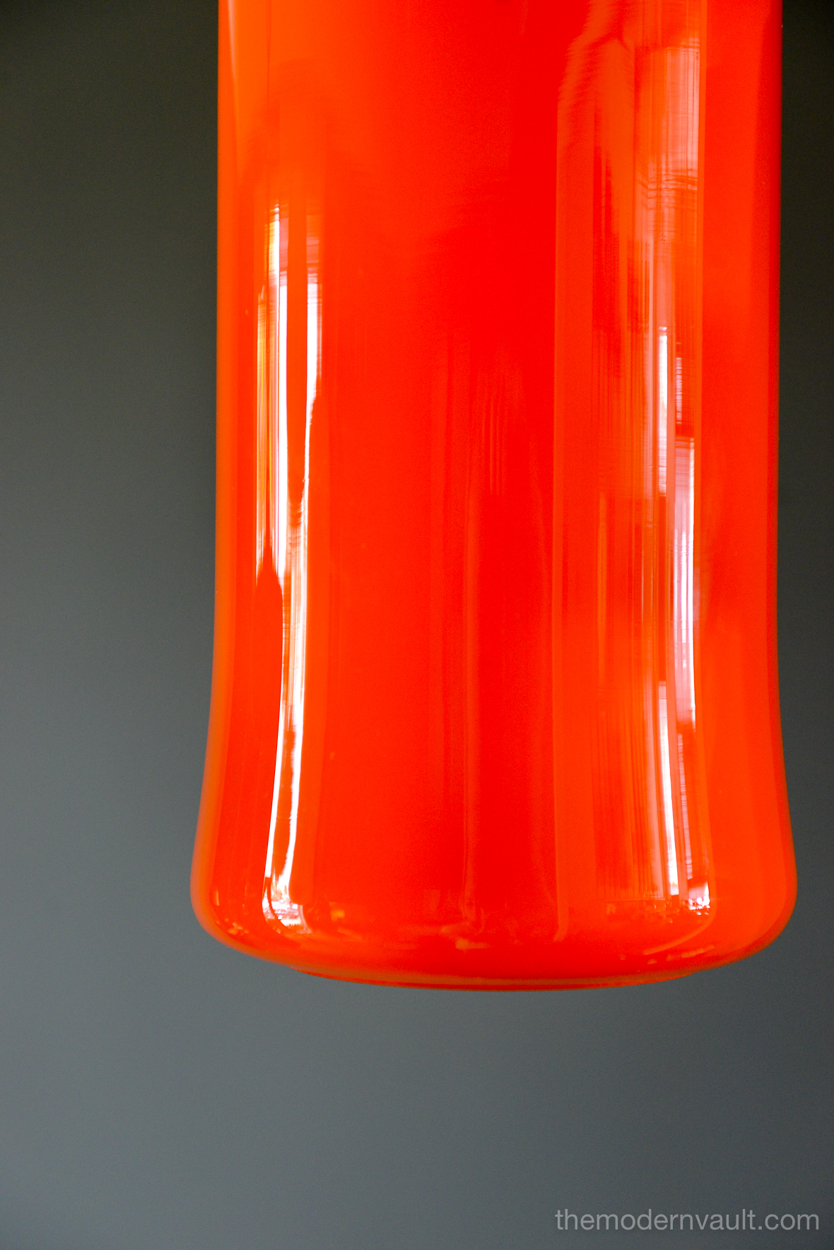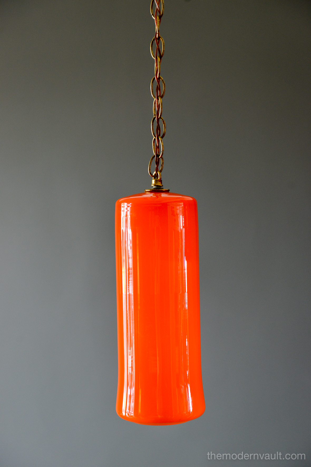 Uno & Östen Kristiansson for Luxus Orange Glass Pendant Lights, ca 1960. Beautiful deep orange colored blown glass pendant swag lights with original chain and wiring. Lights can be kept original as a plug in as shown, or you can easily separate them and ceiling mount them as pendants on the side of a credenza or over nightstands. Wonderful orange glow when illuminated and glass is in excellent condition with no chips or cracks. Retains label Made in Sweden.
