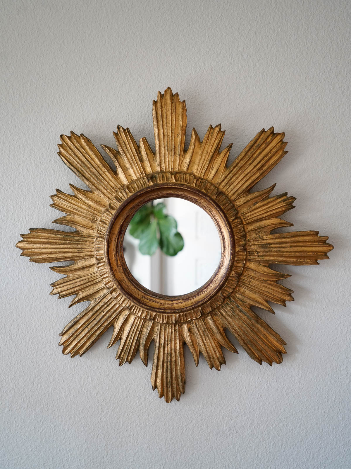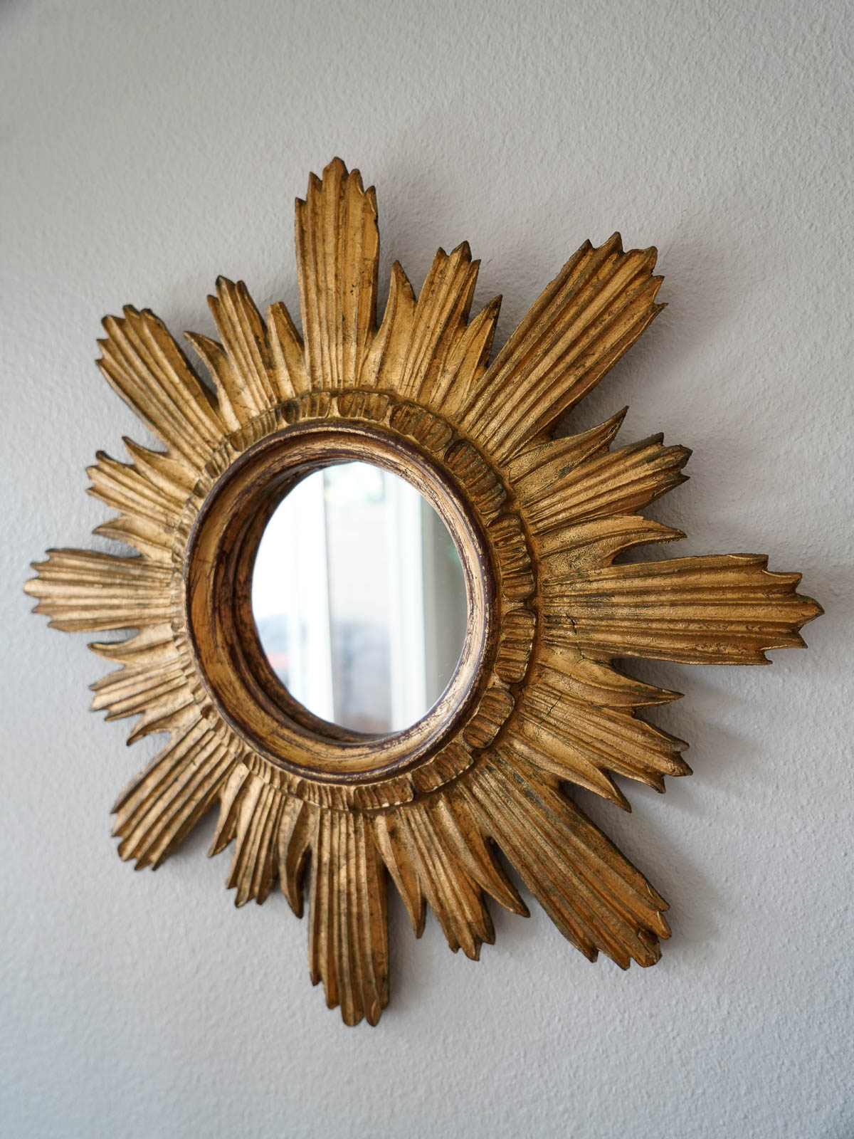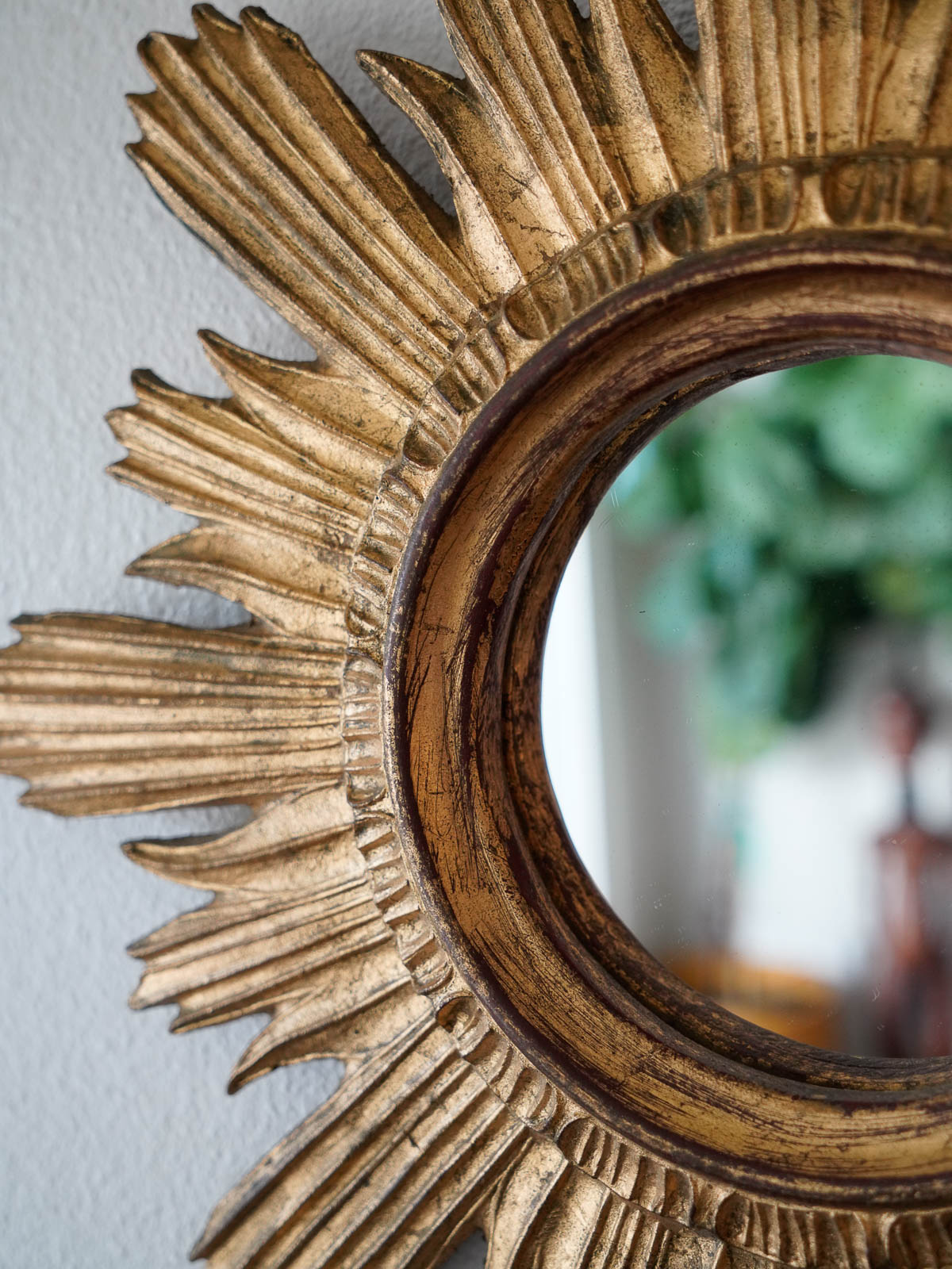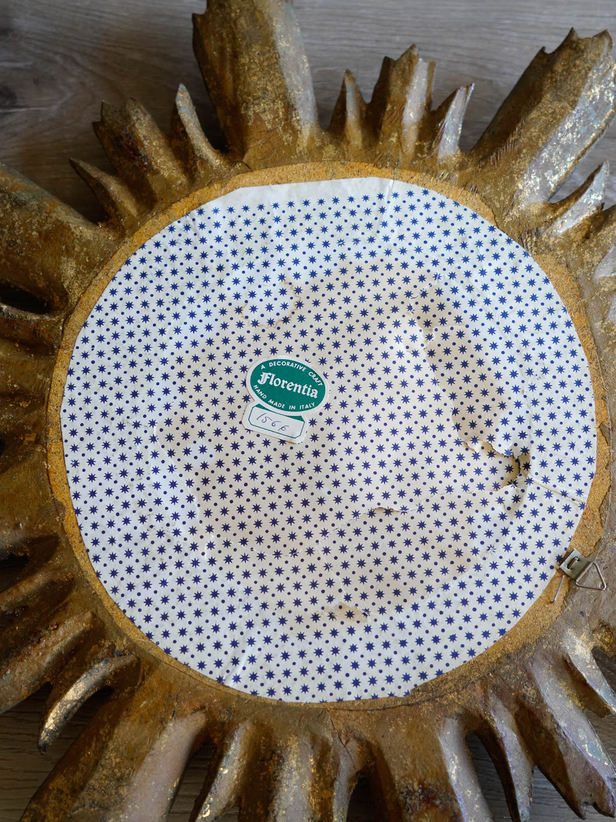 Vintage Gilted Wood Sunburst Wall Mirror by Florentia of Italy, Ca. 1970. Excellent original condition with wonderful patina to the wood and original mirror with original makers mark on reverse. Comes with hardware to hang. Beautiful mid century modern or hollywood regency style in this charming mirror.