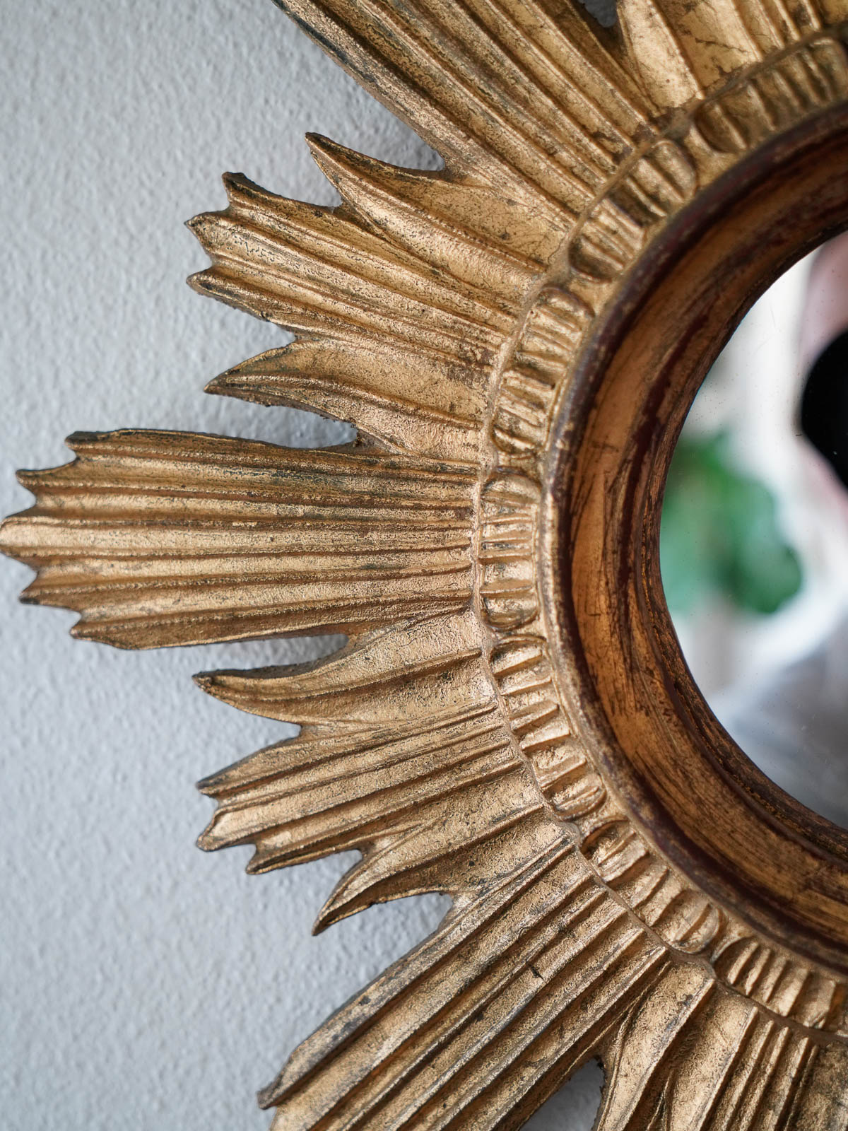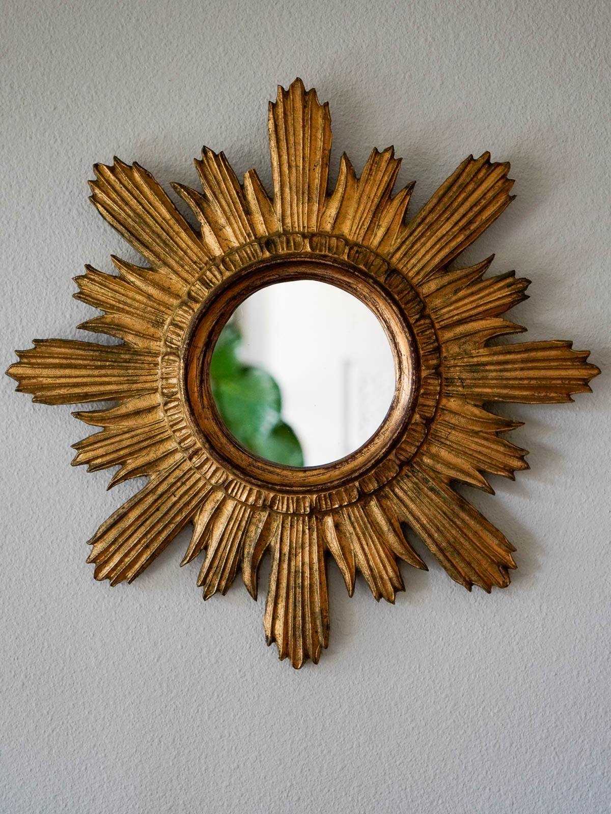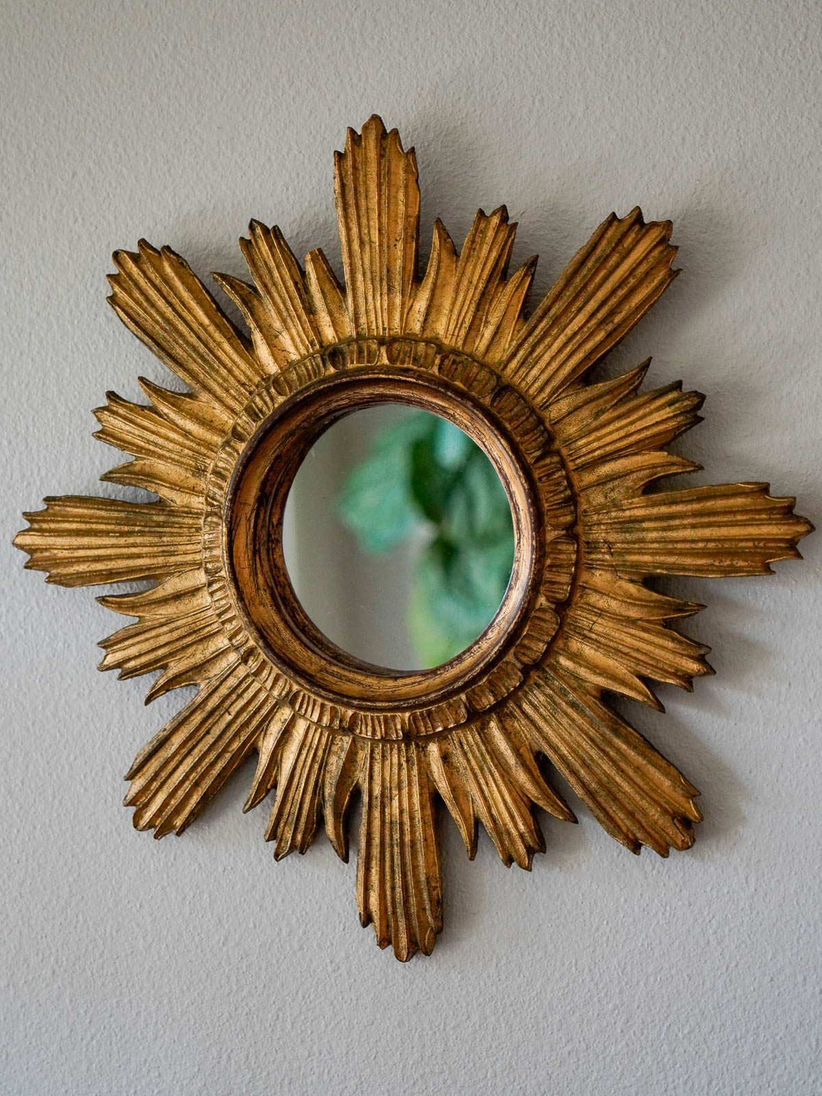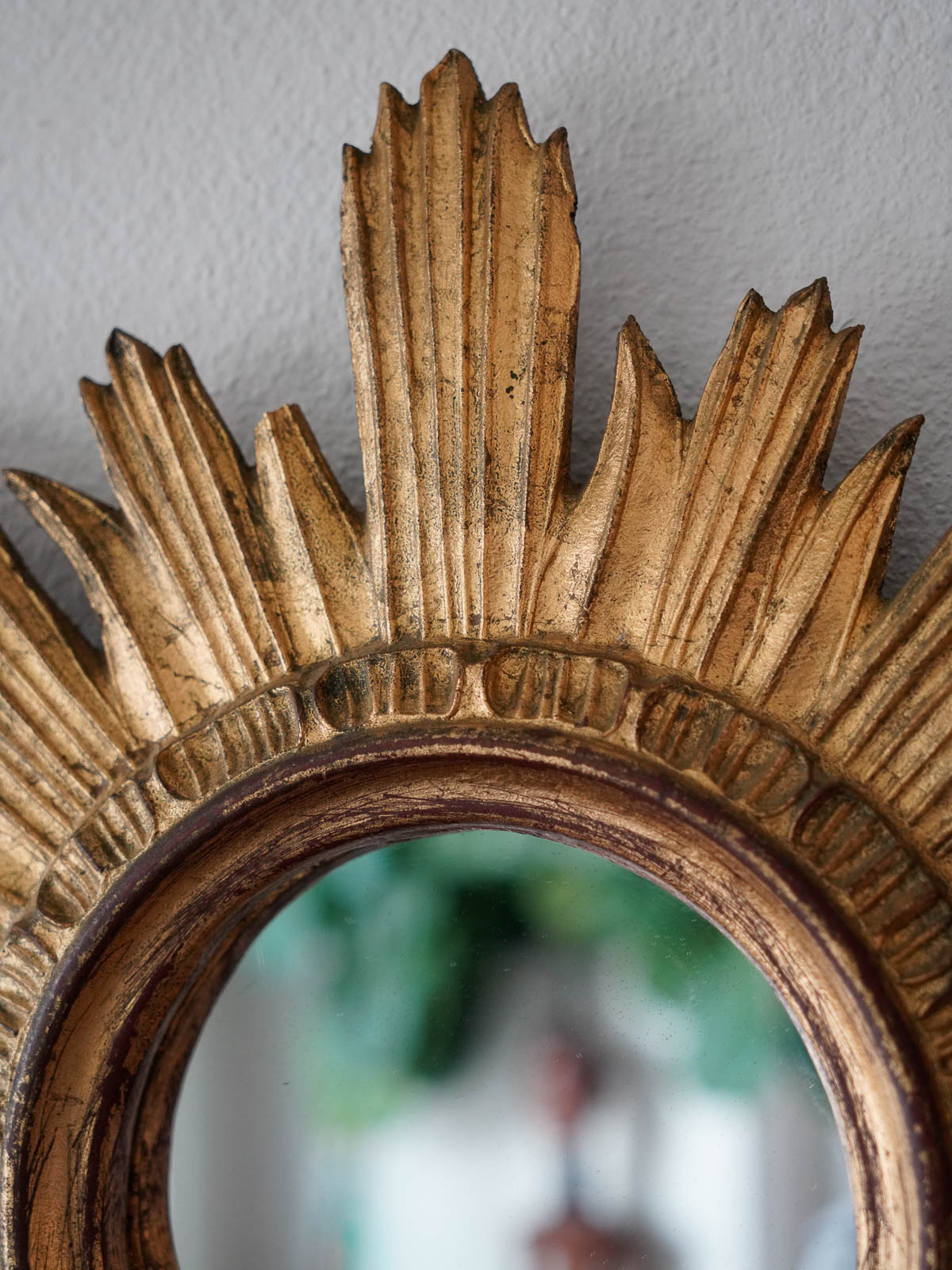 Vintage Gilted Wood Sunburst Wall Mirror by Florentia of Italy, Ca. 1970. Excellent original condition with wonderful patina to the wood and original mirror with original makers mark on reverse. Comes with hardware to hang. Beautiful mid century modern or hollywood regency style in this charming mirror.