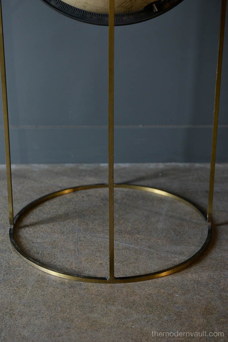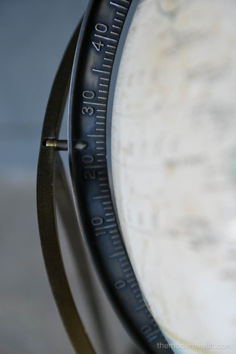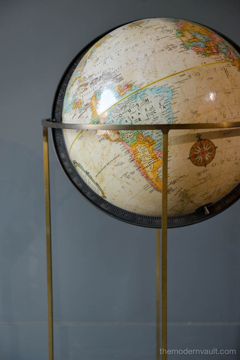 Vintage Globe on Brass Stand after Paul McCobb, ca. 1979. Globe is in excellent condition, dates to late 70’s. Brass is in excellent condition with wonderful patina. Globe rotates and swivels very smooth and silent. Measures 37 H x 19″ Diameter