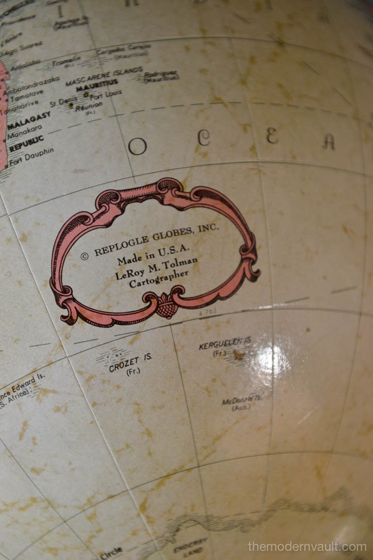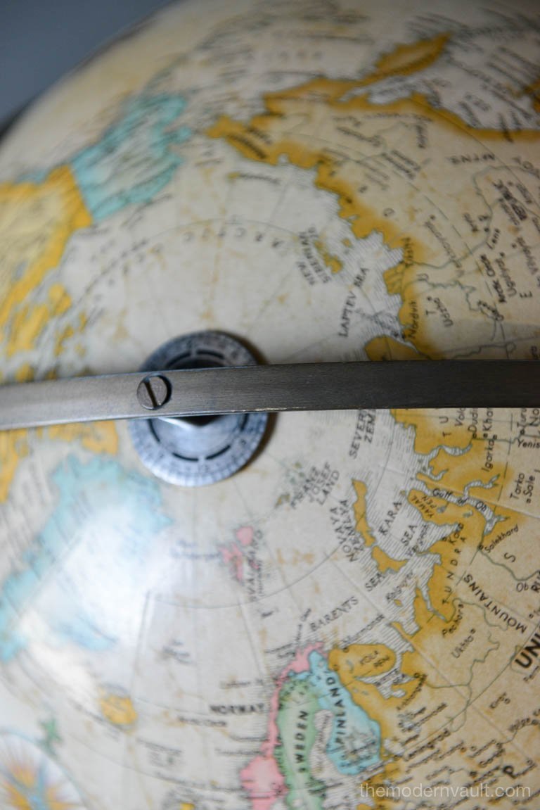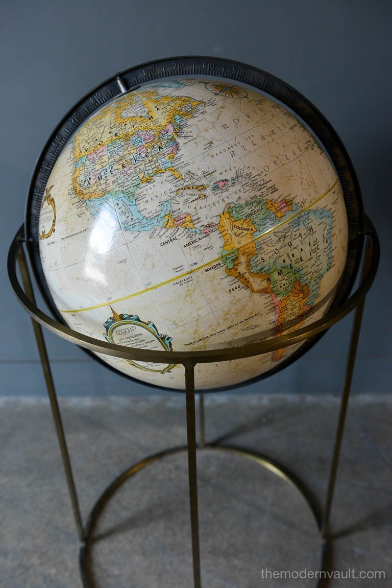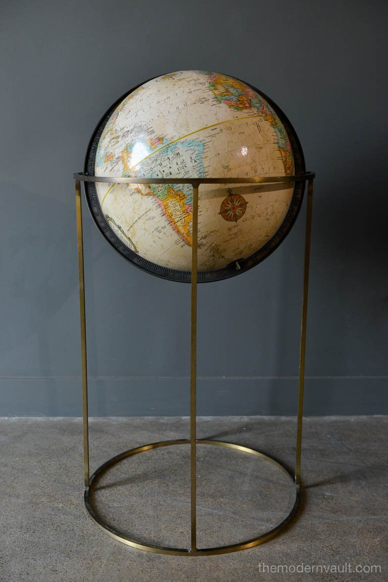 Vintage Globe on Brass Stand after Paul McCobb, ca. 1979. Globe is in excellent condition, dates to late 70’s. Brass is in excellent condition with wonderful patina. Globe rotates and swivels very smooth and silent. Measures 37 H x 19″ Diameter