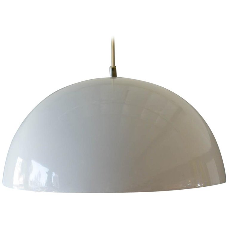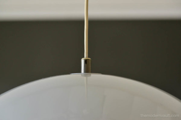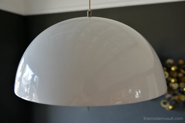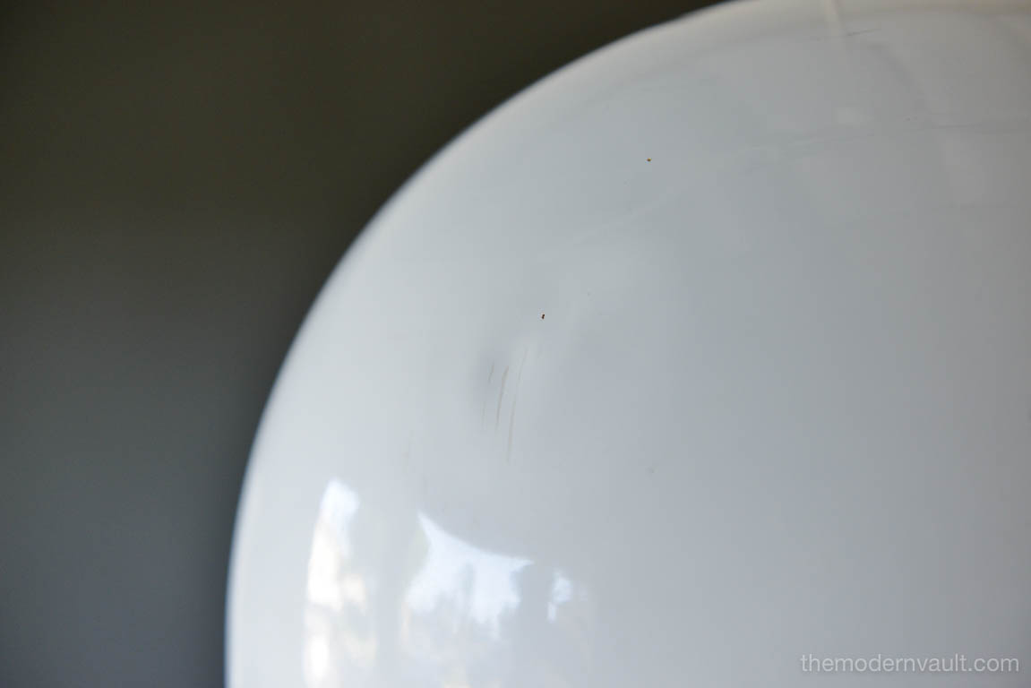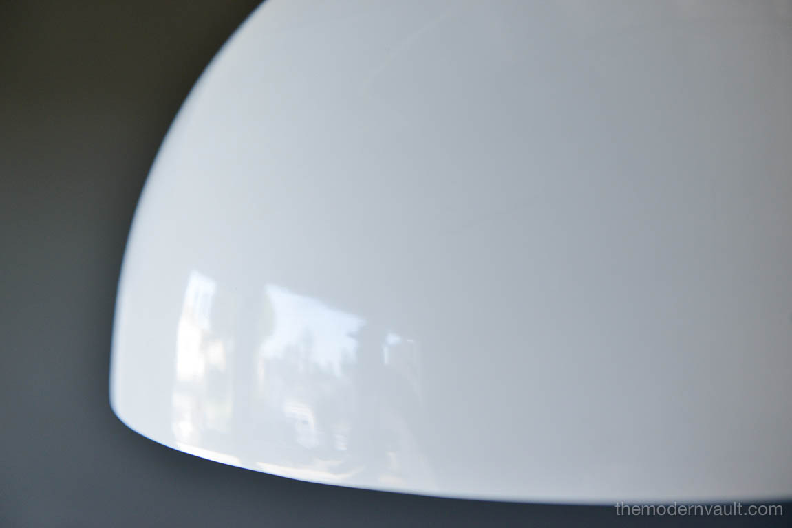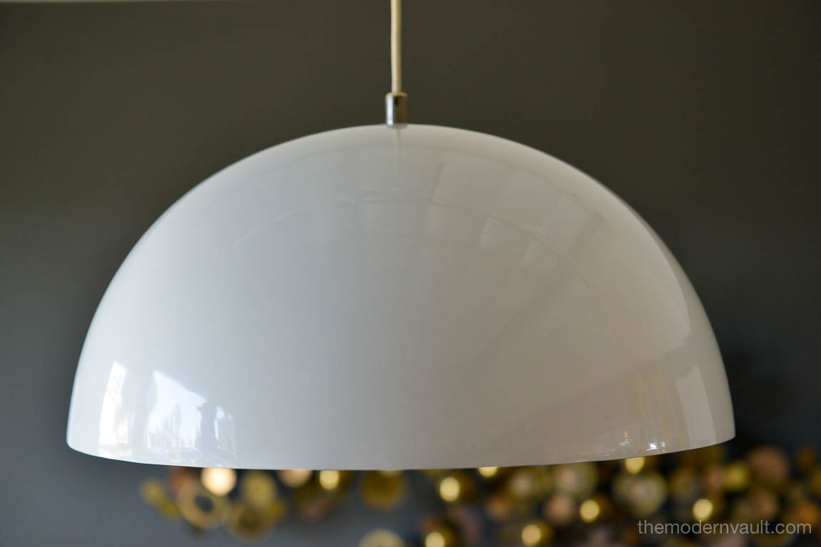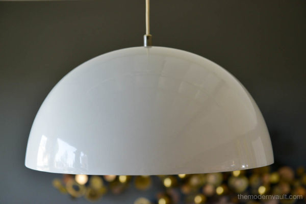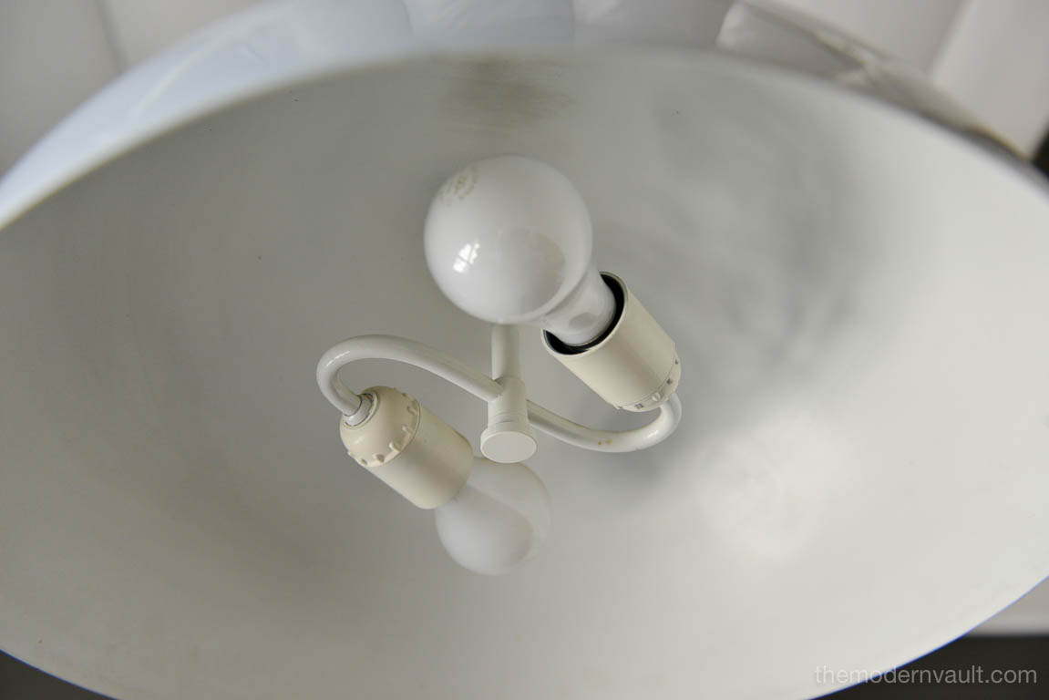 Vintage White Enameled Metal Dome Pendant Light, ca. 1965. White enamel is in very good condition with only slight wear. Small indentation on one edge, barely visible as shown. Re-wired with new 6′ plug in cord. Uses two 75W max bulbs. Unmarked. Measures 16″ Diameter and 9″ High