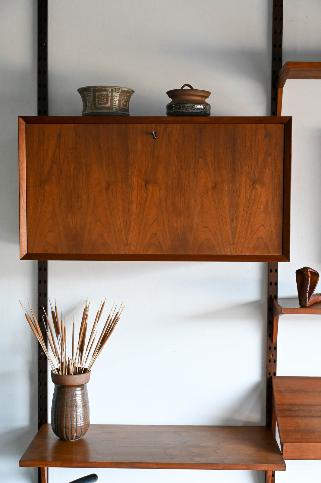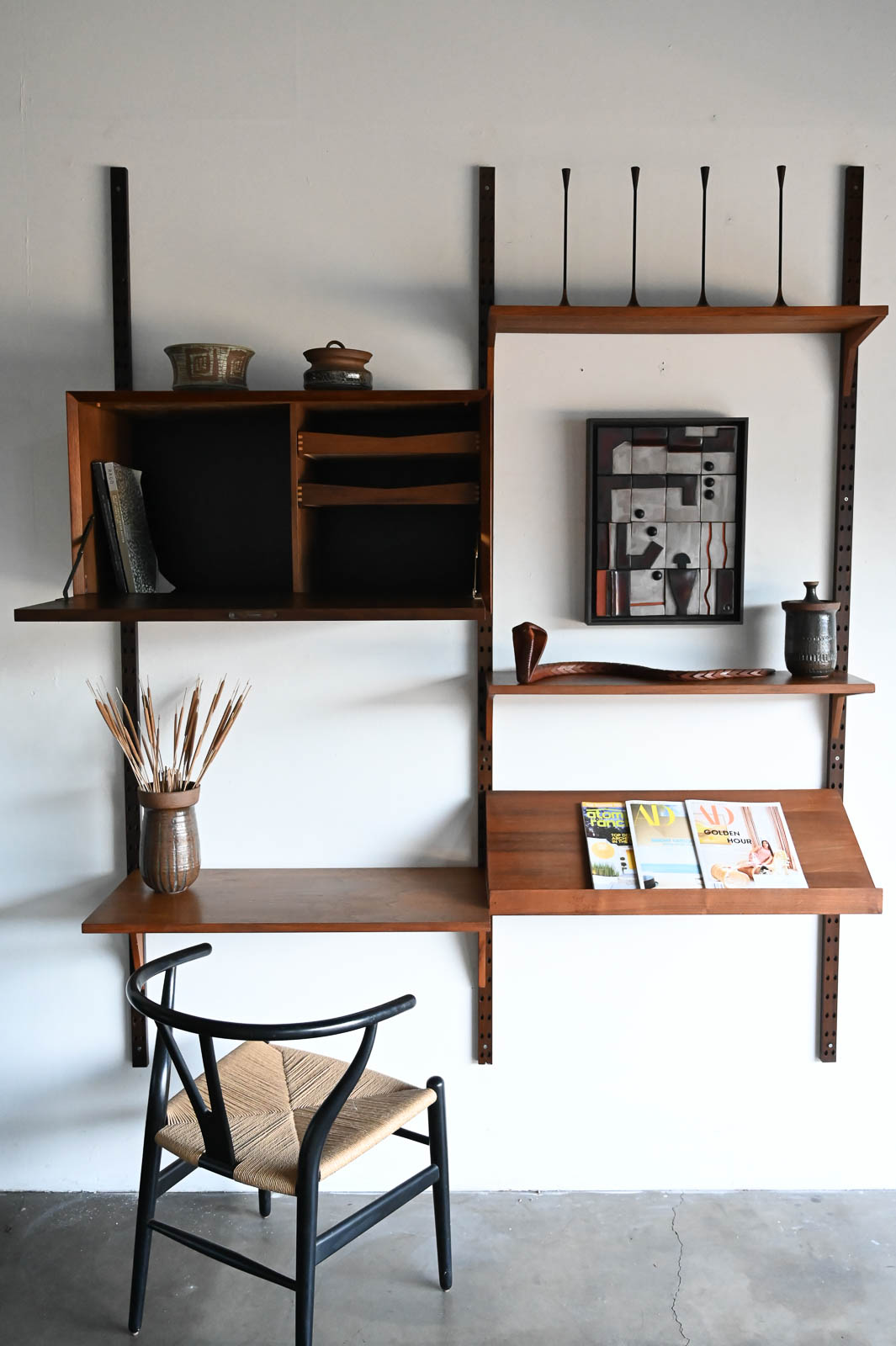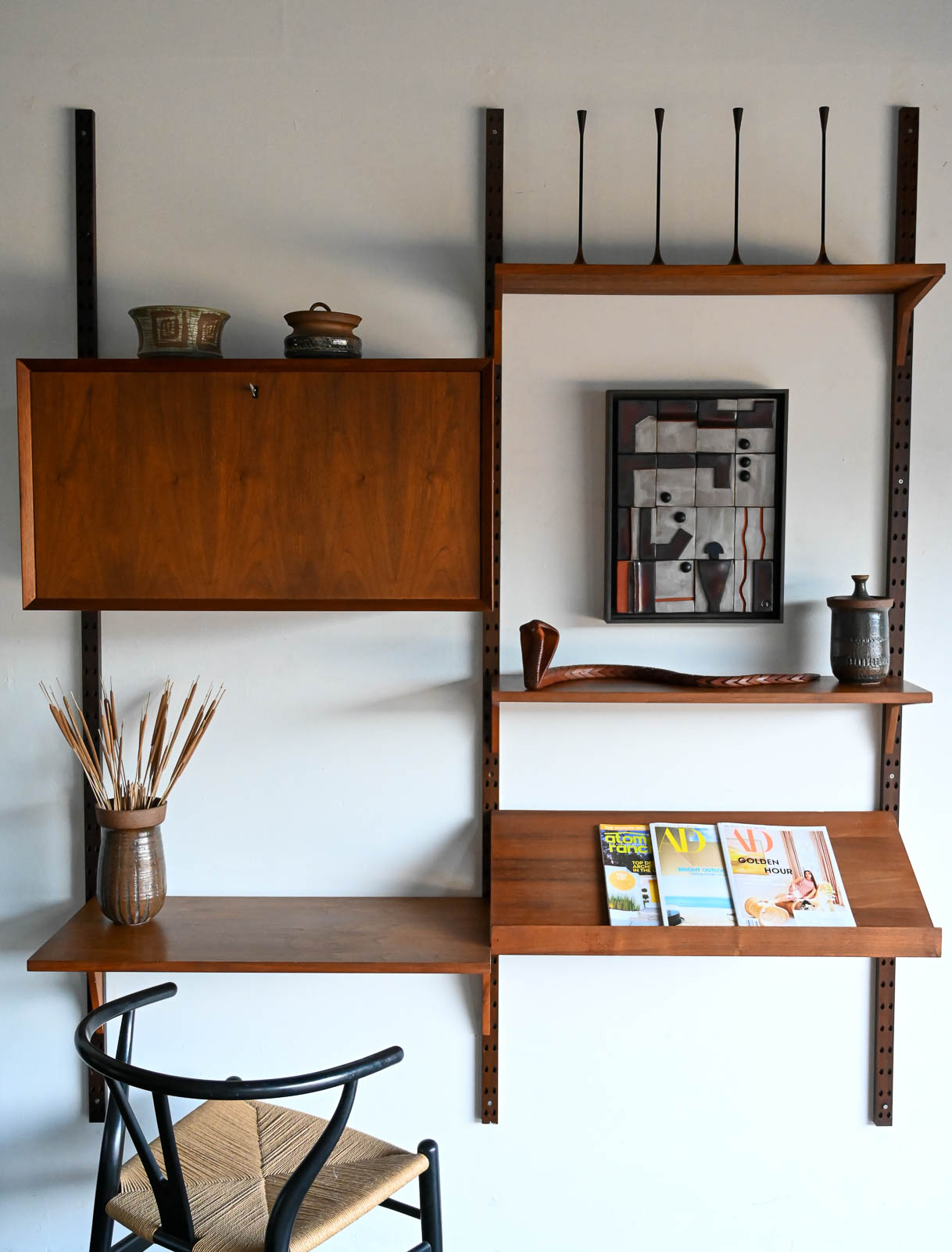 Walnut 2 Bay Wall Unit by Poul Cadovius, ca. 1960. Beautiful design and in 8/10 condition, this wall unit is easy to assemble and includes all shown here (except accessories and chair). Upper cabinet includes original key and drawers, desk drawer, magazine holder and 3 shelves and wall mounting brackets. (Hardware not included). Fully adjustable and customizable, you can configure each shelf or box any way you like with the adjustable poles. Measures as shown 64″ W x 80″ H x 16″ D.