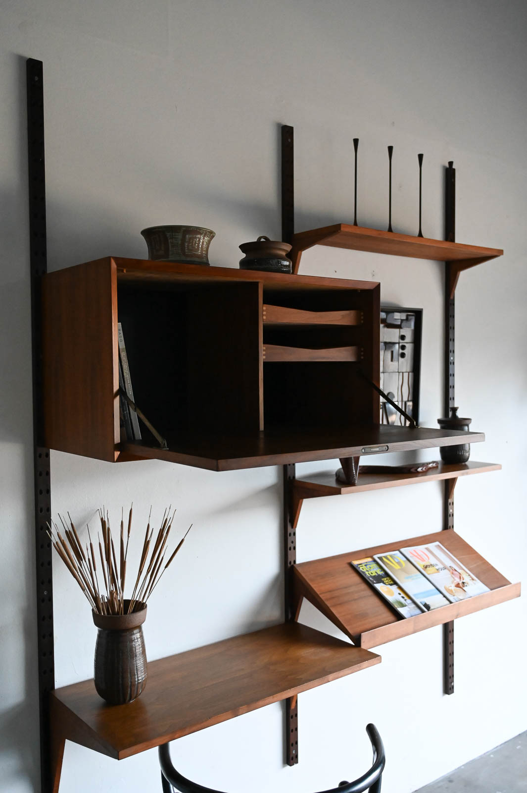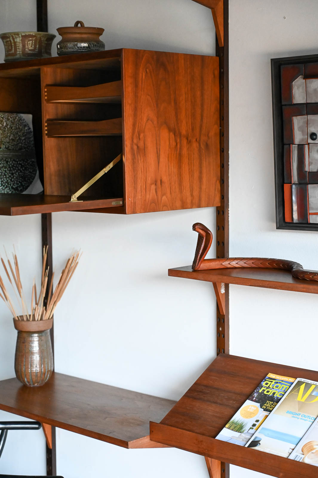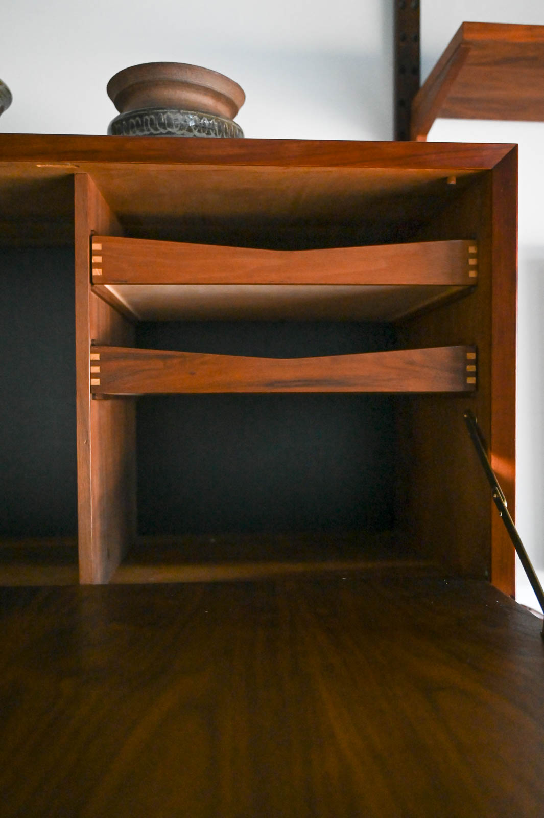 Walnut 2 Bay Wall Unit by Poul Cadovius, ca. 1960. Beautiful design and in 8/10 condition, this wall unit is easy to assemble and includes all shown here (except accessories and chair). Upper cabinet includes original key and drawers, desk drawer, magazine holder and 3 shelves and wall mounting brackets. (Hardware not included). Fully adjustable and customizable, you can configure each shelf or box any way you like with the adjustable poles. Measures as shown 64″ W x 80″ H x 16″ D.