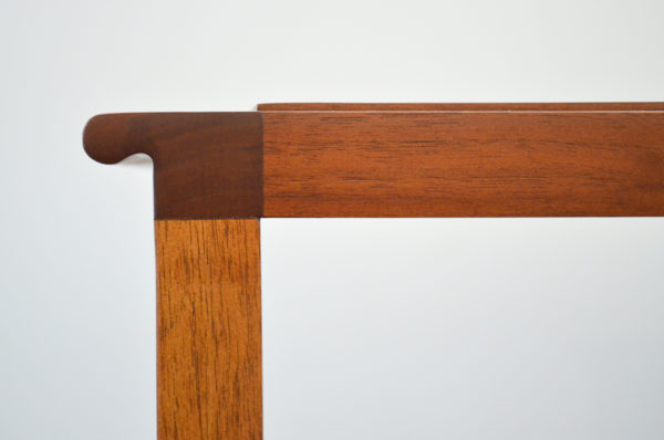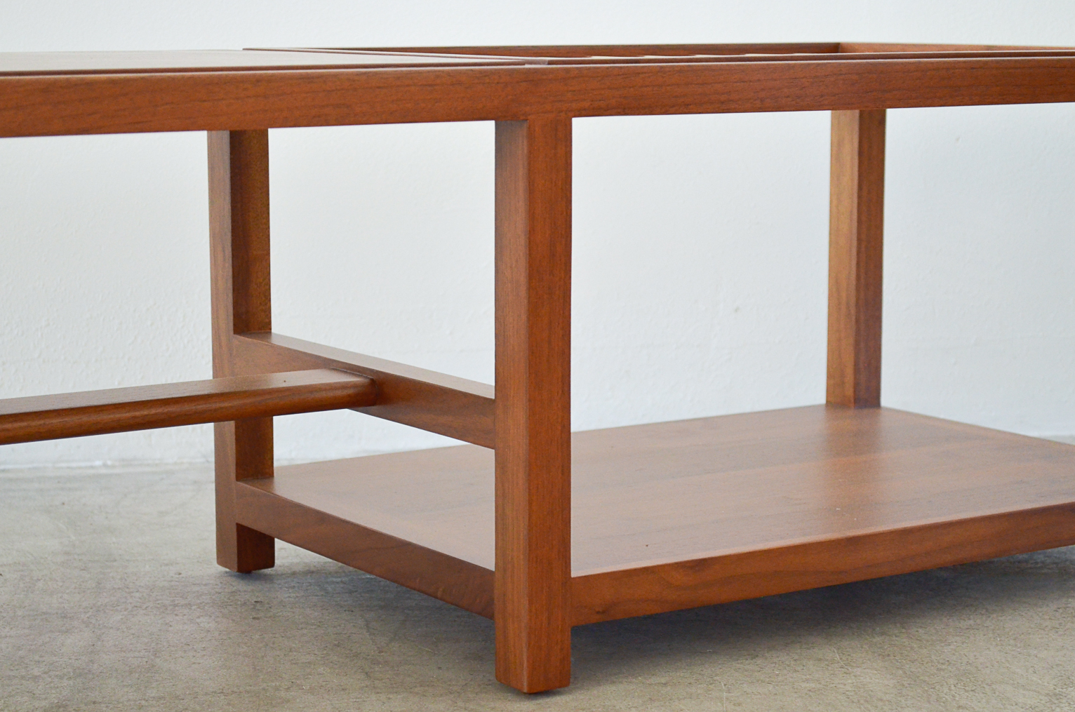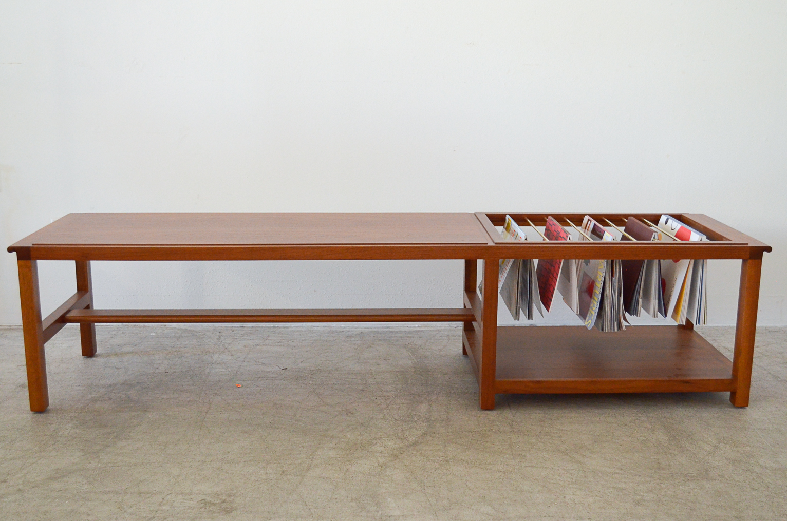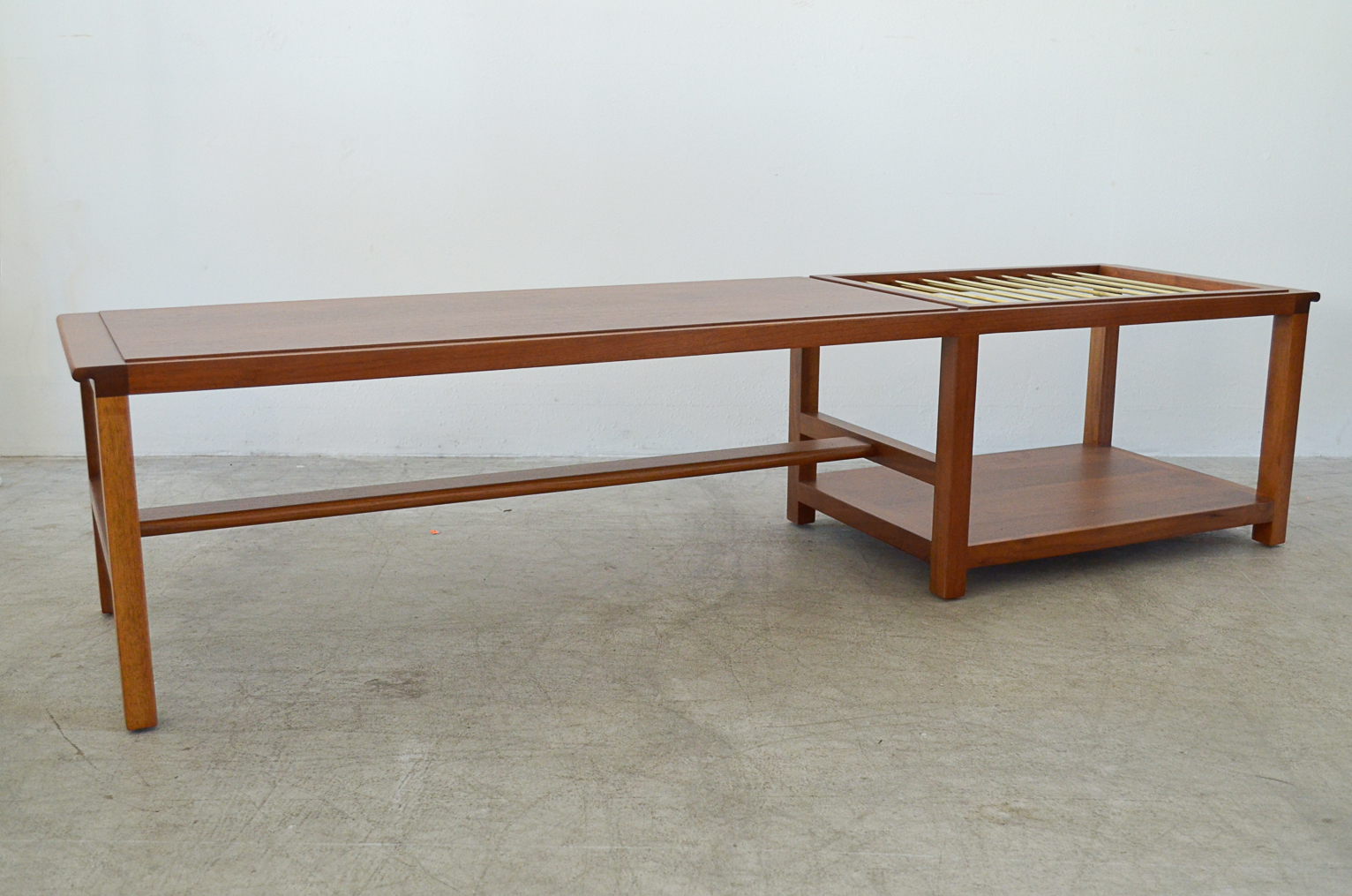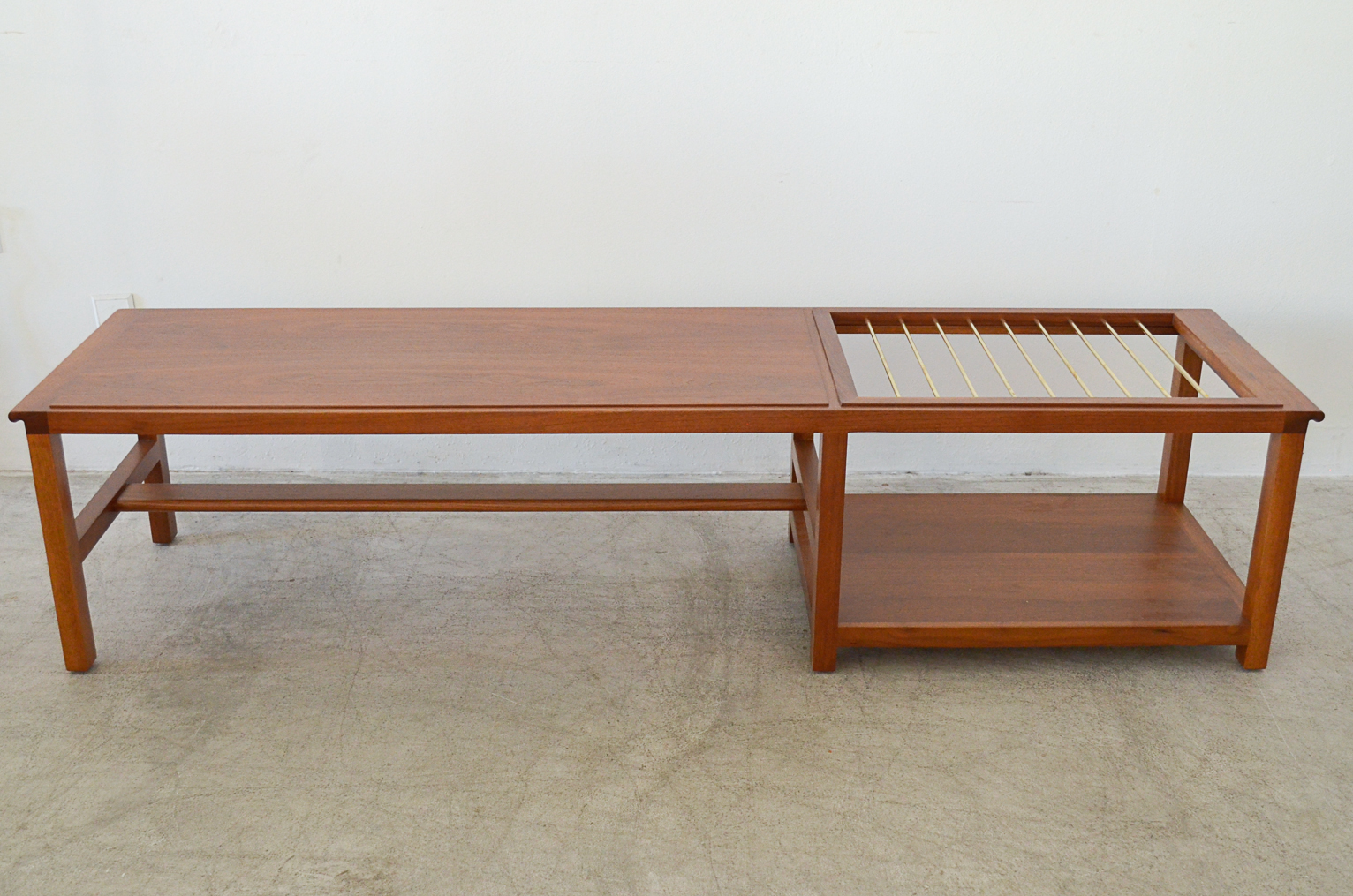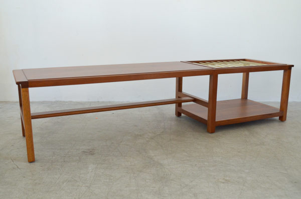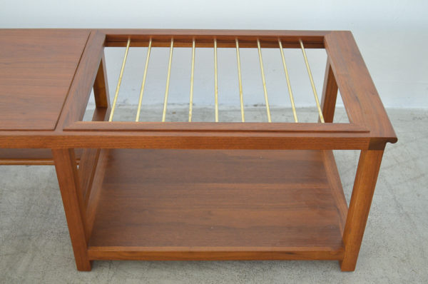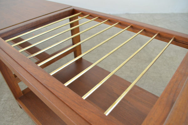 Edward Wormley for Dunbar walnut and brass magazine holder coffee table with lower shelf and brass accent detail. Top has some slight wear, no deep scratches or chips. Brass stretcher bars are free of rust. Model 5933. Stamped on underside. Measures: 66″ L x 17″ W x 15″ H.